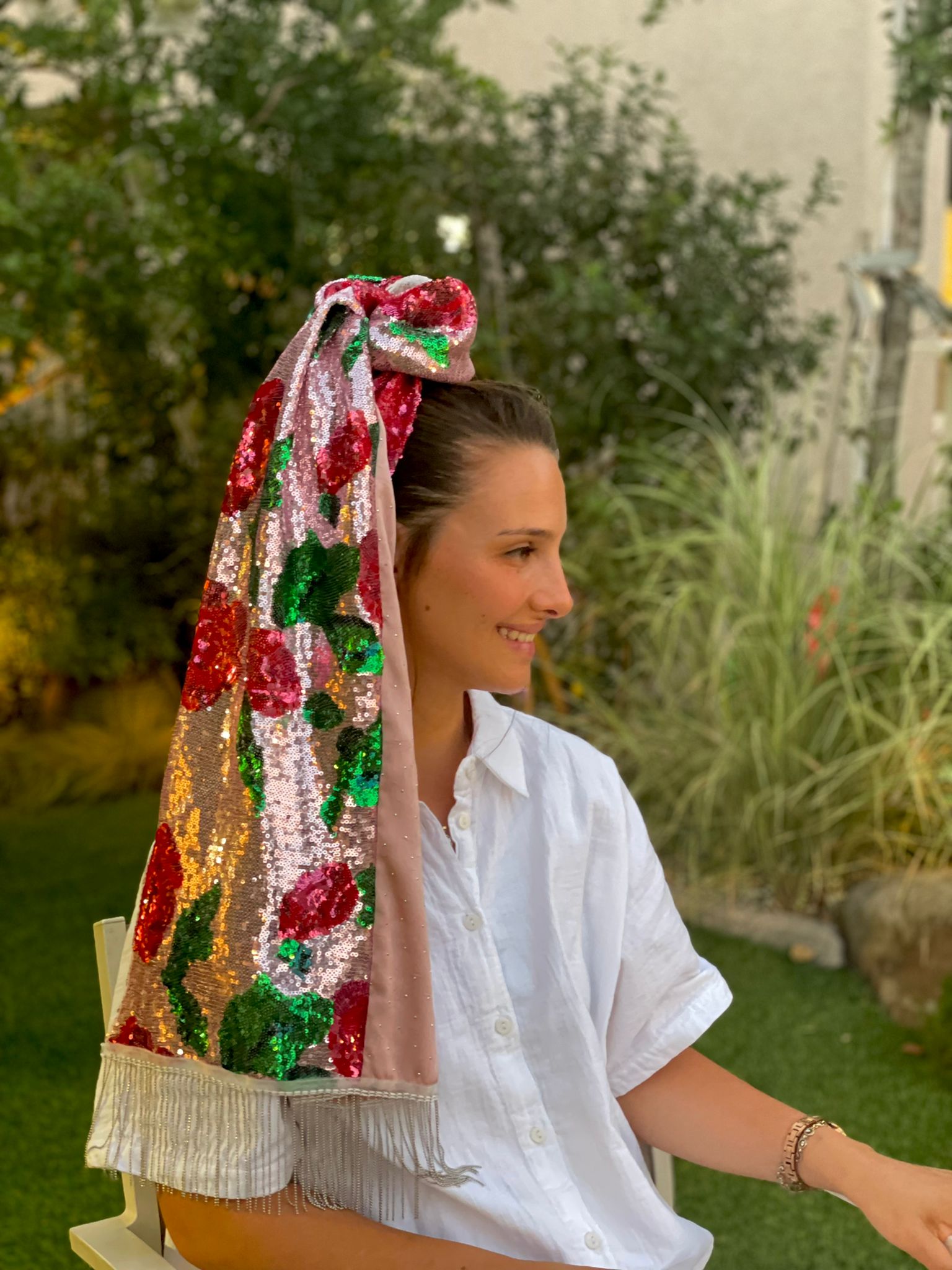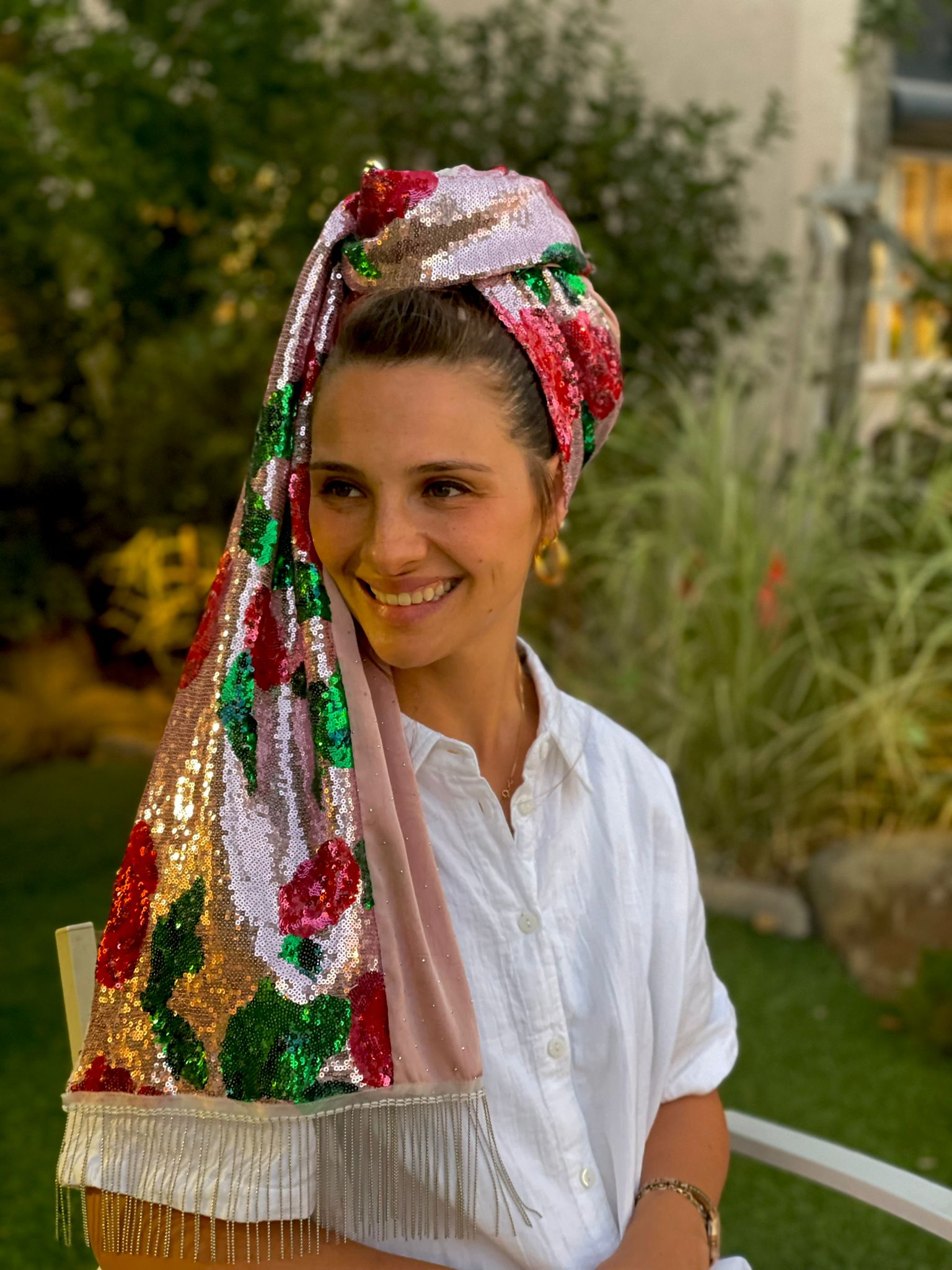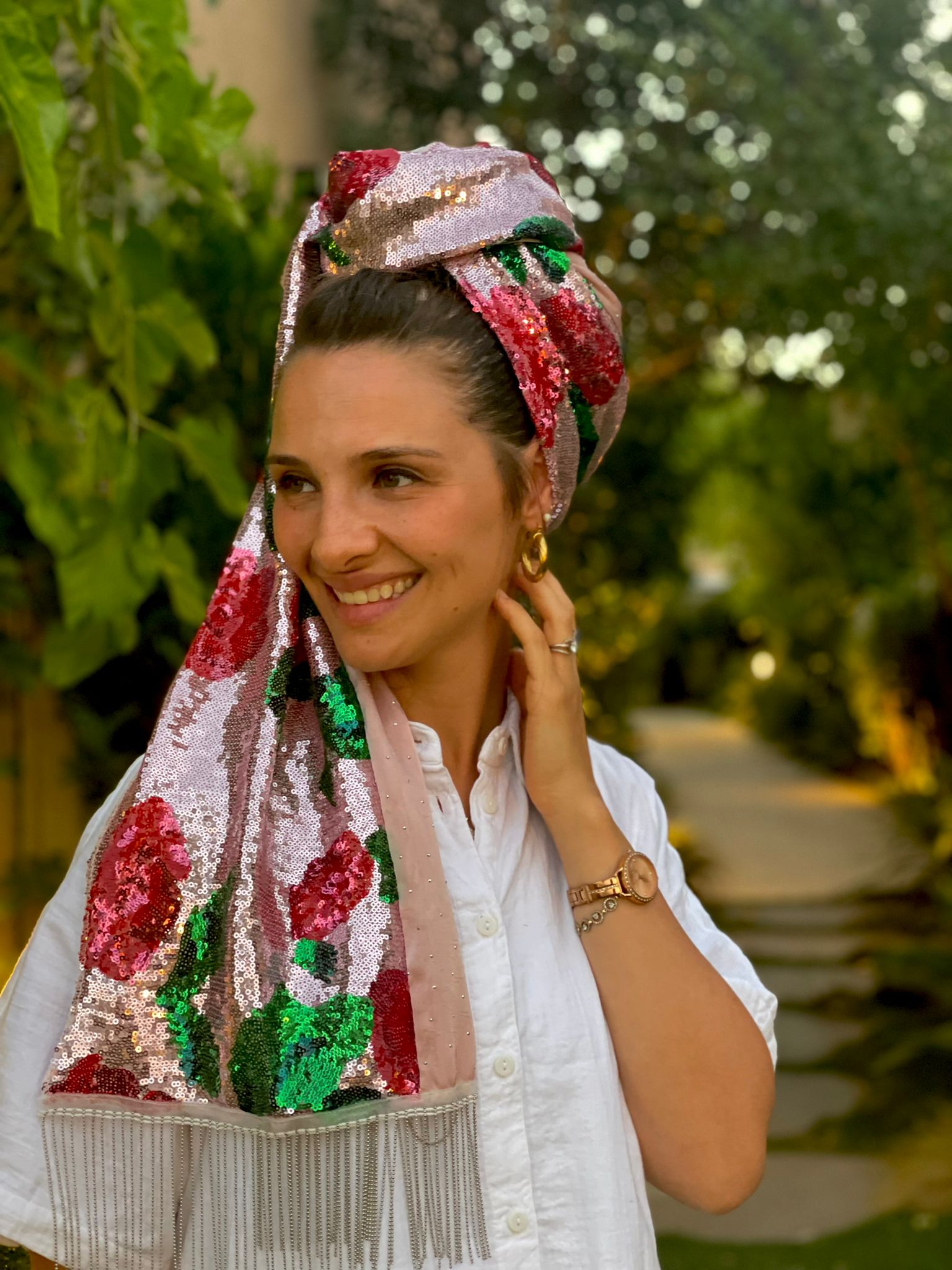 מטפחת פייטים ורודה עם פרחים אדומים ועלים ירוקים בשילוב בד סטן ורוד בשילוב אבנים כסופות. בשילוב פרנז שרשרת כסף