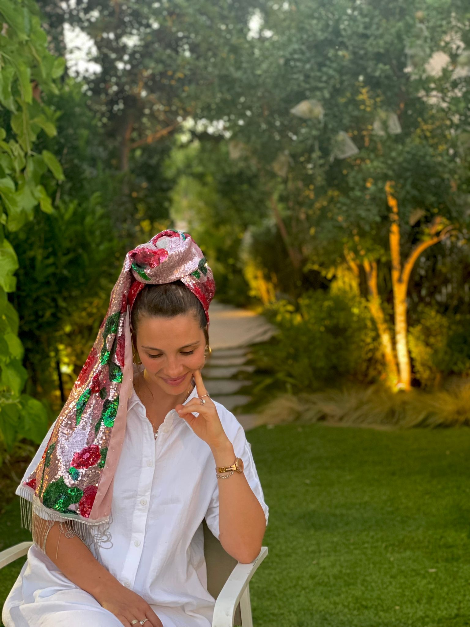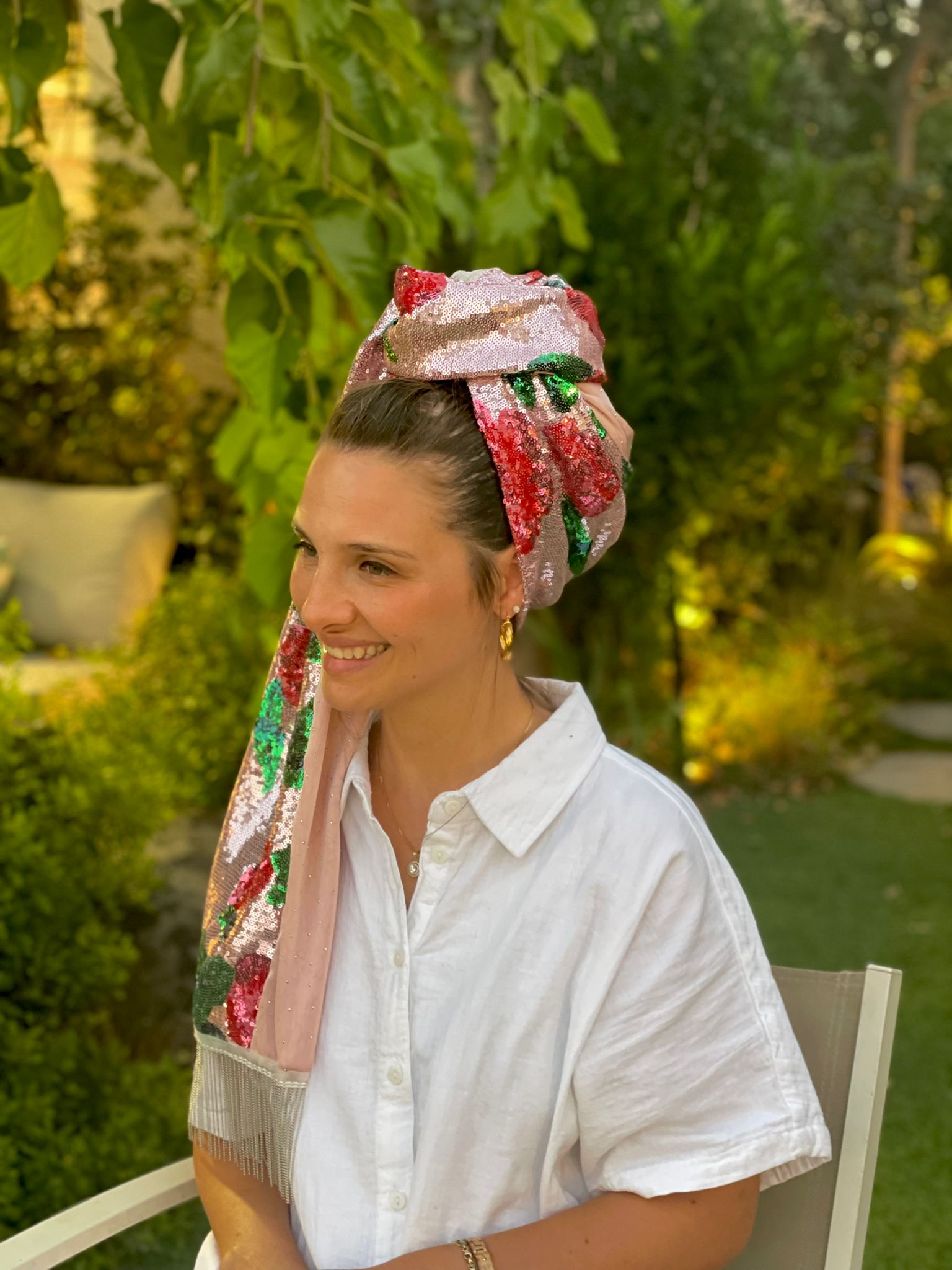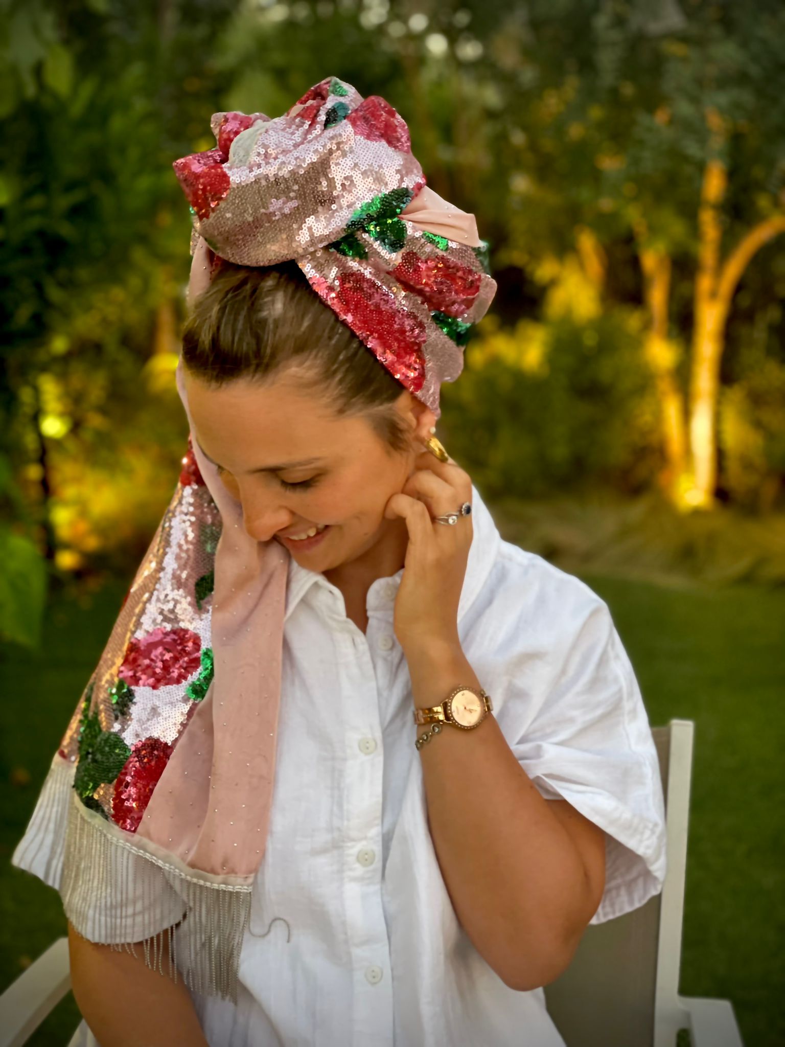 מטפחת פייטים ורודה עם פרחים אדומים ועלים ירוקים בשילוב בד סטן ורוד בשילוב אבנים כסופות. בשילוב פרנז שרשרת כסף