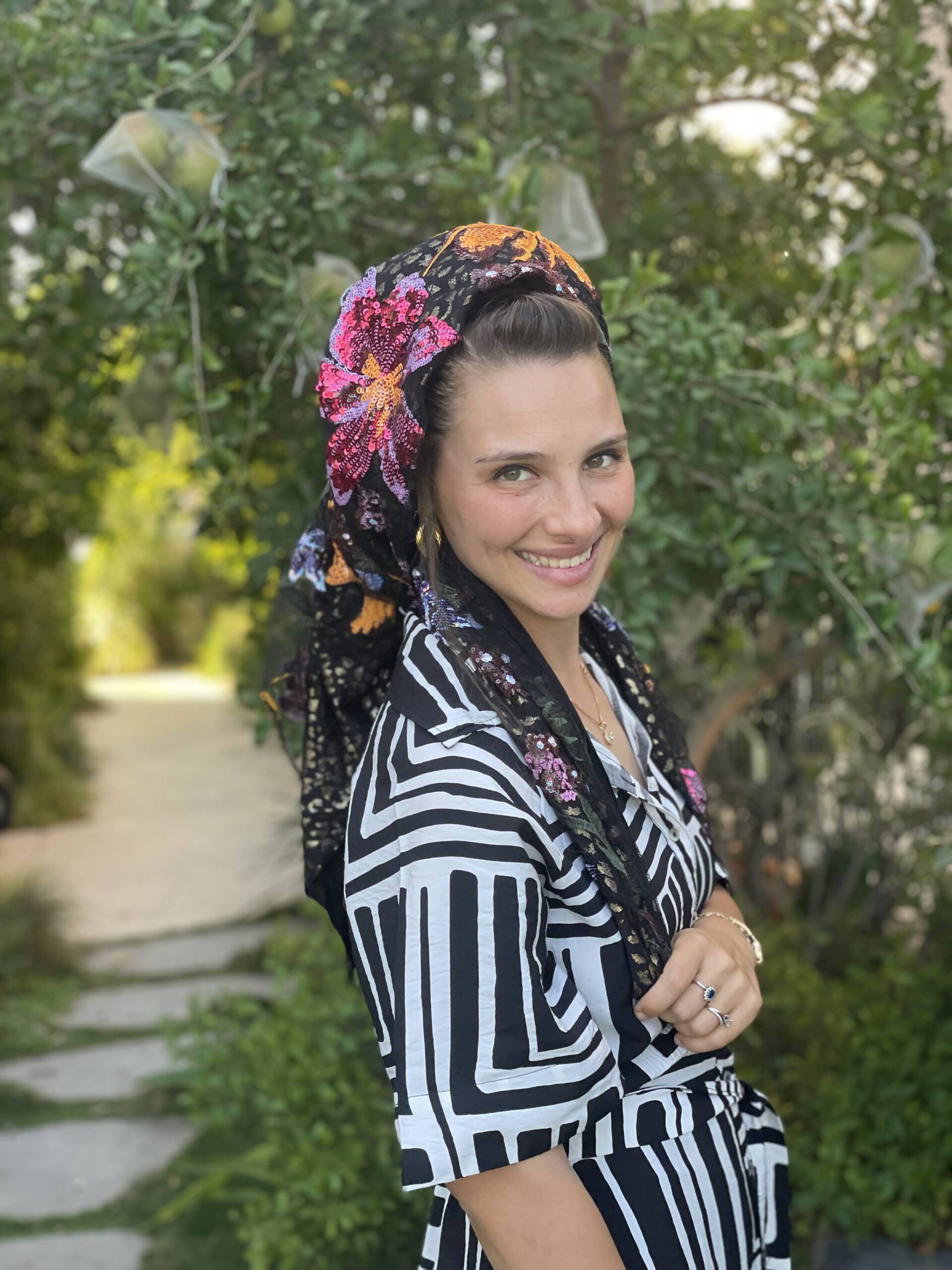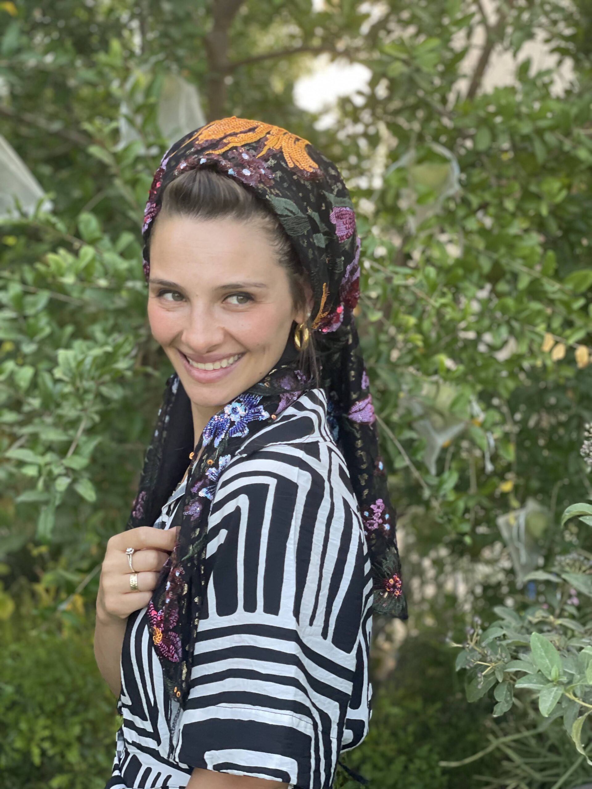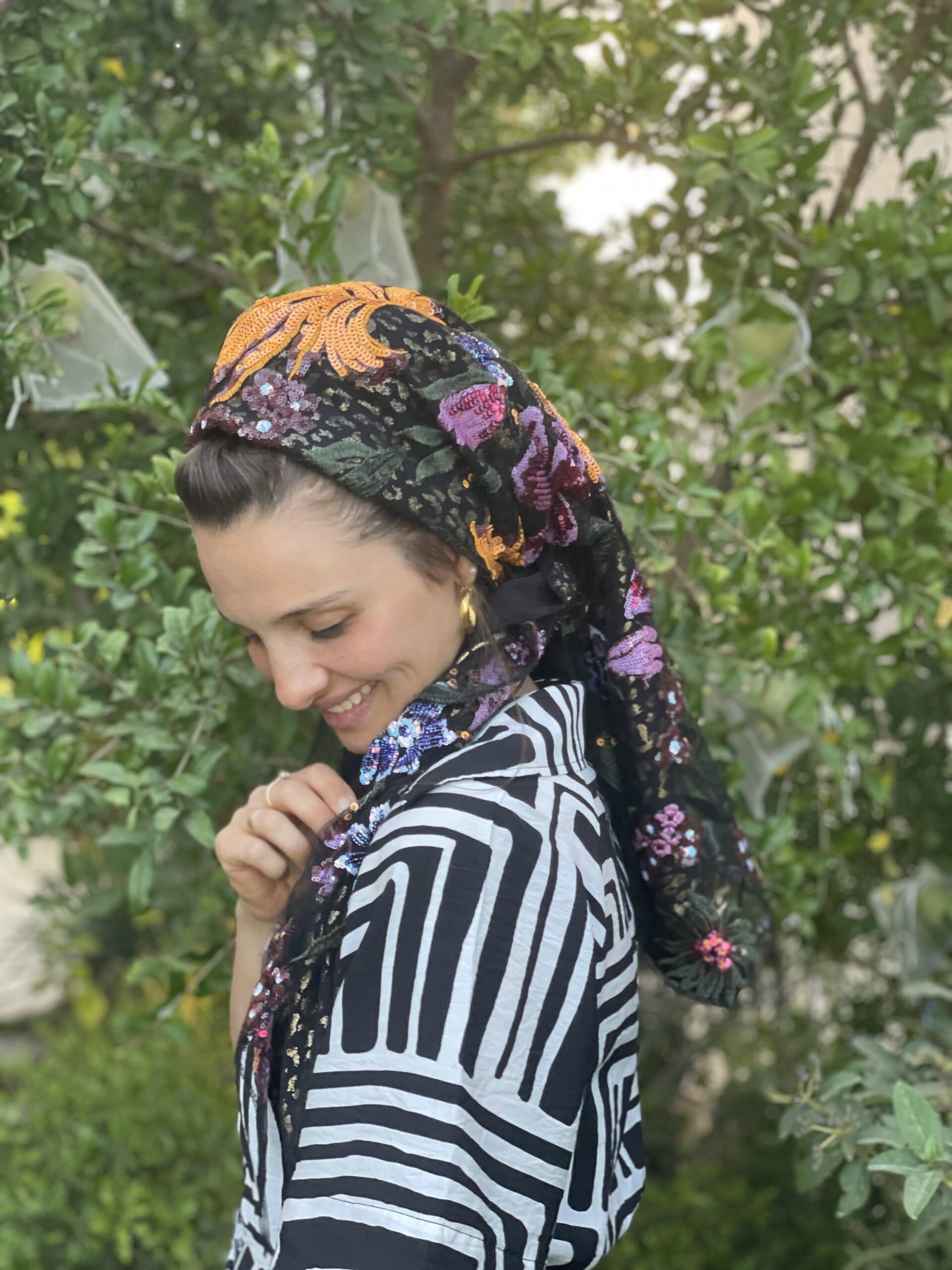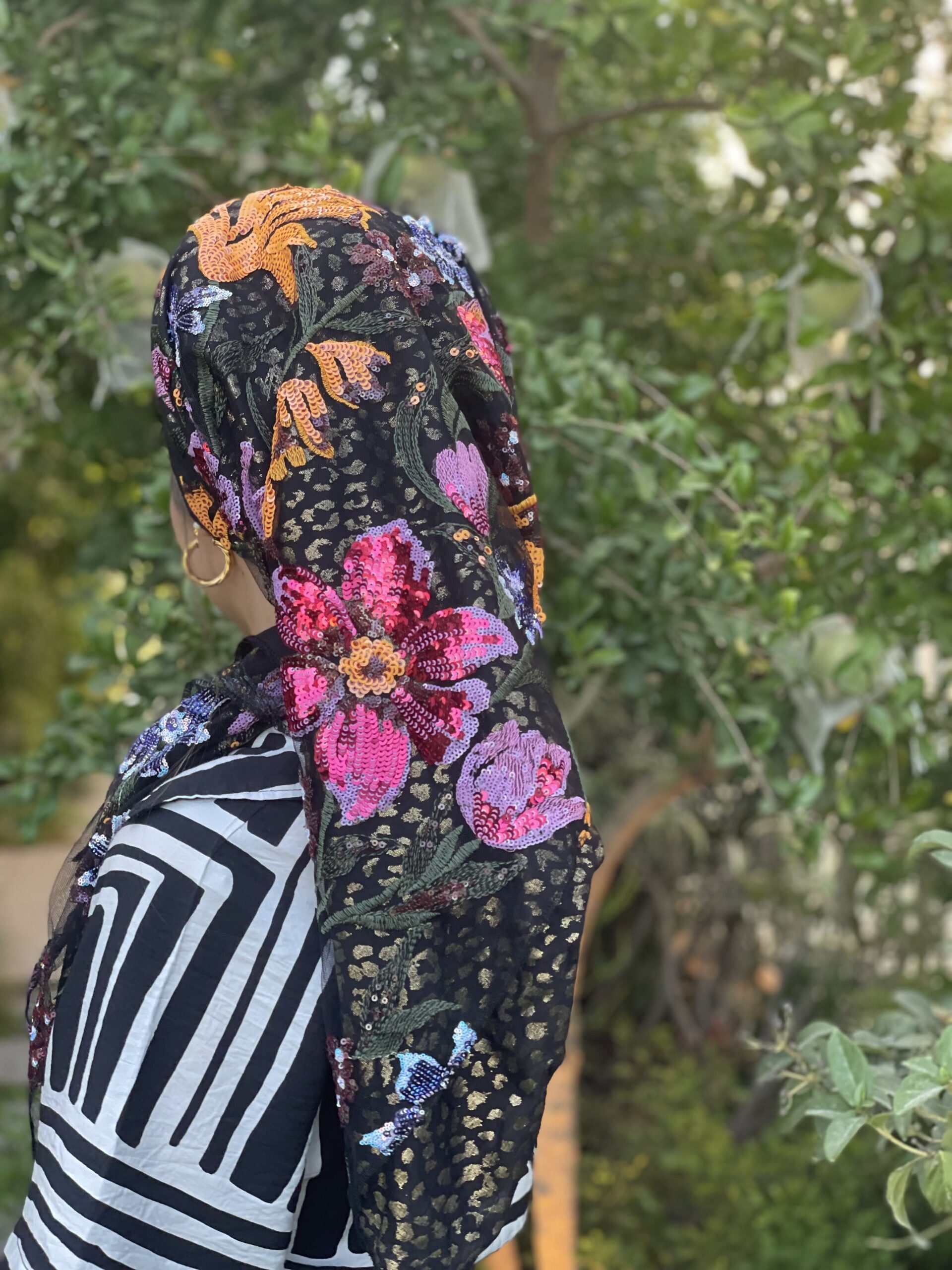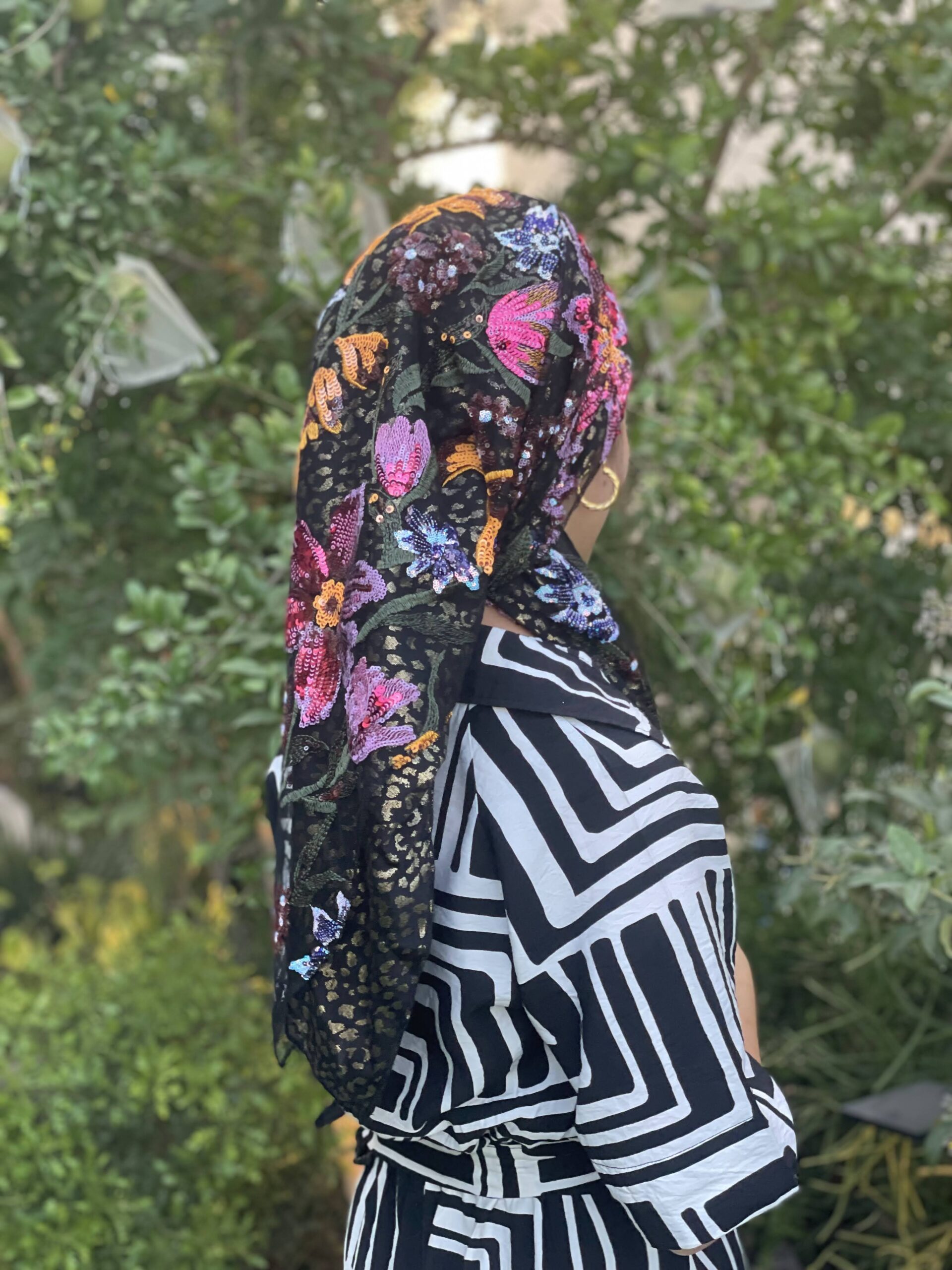 מטפחת משולשת משולבת פרחי פייטים על בד רשת ובסיס מנומר שחור זהב.