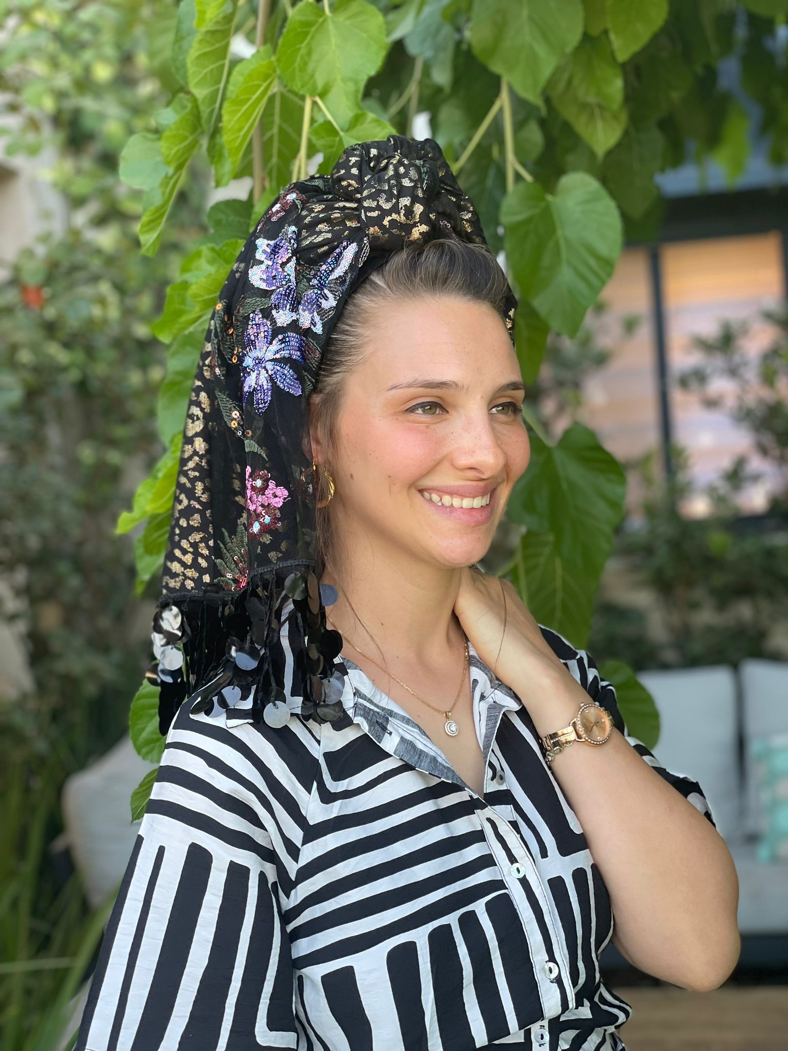 מטפחת פייטים שחורה עם פרחים בתכלת, סגול ועוד בשילוב בד מנומר שחור זהב. ניתן להשיג בשילוב פרנז פייט עגול שחור או בשילוב פייט שרשרת זהב. (נא לציין בהערות בהזמנה את הפרנזים המועדפים)