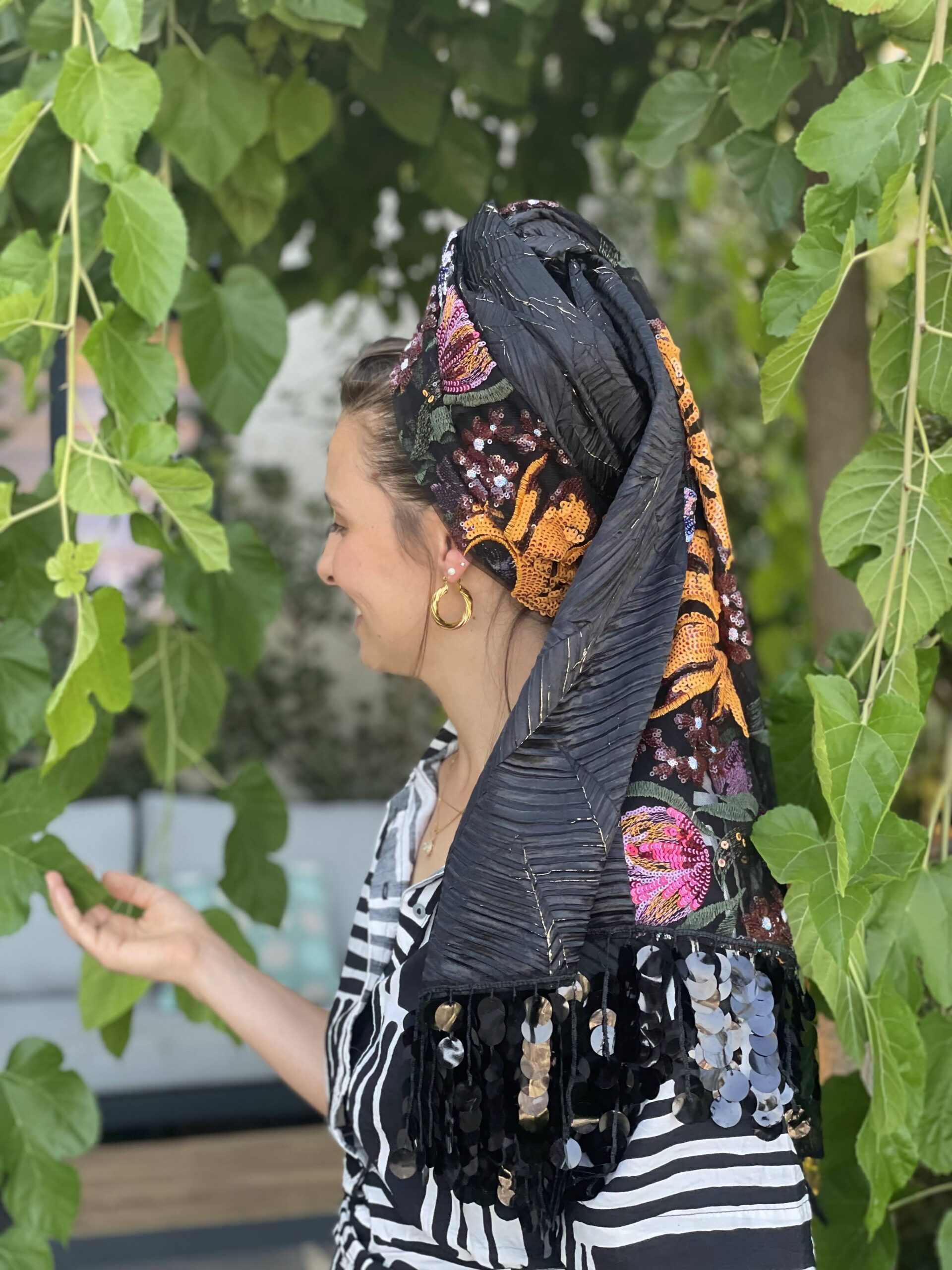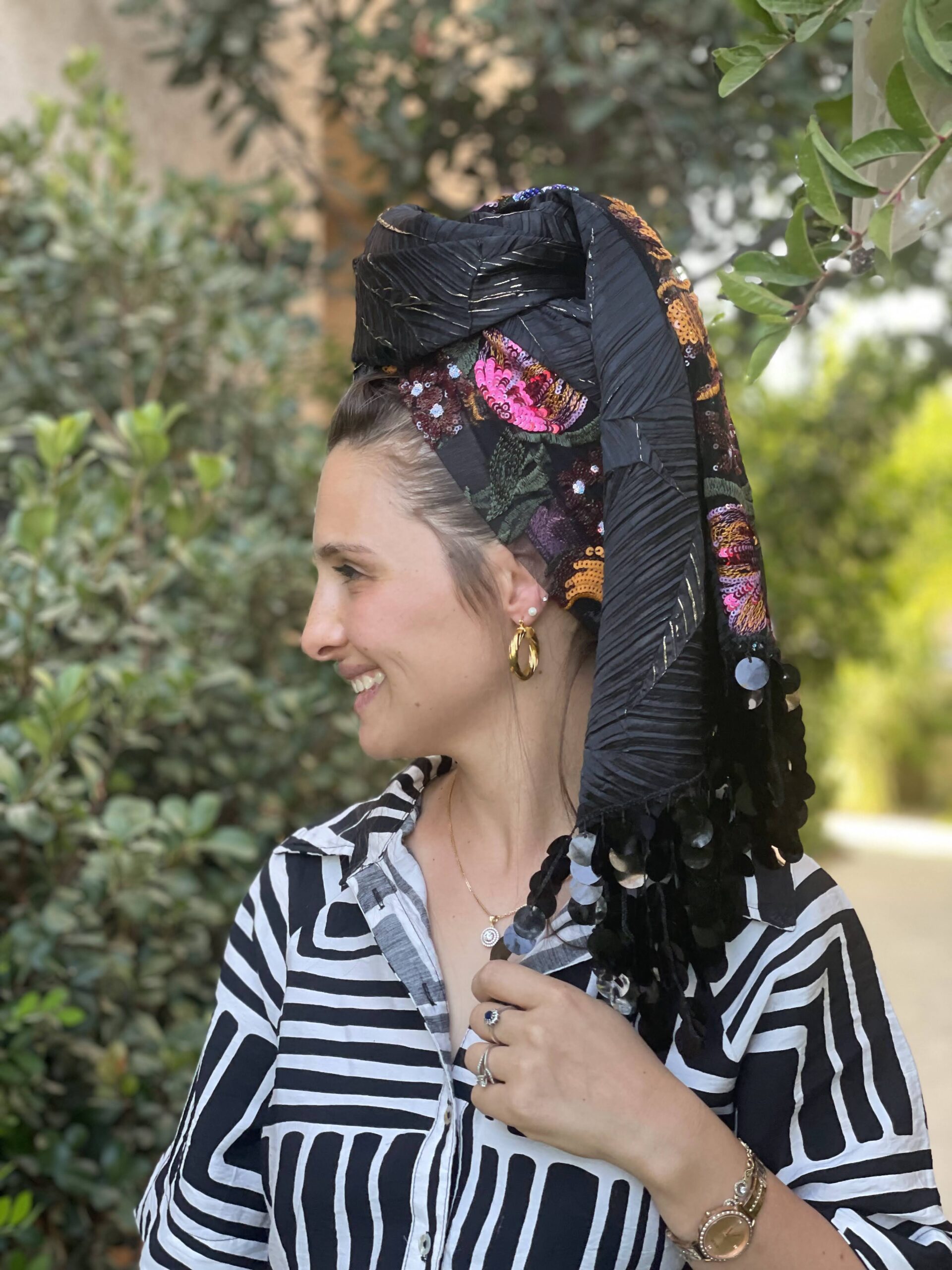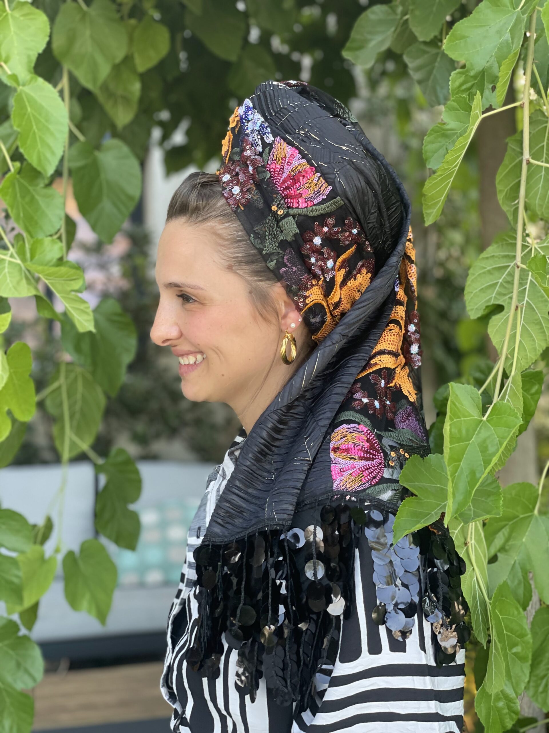 מטפחת פייטים שחורה עם פרחים בצבעים שונים ורודים כתומים, צהובים, תכלת, סגול ועוד בשילוב בד מקומט עם נגיעות זהב. בשילוב פרנז פייט עגול שחור.