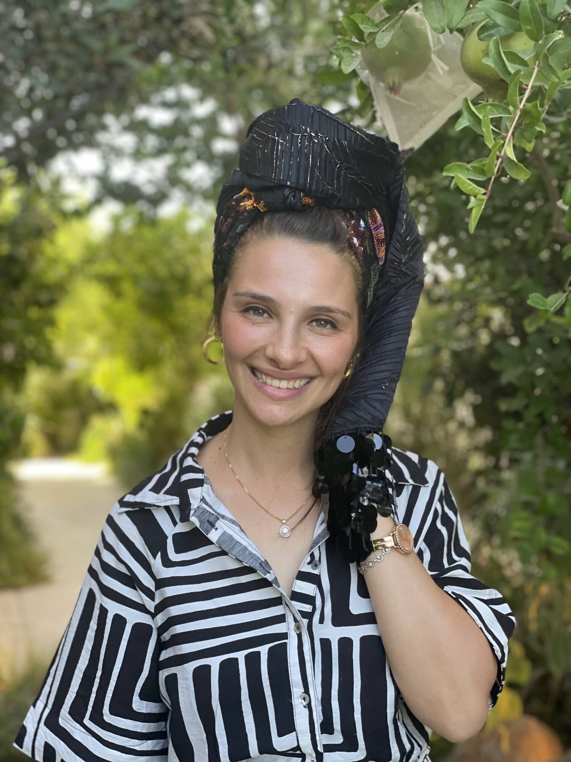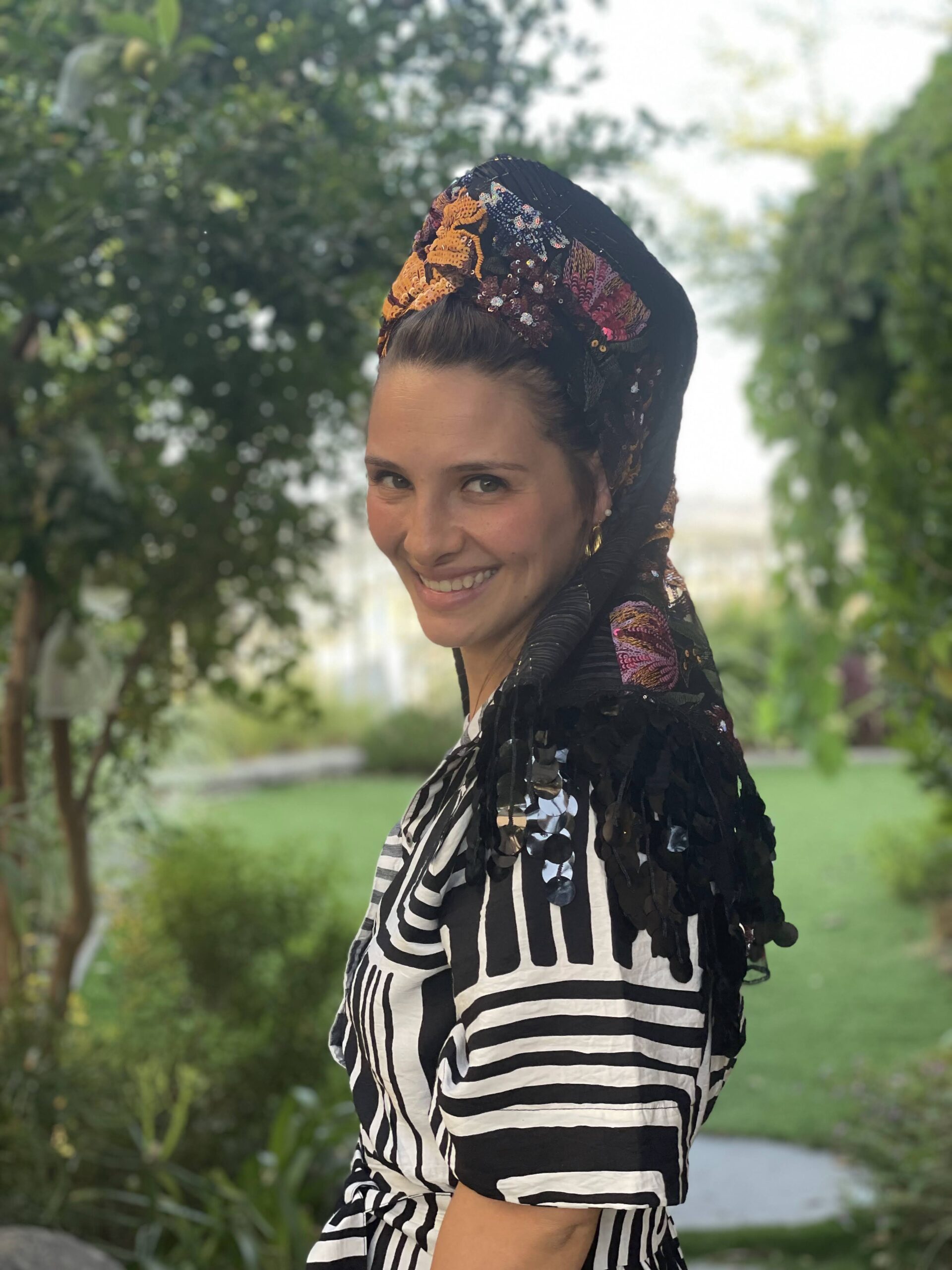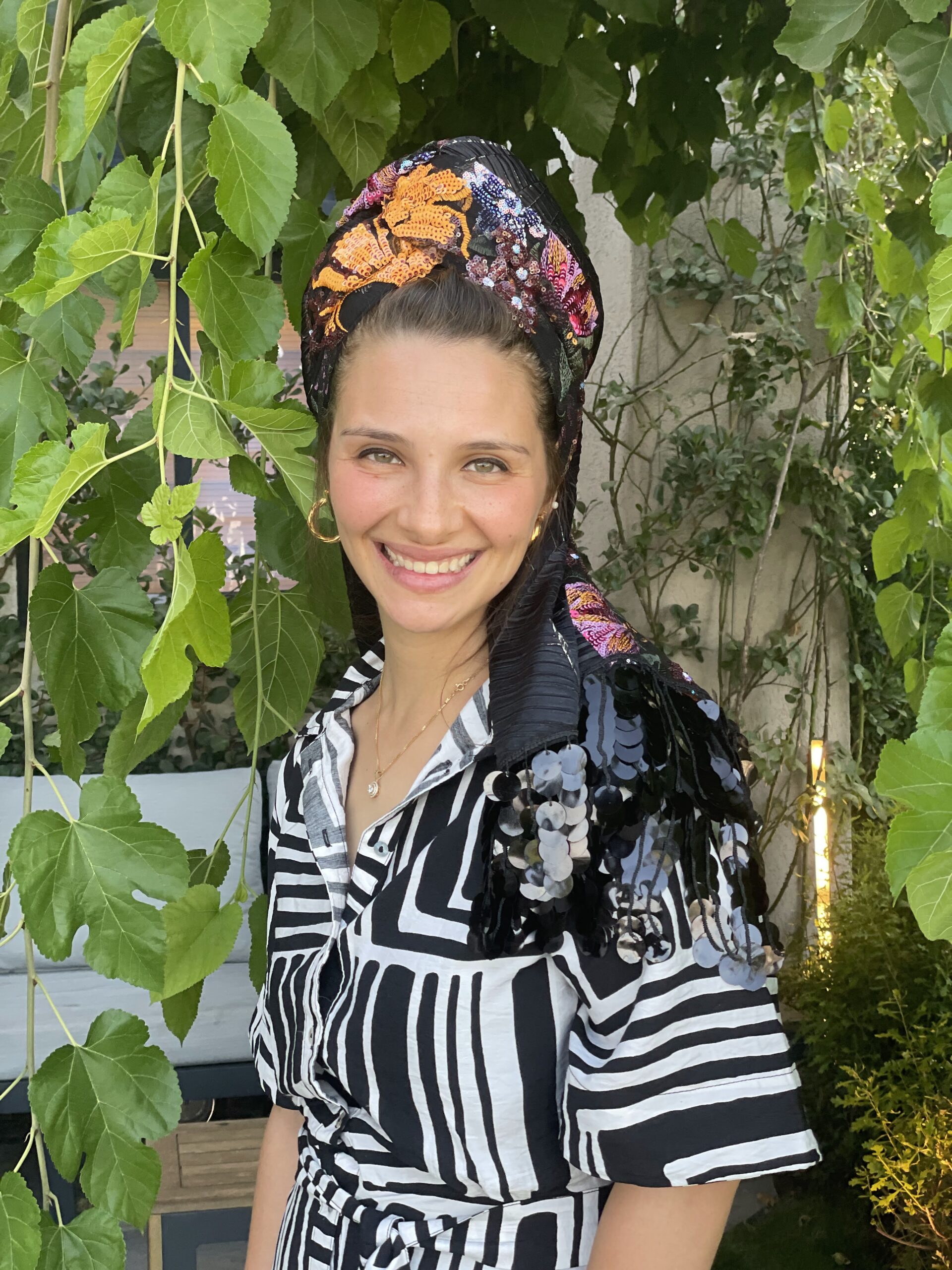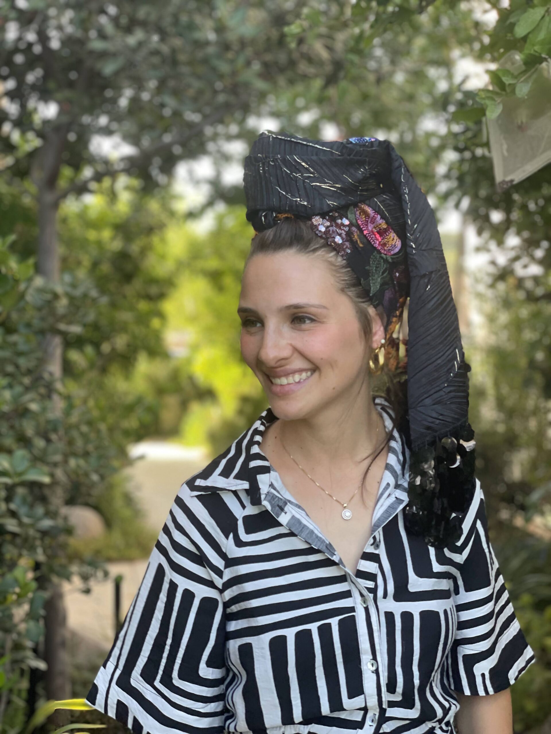 מטפחת פייטים שחורה עם פרחים בצבעים שונים ורודים כתומים, צהובים, תכלת, סגול ועוד בשילוב בד מקומט עם נגיעות זהב. בשילוב פרנז פייט עגול שחור.