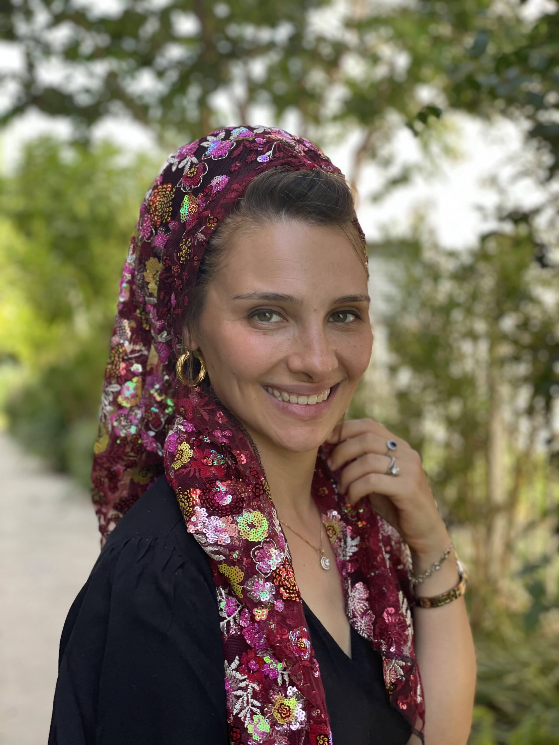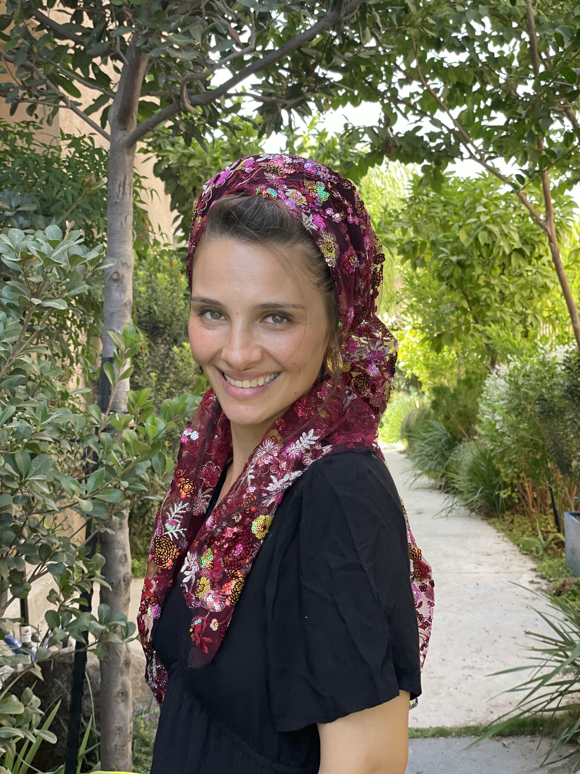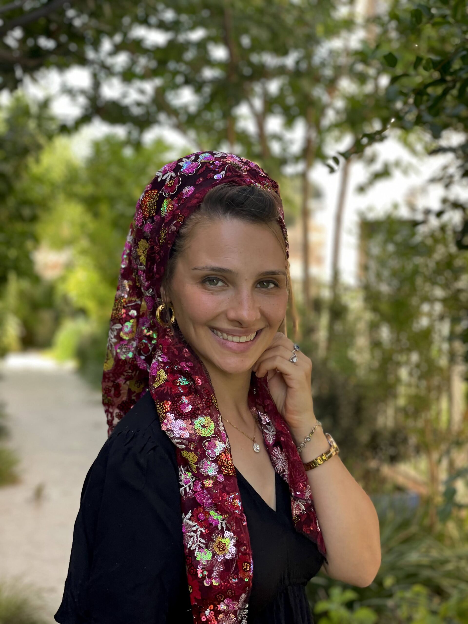 מטפחת פייטים עדינים בצבעי ורוד, צהוב, זהב וכרם על בד רשת בורדו עם בסיס בד קטיפה צרובה בצבע שחור.