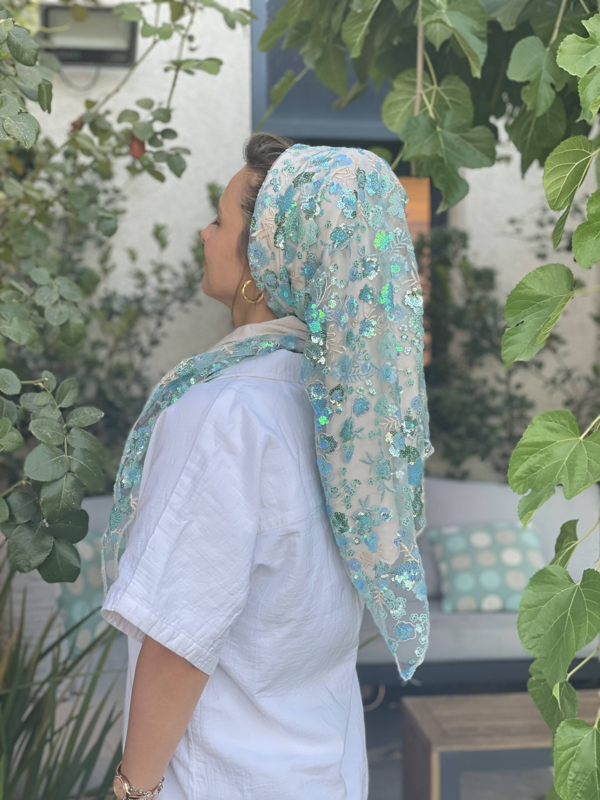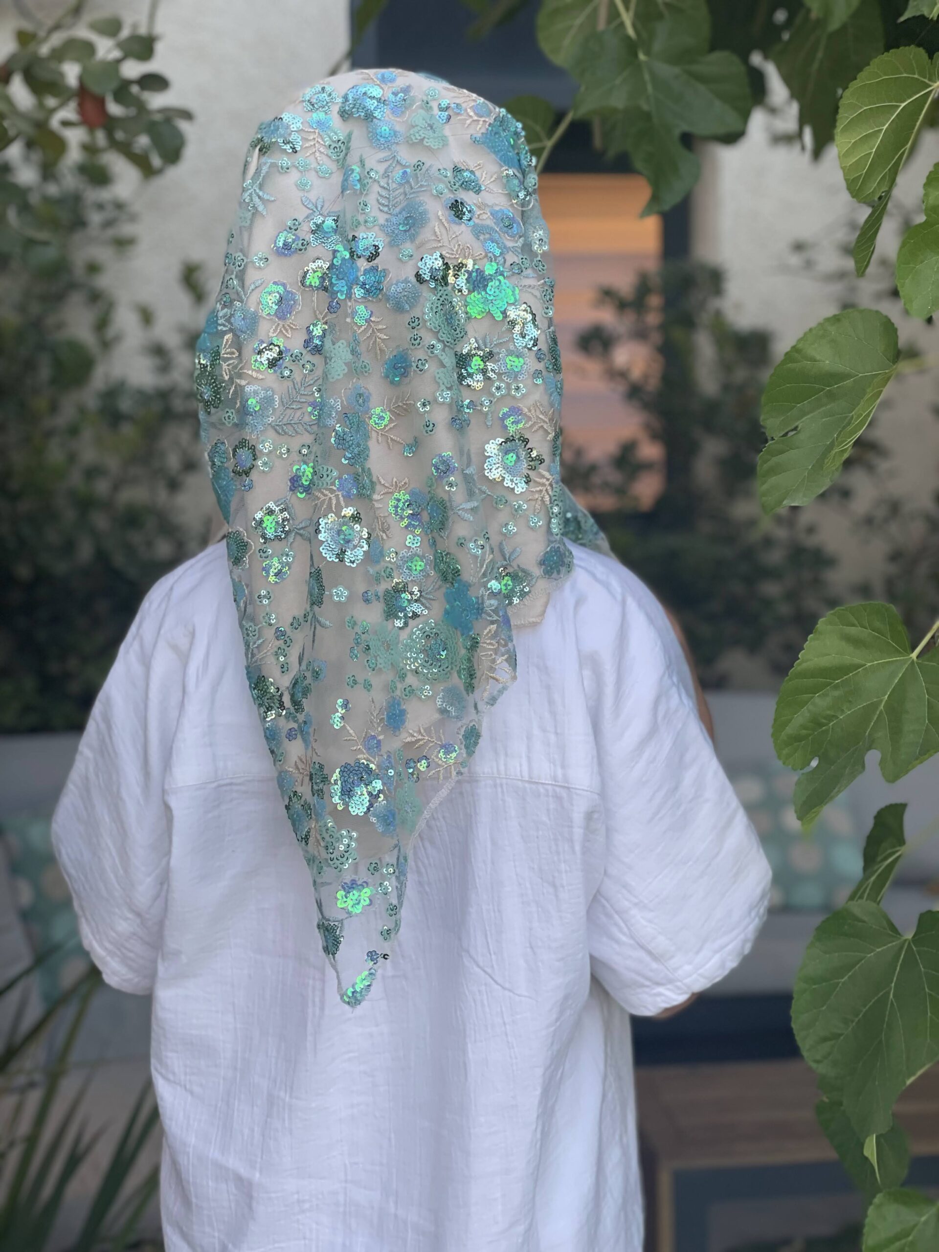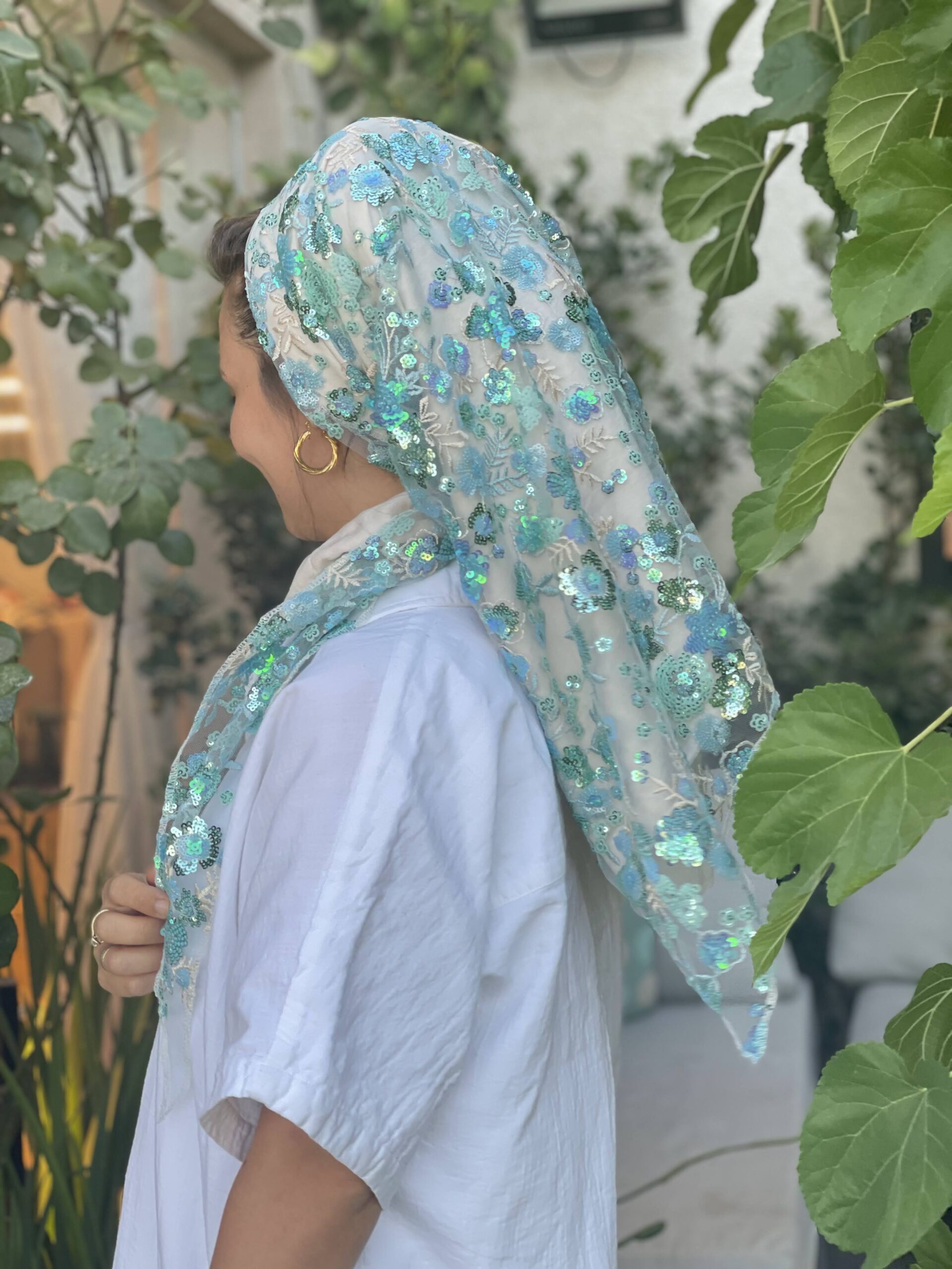 מטפחת פייטים עדינים בצבעי טורכיז כרם ולבן עם בסיס פשתן כרם.