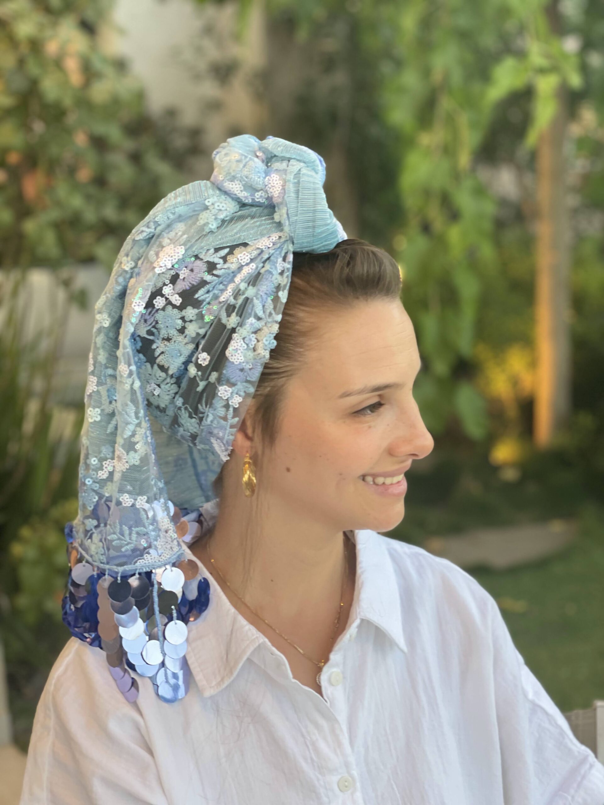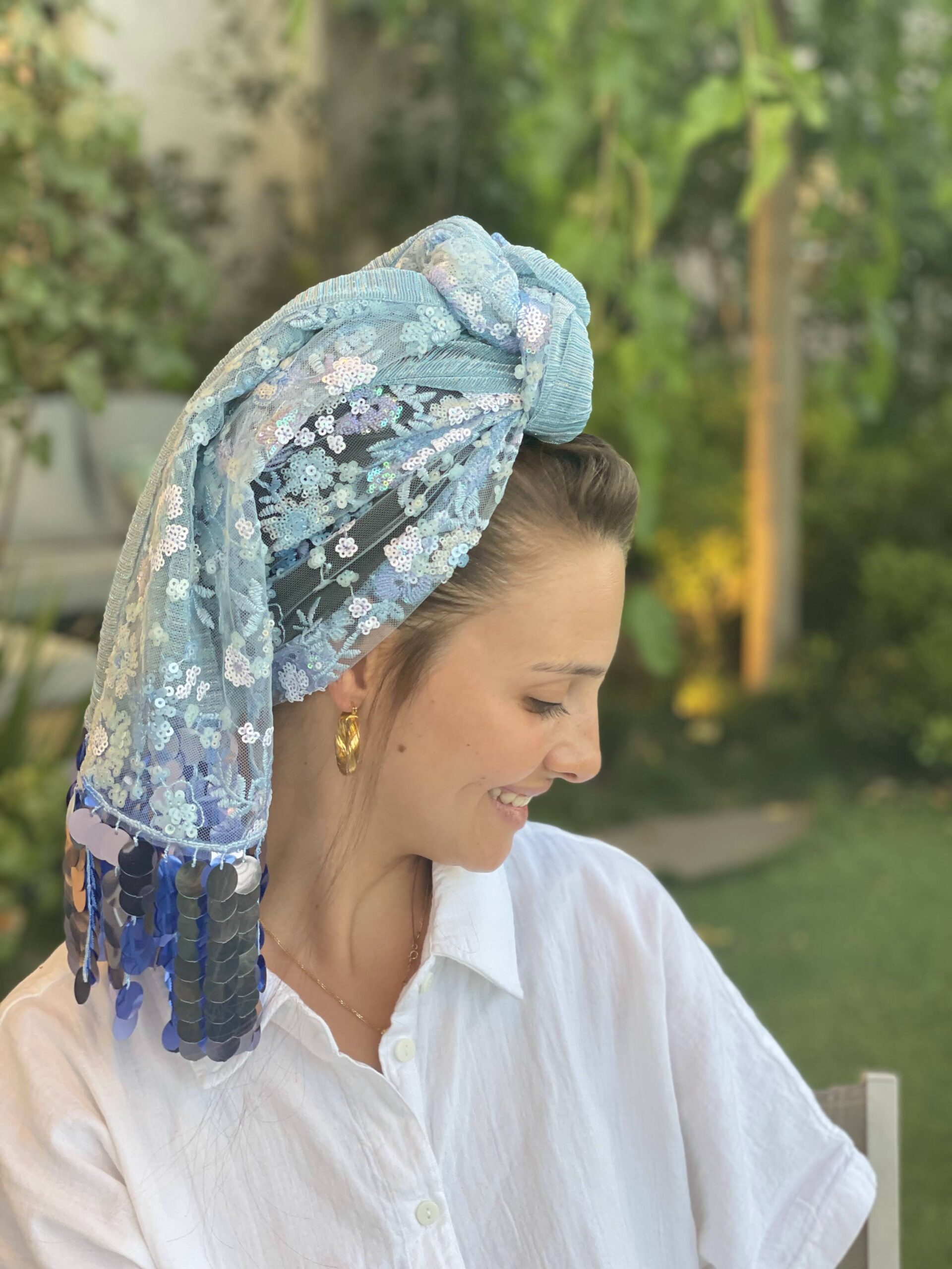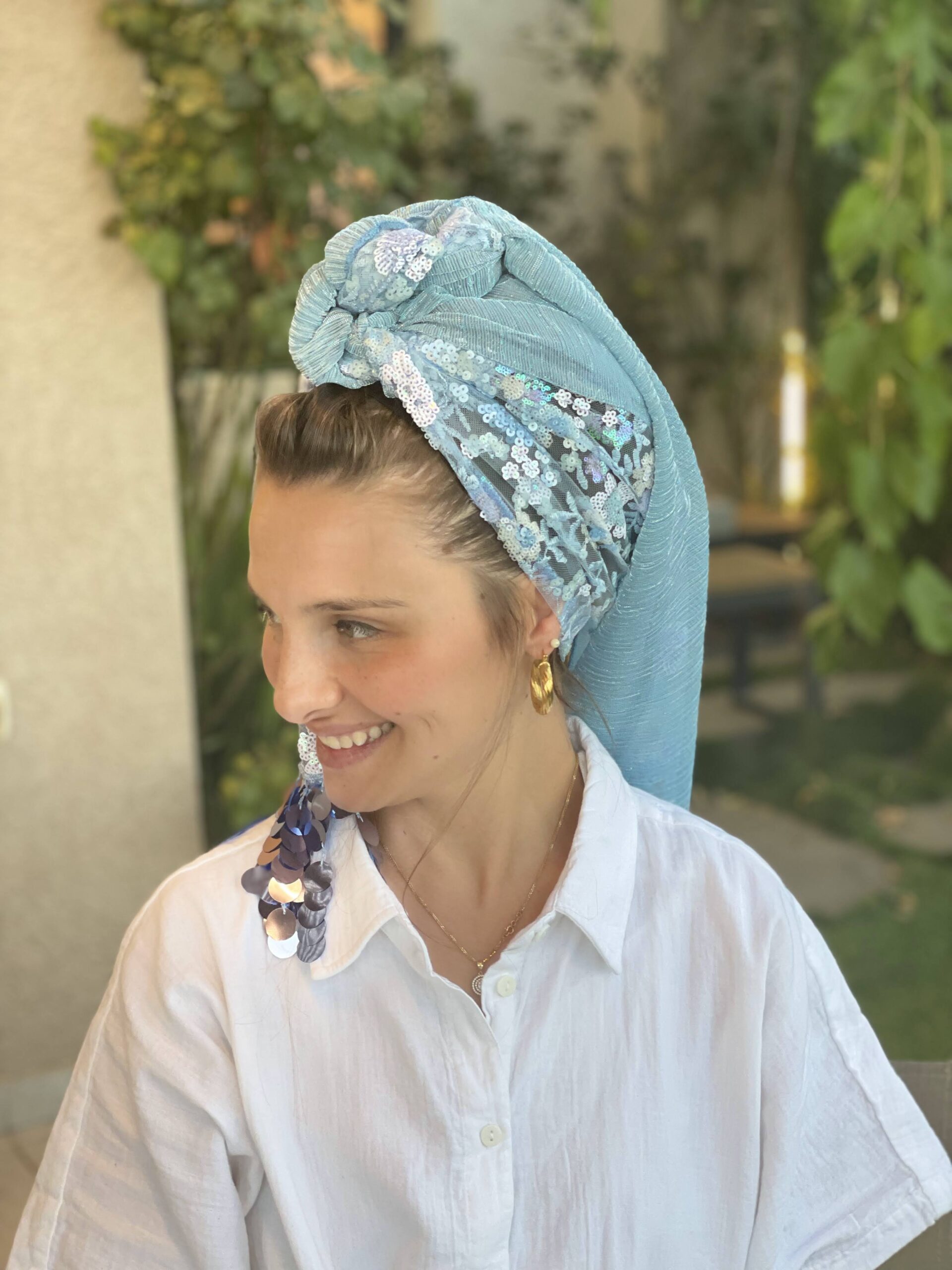 מטפחת פייטים תכלת עם פרחים קטנטנים בגווני תכלת ולבן, בשילוב בד פליסה תכלת. ופרנזים פייט עגול