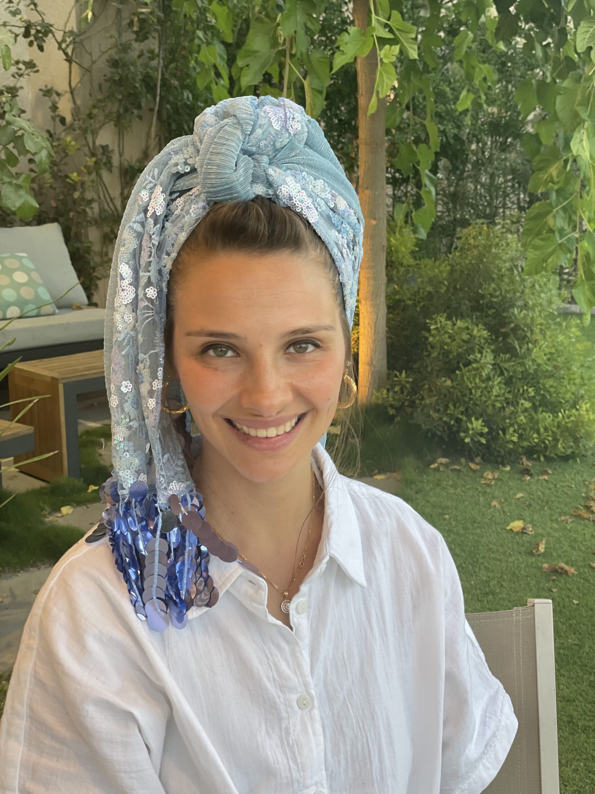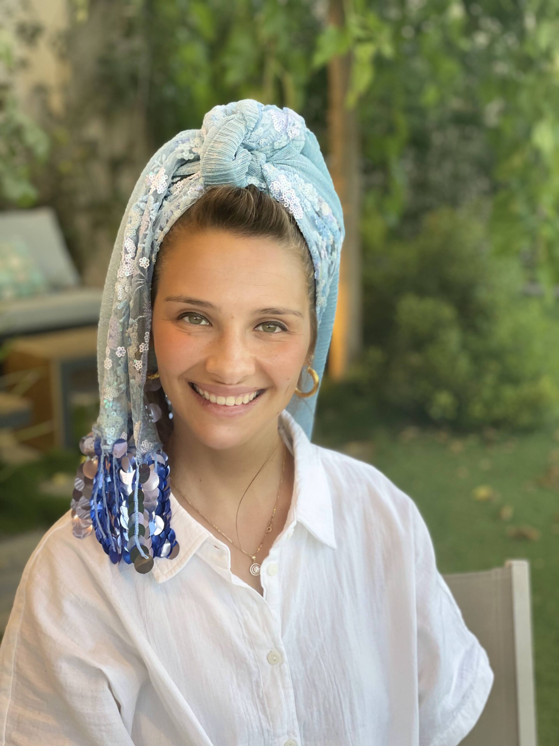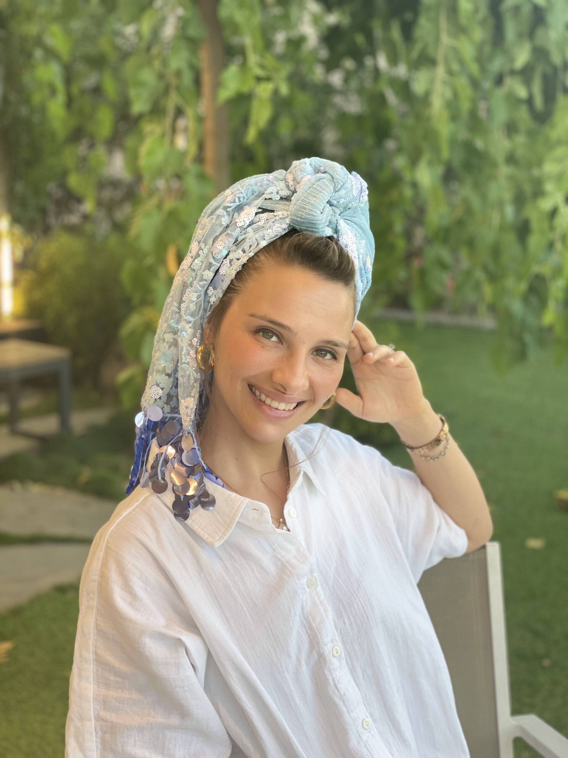מטפחת פייטים תכלת עם פרחים קטנטנים בגווני תכלת ולבן, בשילוב בד פליסה תכלת. ופרנזים פייט עגול