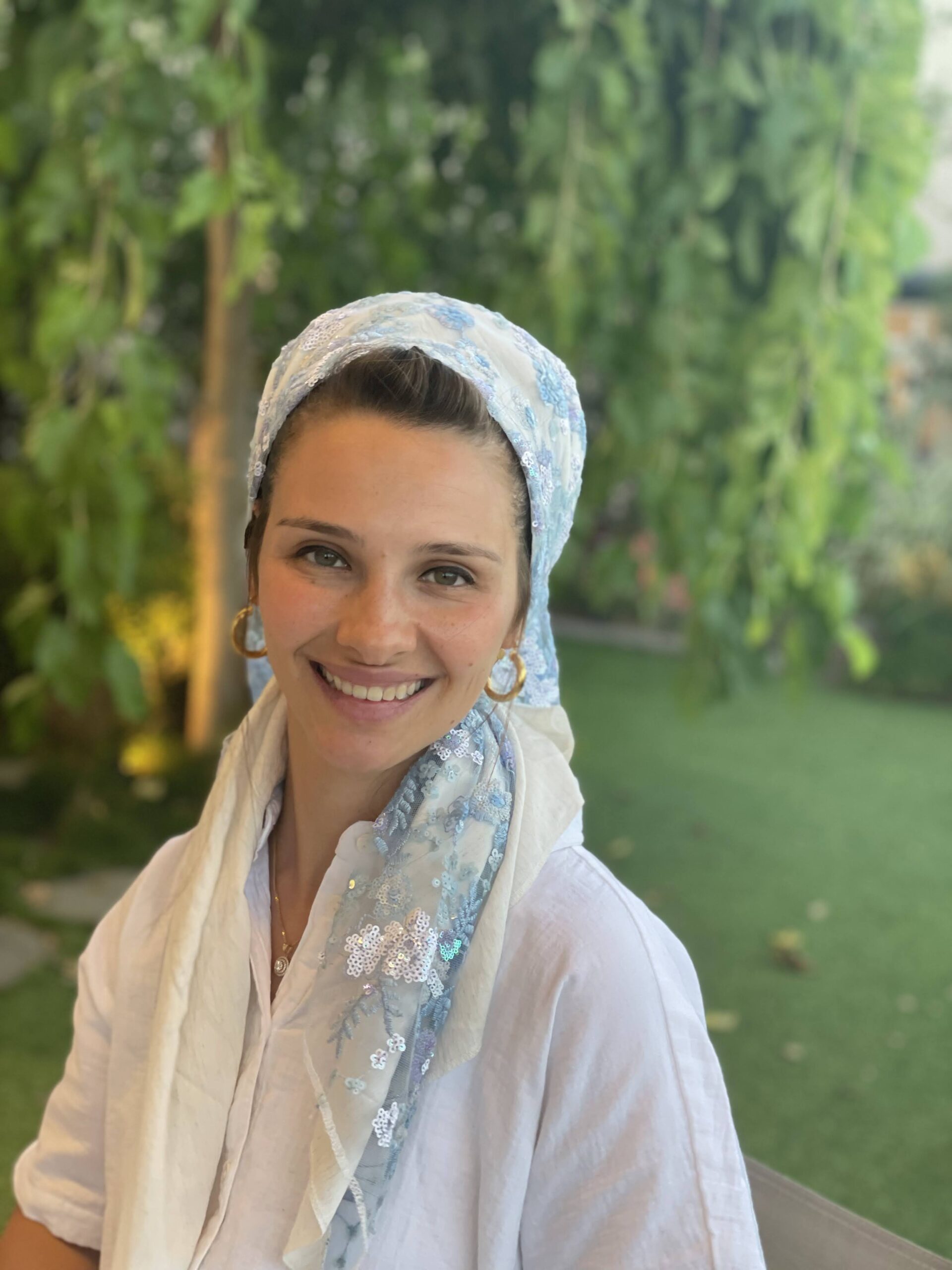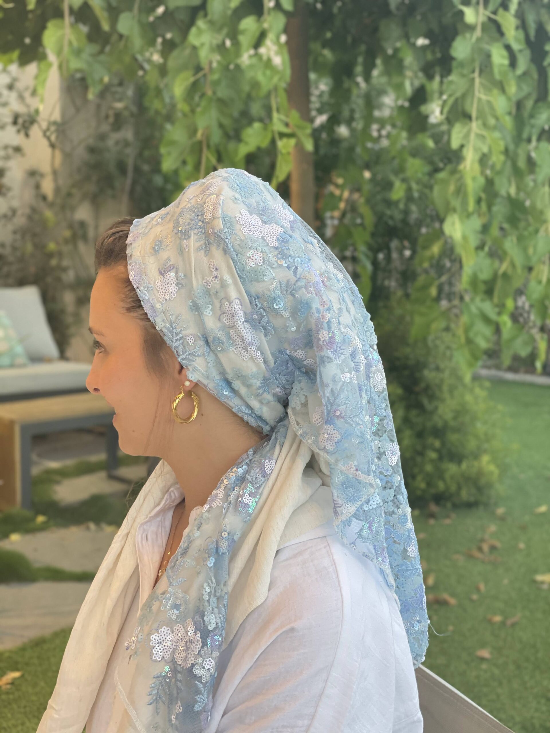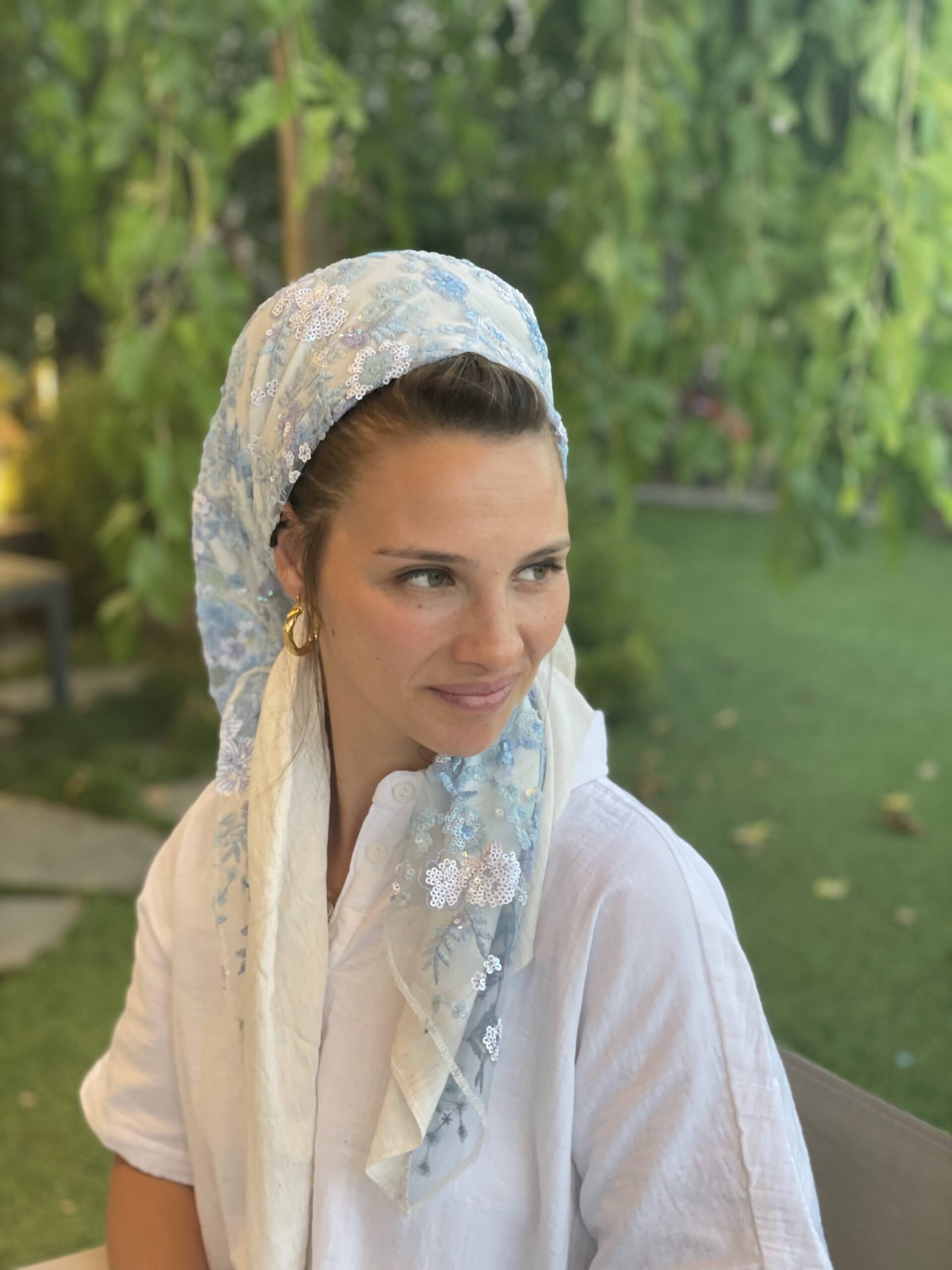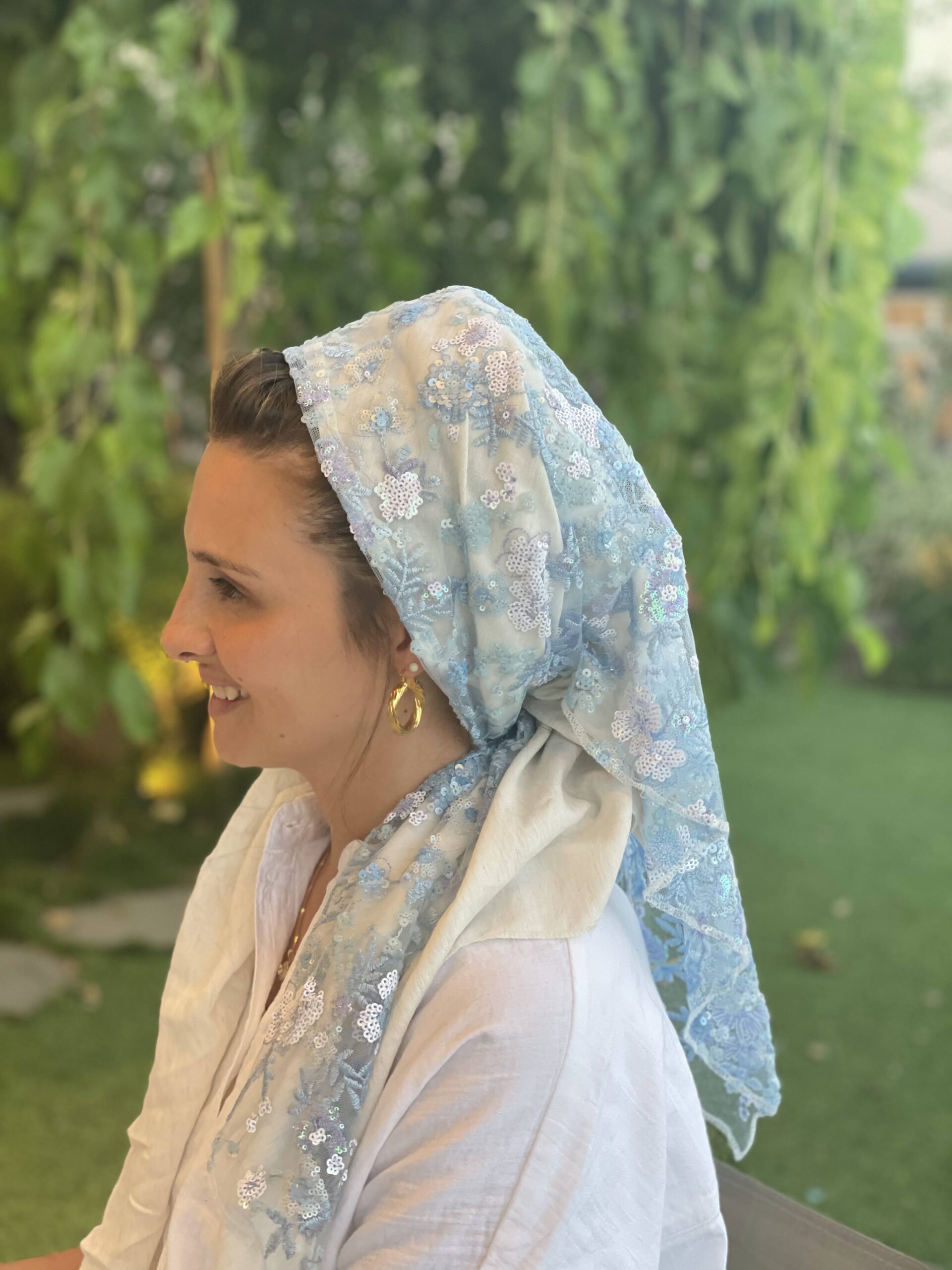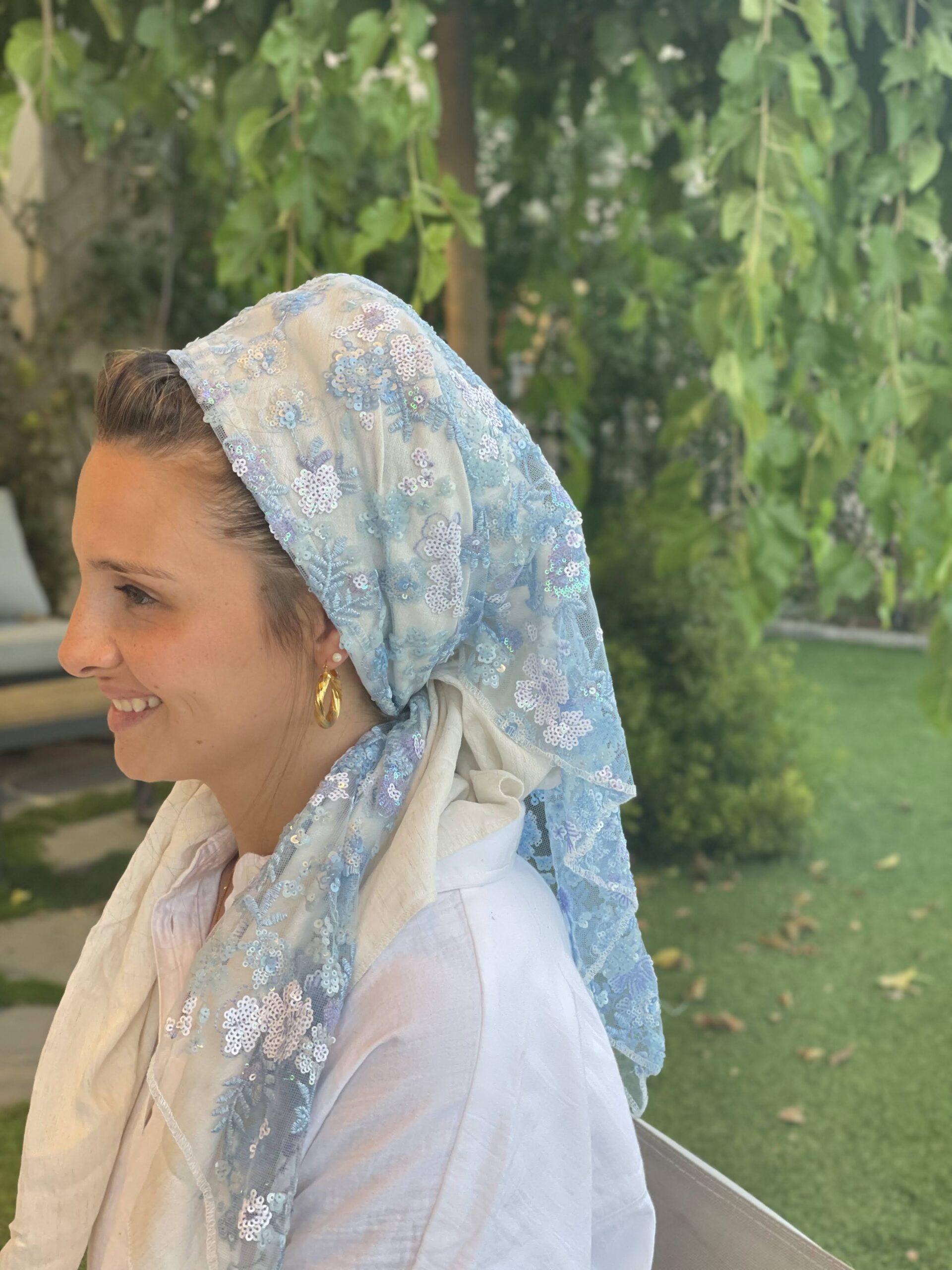 מטפחת פייטים עדינים בצבעי תכלת כרם ולבן עם בסיס פשתן כרם.