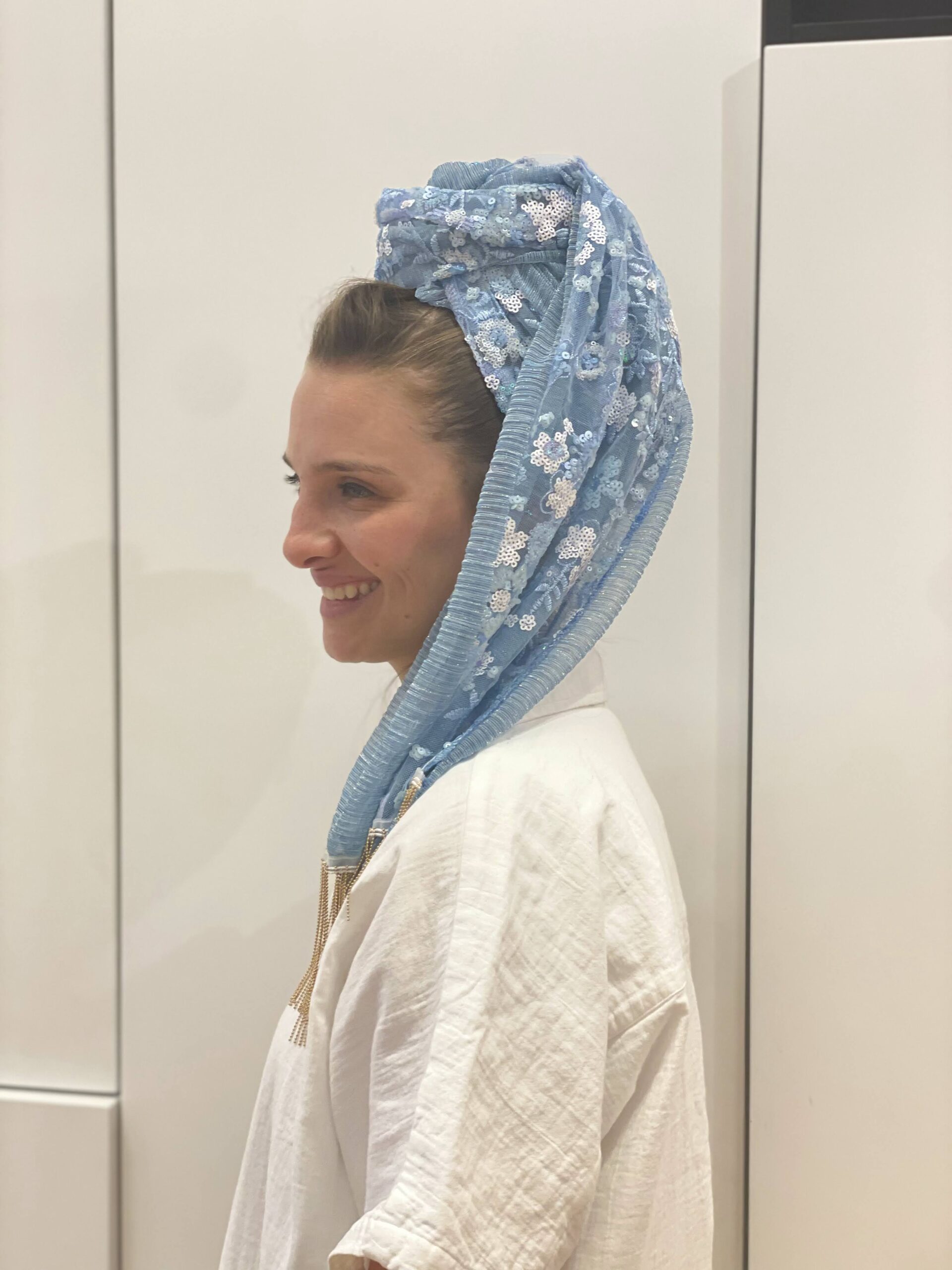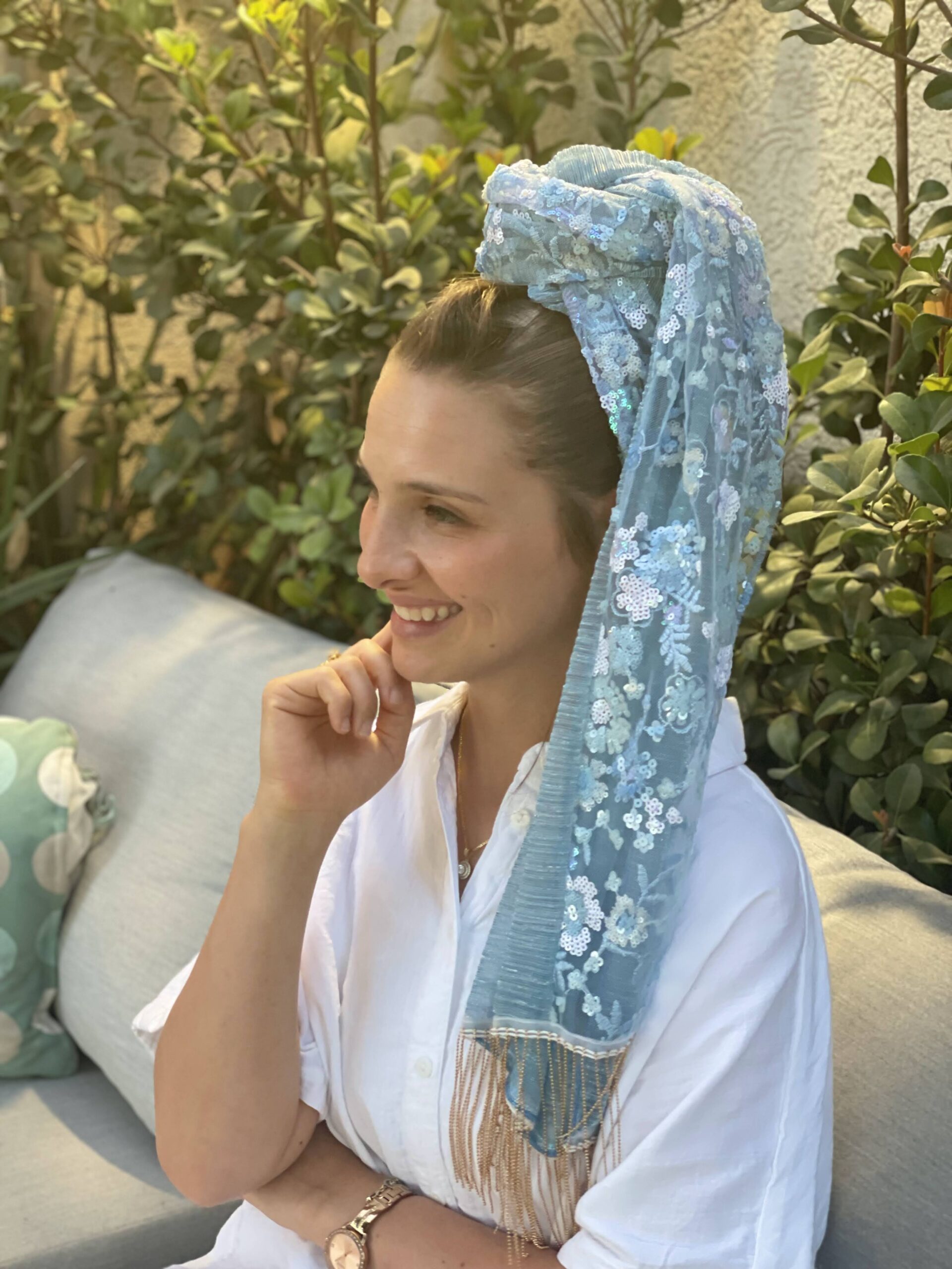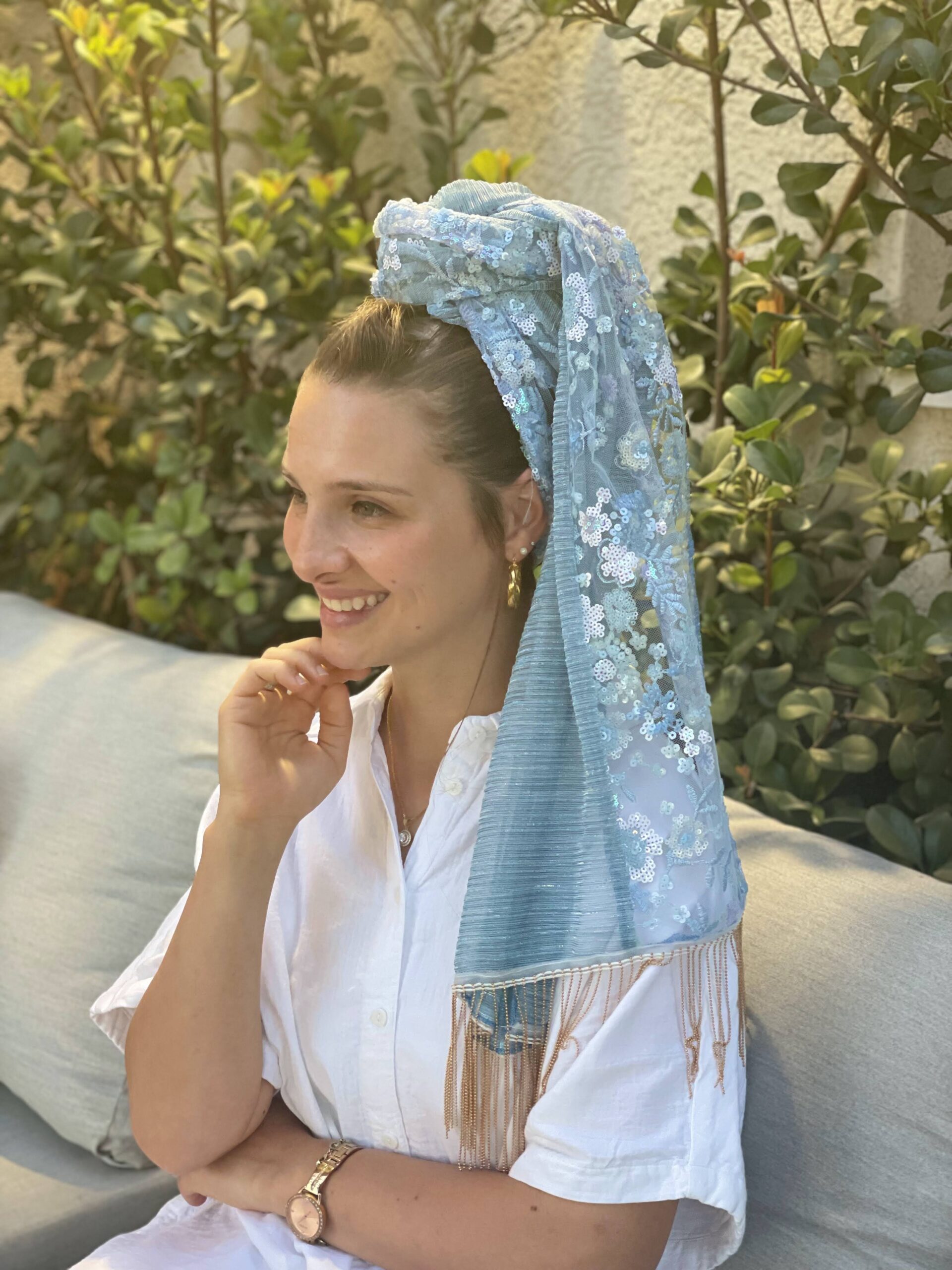 מטפחת פייטים תכלת עם פרחים קטנטנים בגווני תכלת ולבן, בשילוב בד פליסה תכלת. ופרנזים נופלים שרשרת זהב.