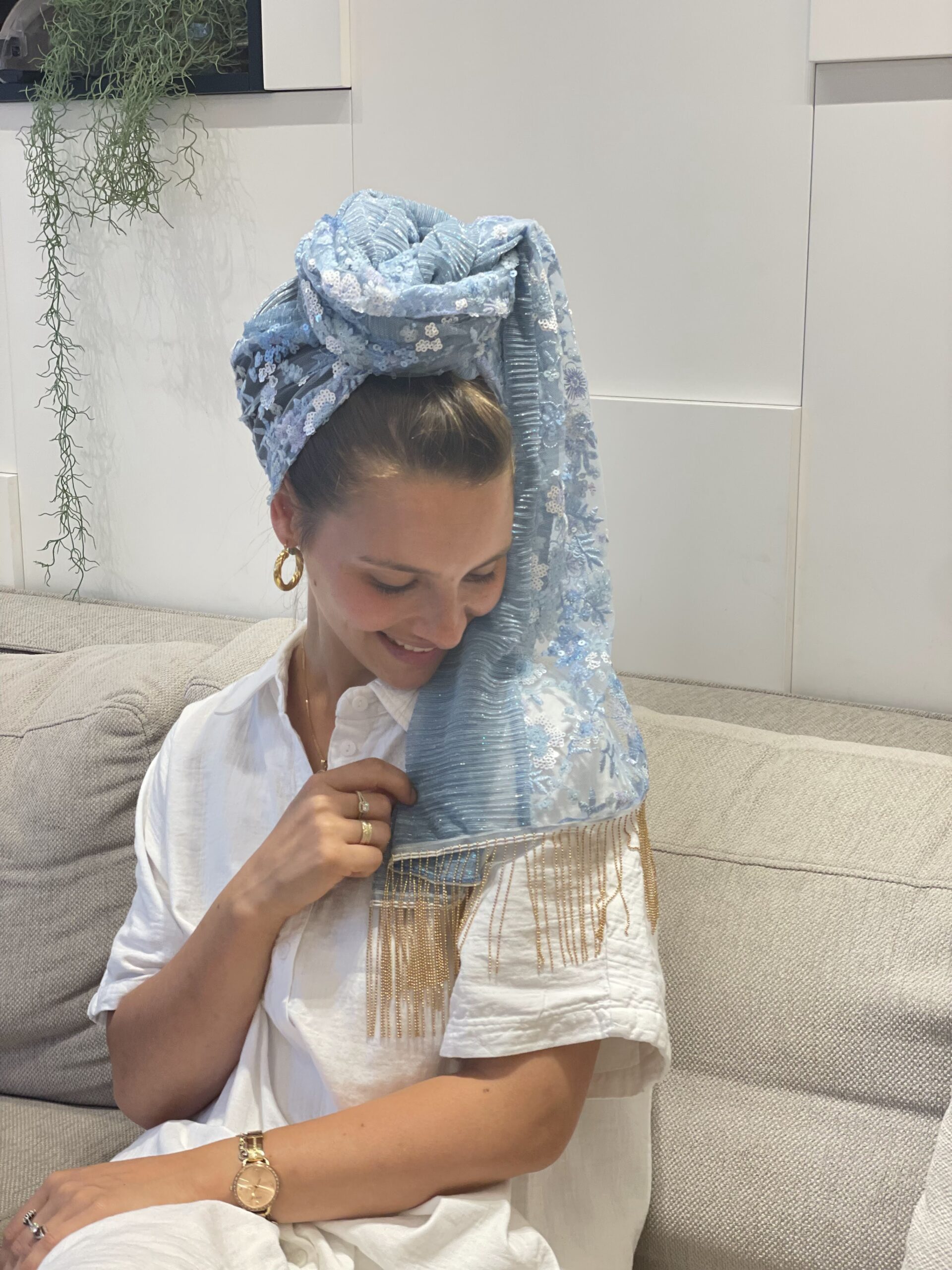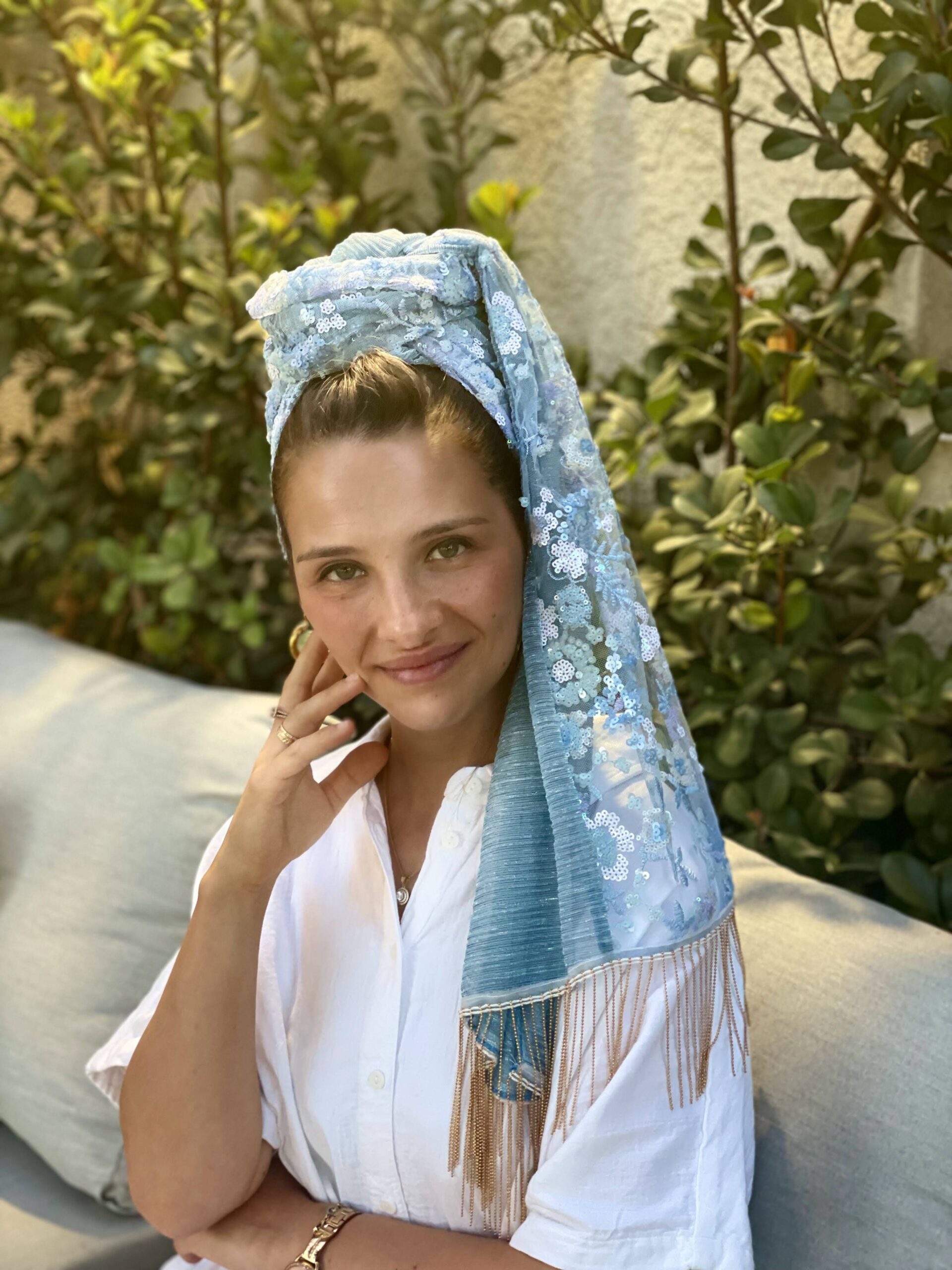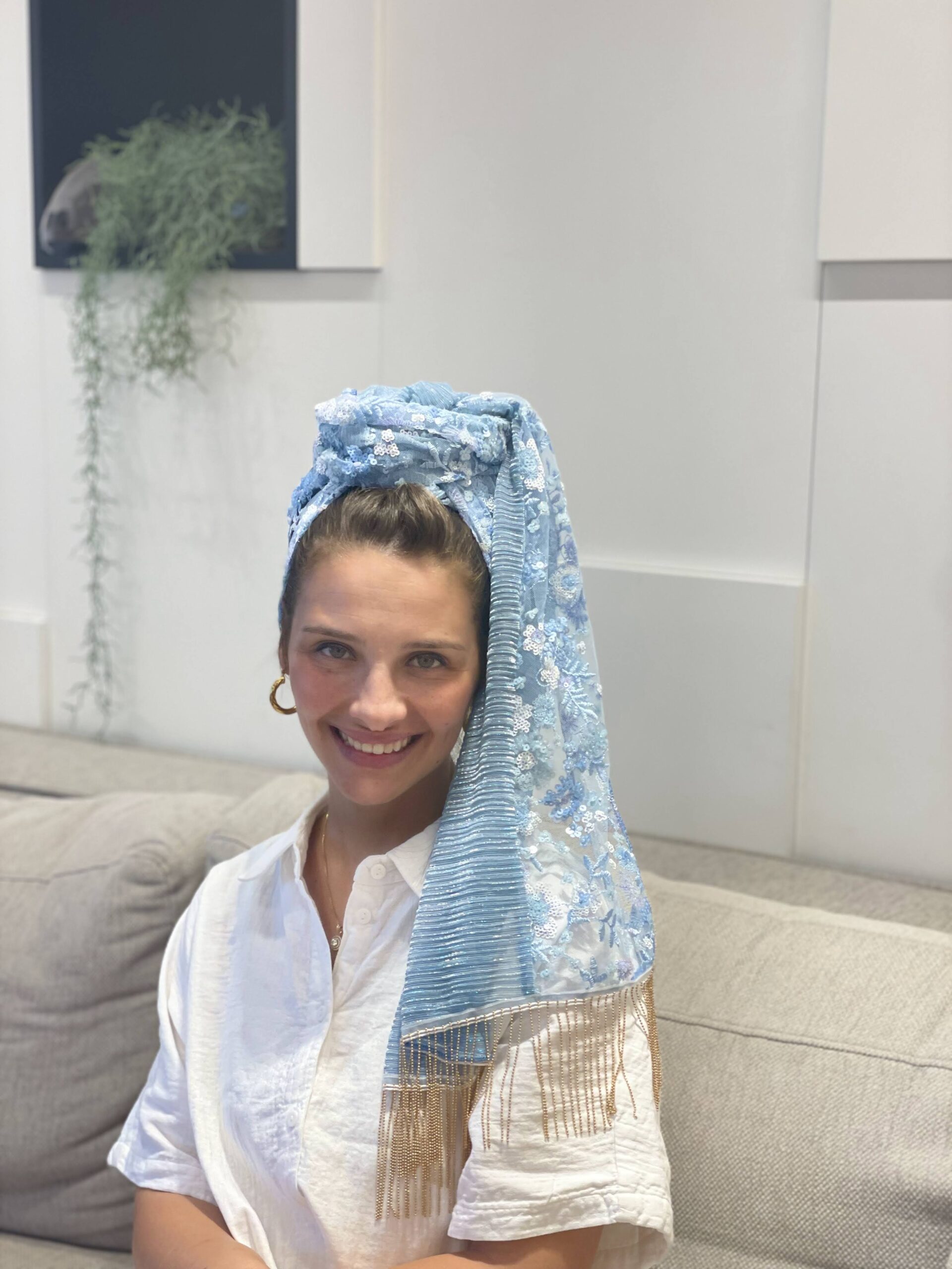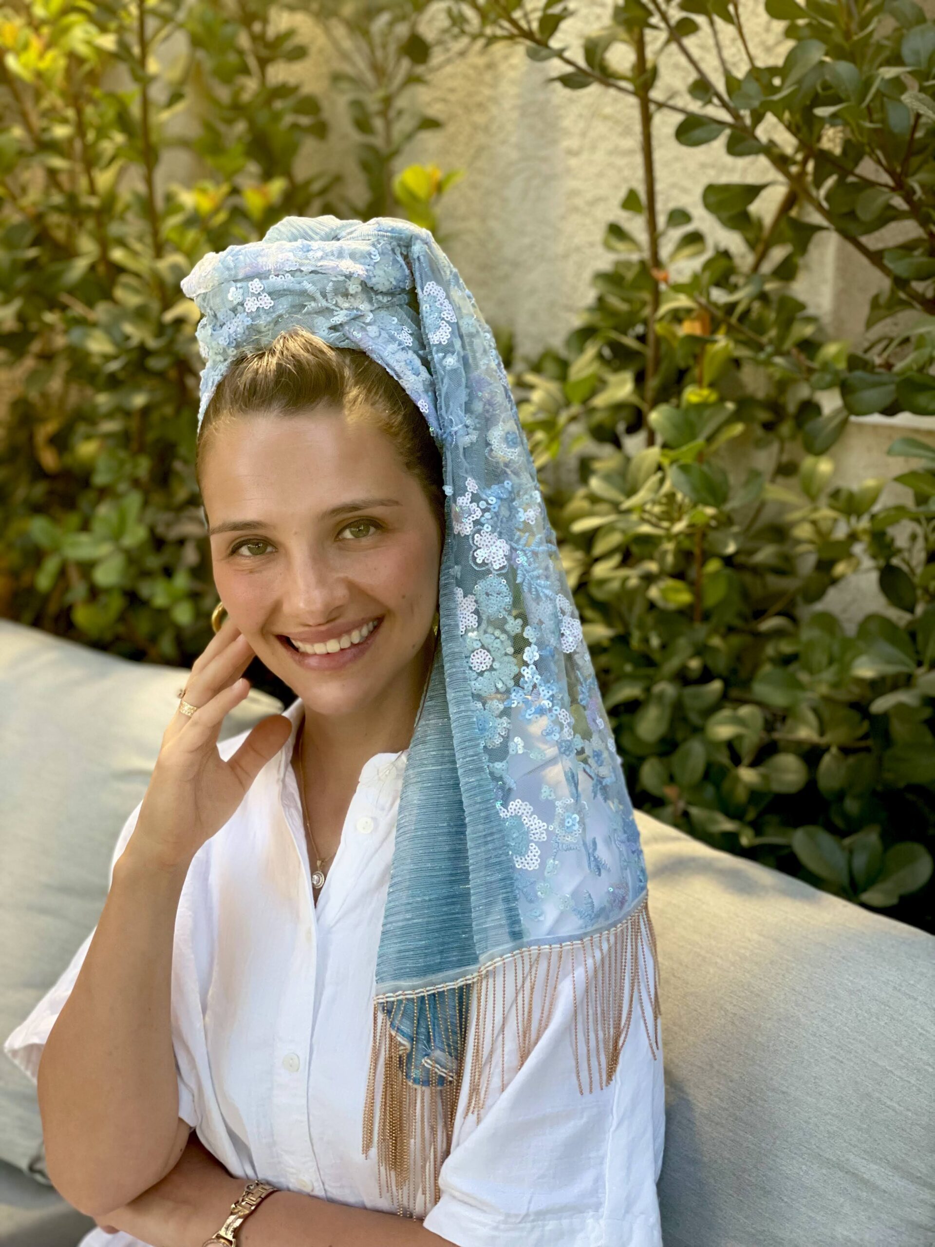 מטפחת פייטים תכלת עם פרחים קטנטנים בגווני תכלת ולבן, בשילוב בד פליסה תכלת. ופרנזים נופלים שרשרת זהב.