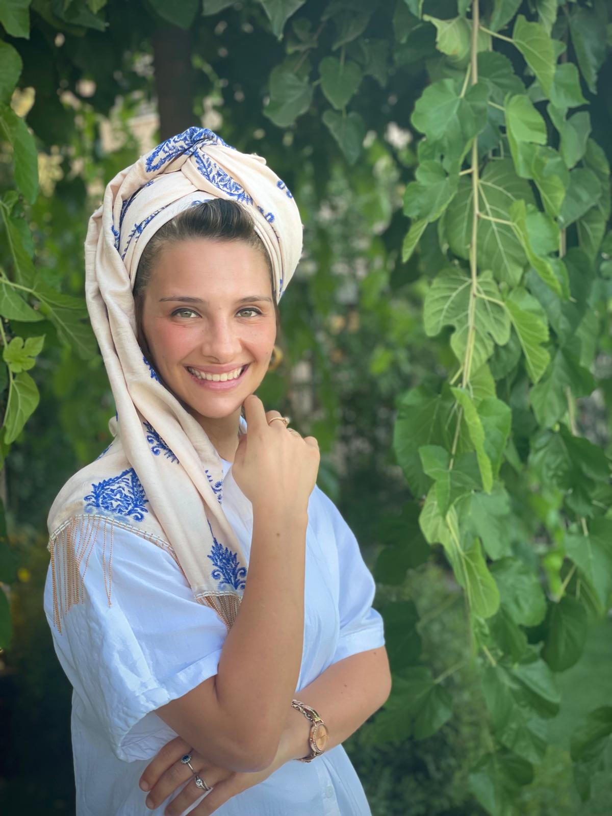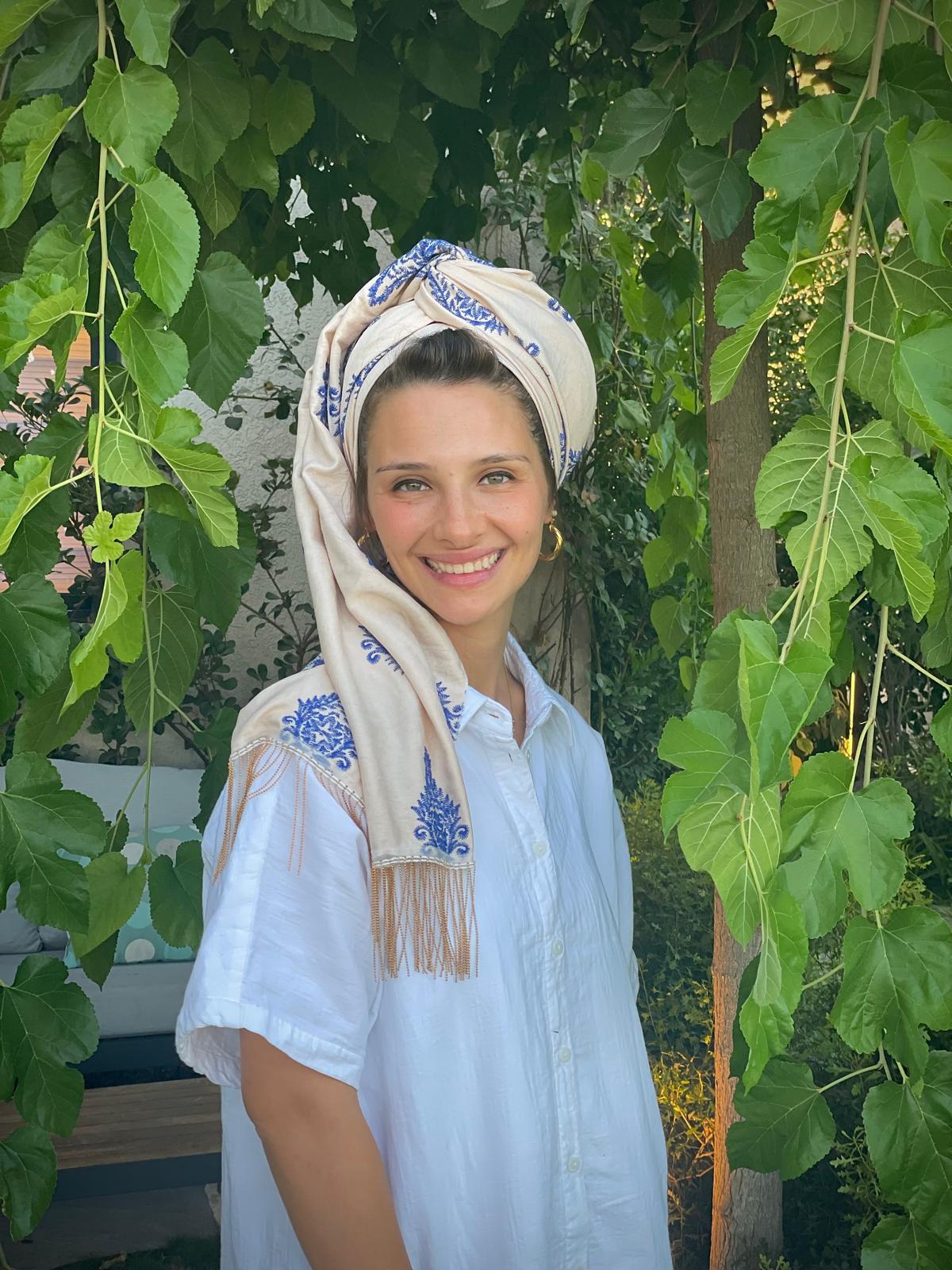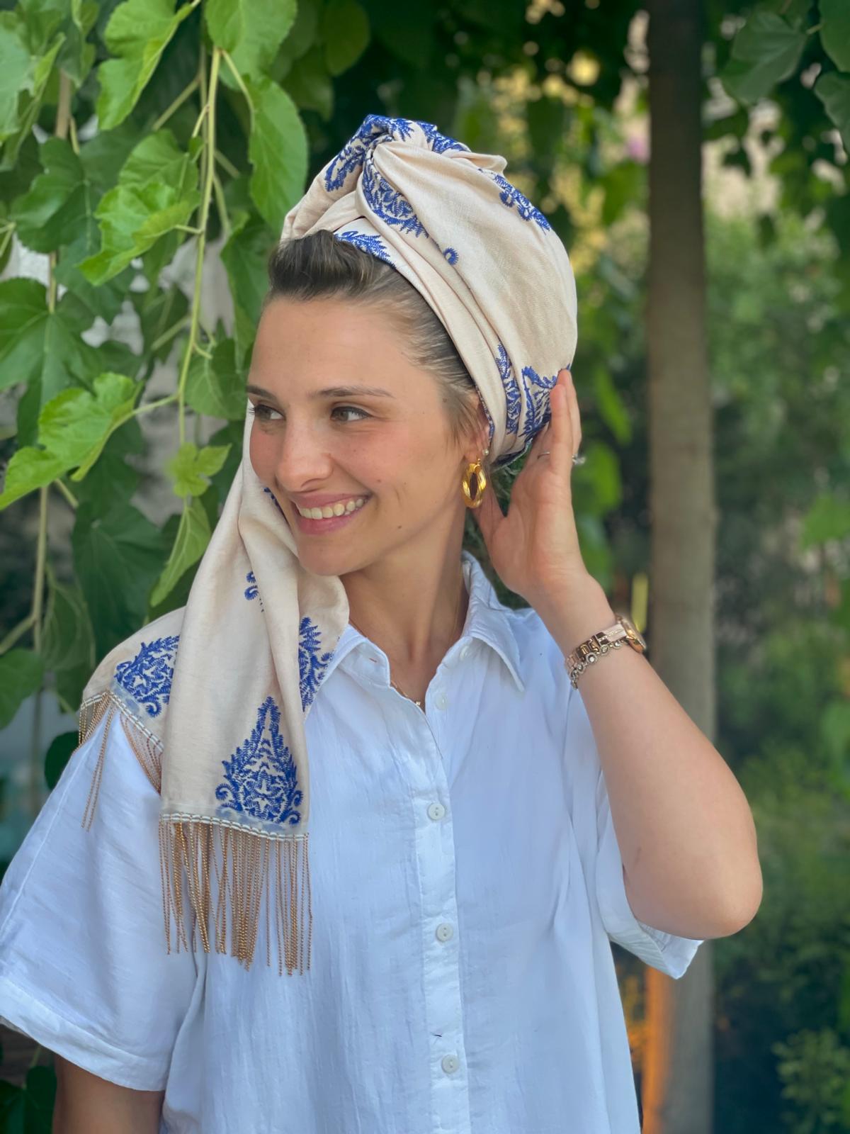 מטפחת כרם עם רקמה כחולה ופרנזים זהב. משדרגת כל לוק!