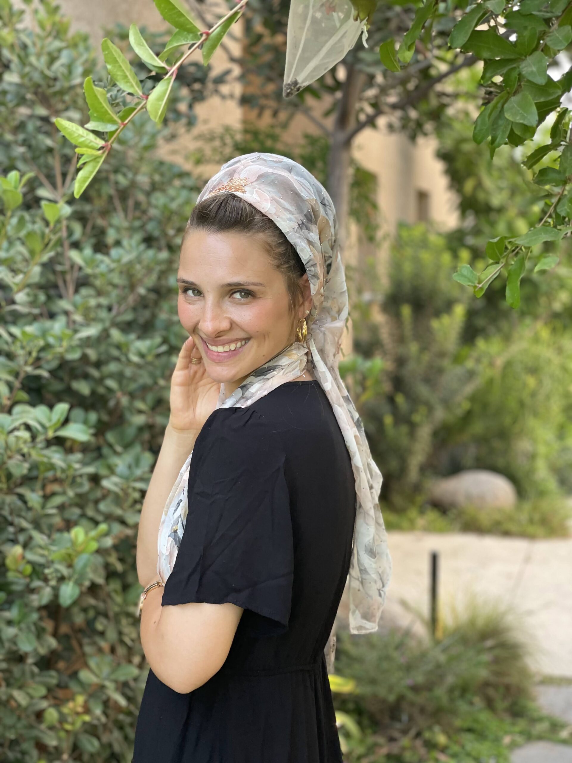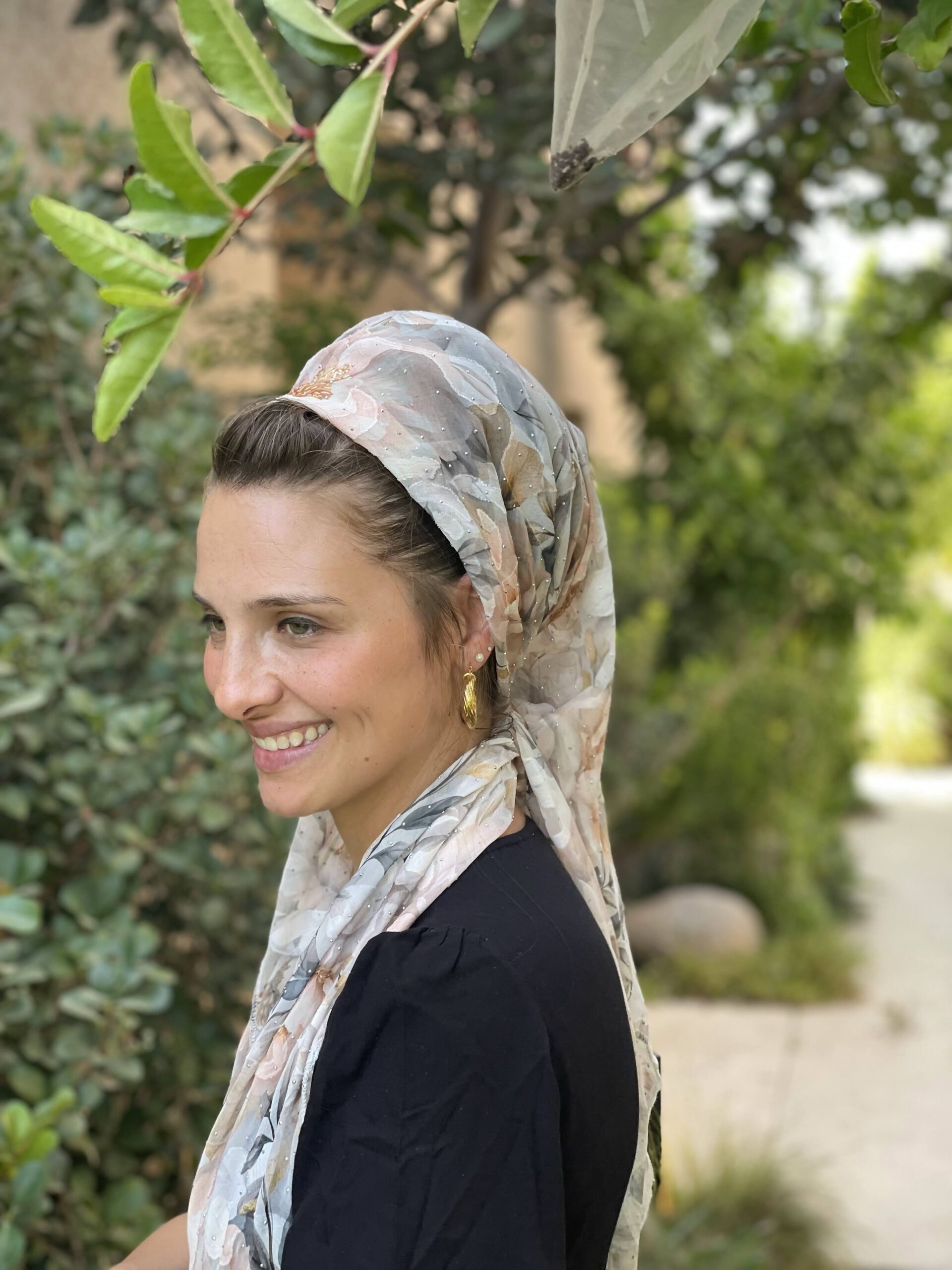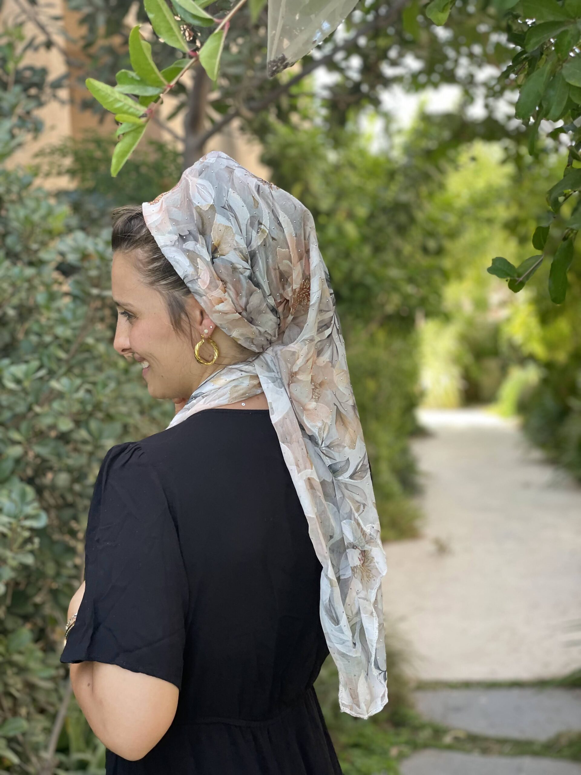 מטפחת שיפון עם פרחים כתמתמים, ואבנים קטנות כסופות.