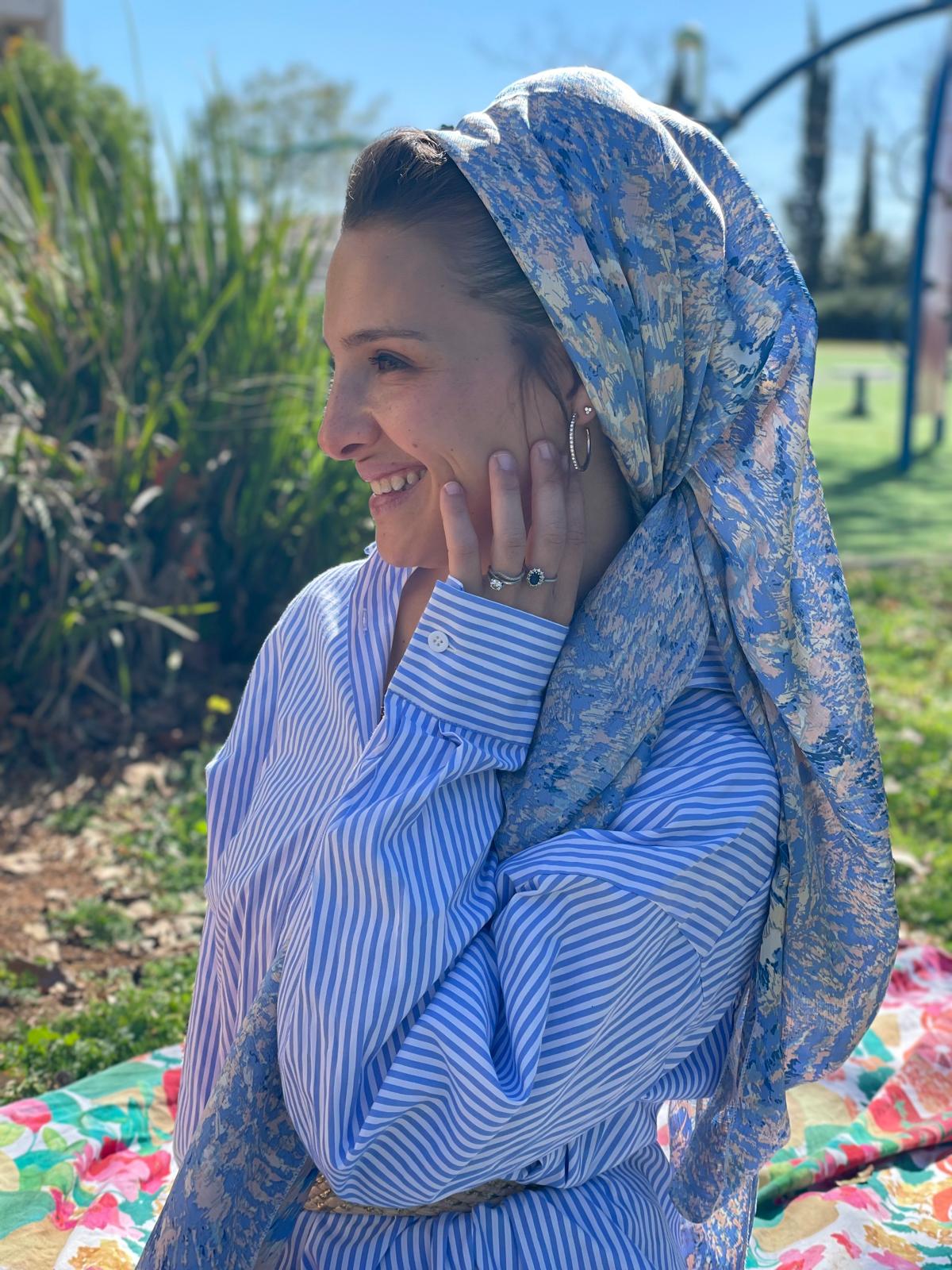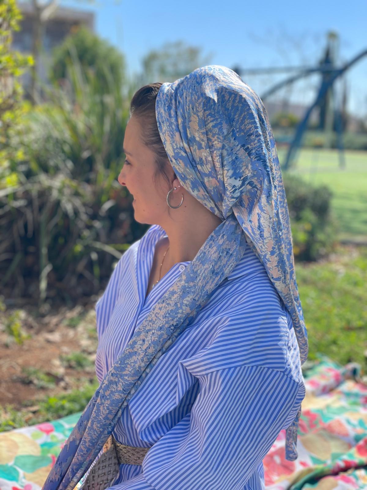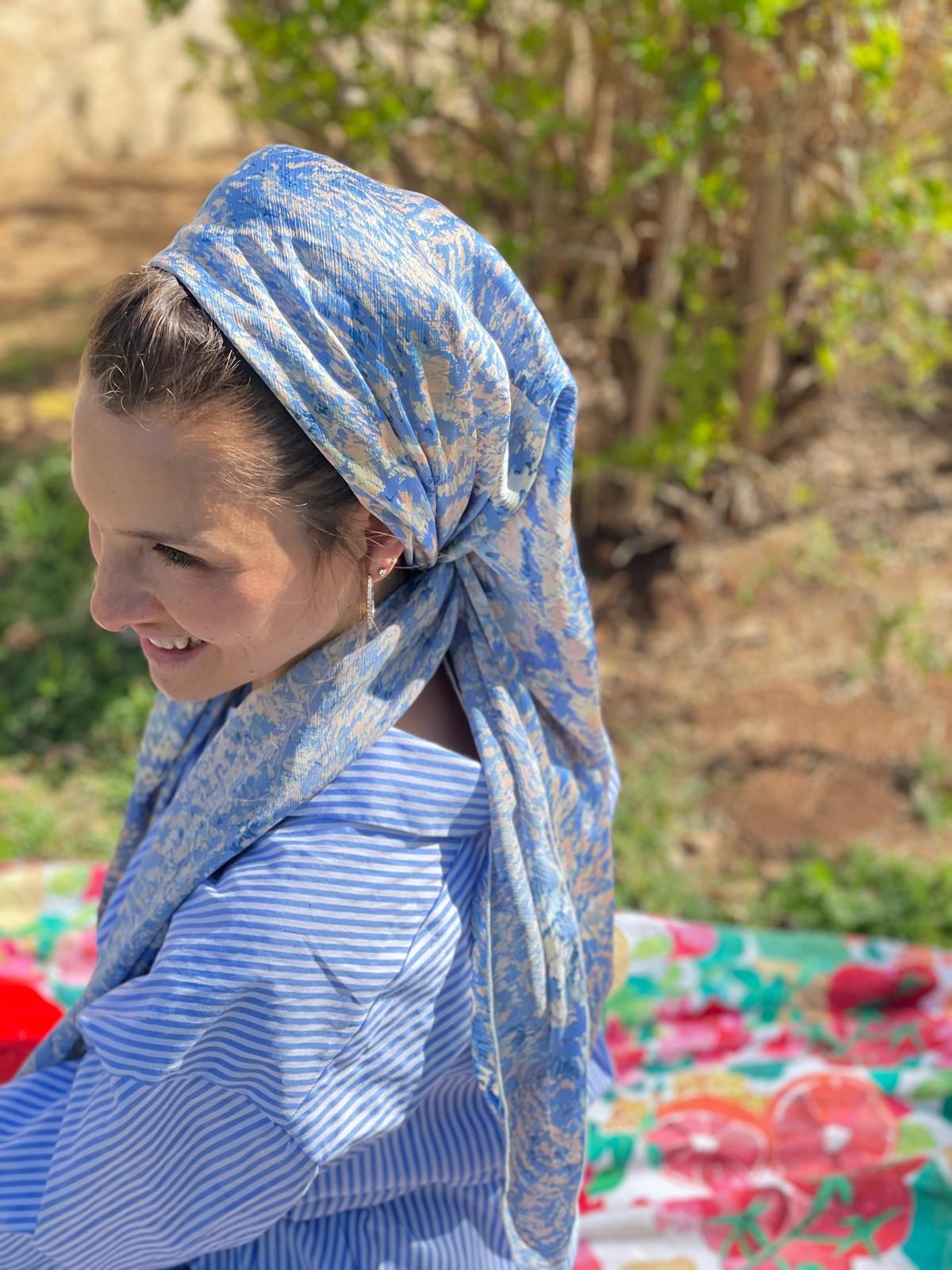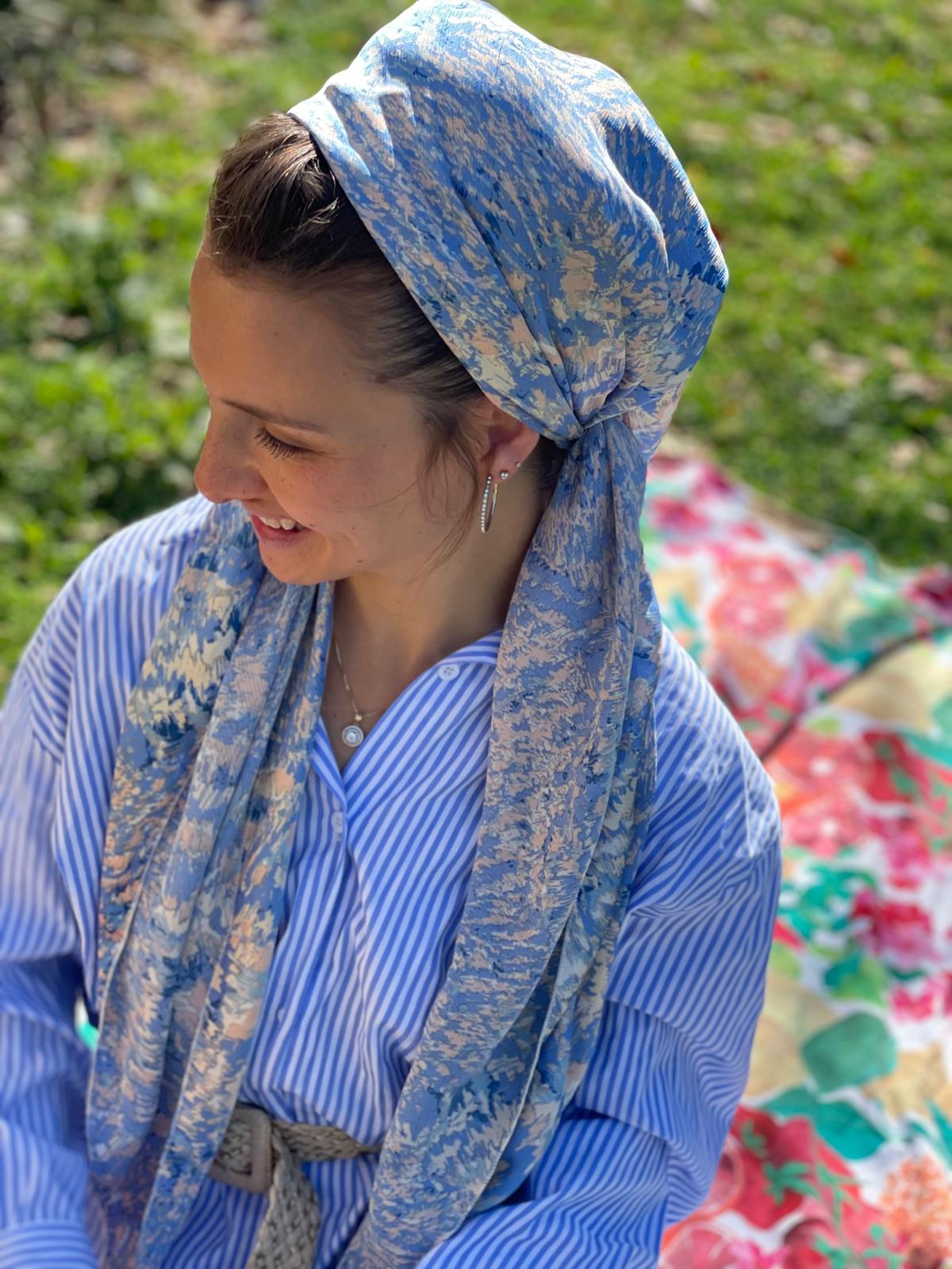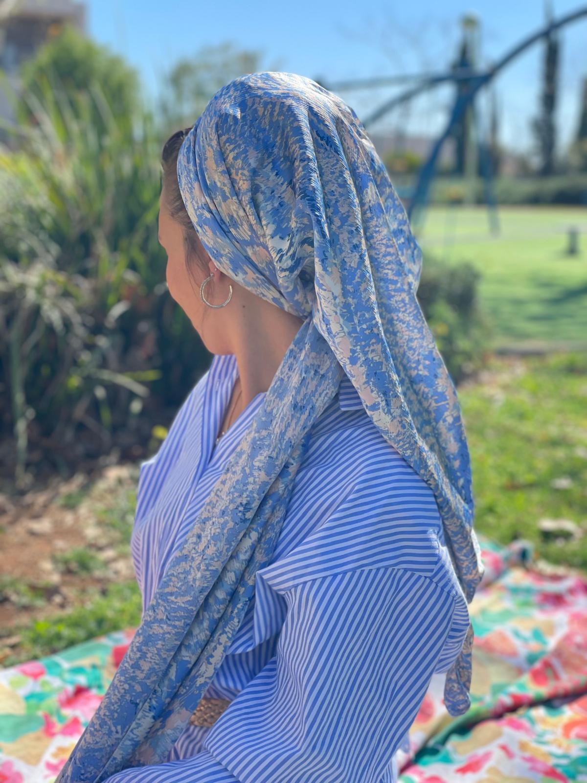 מטפחת סטן עם הדפס מנומר משגע בגווני כרם ותכלת.