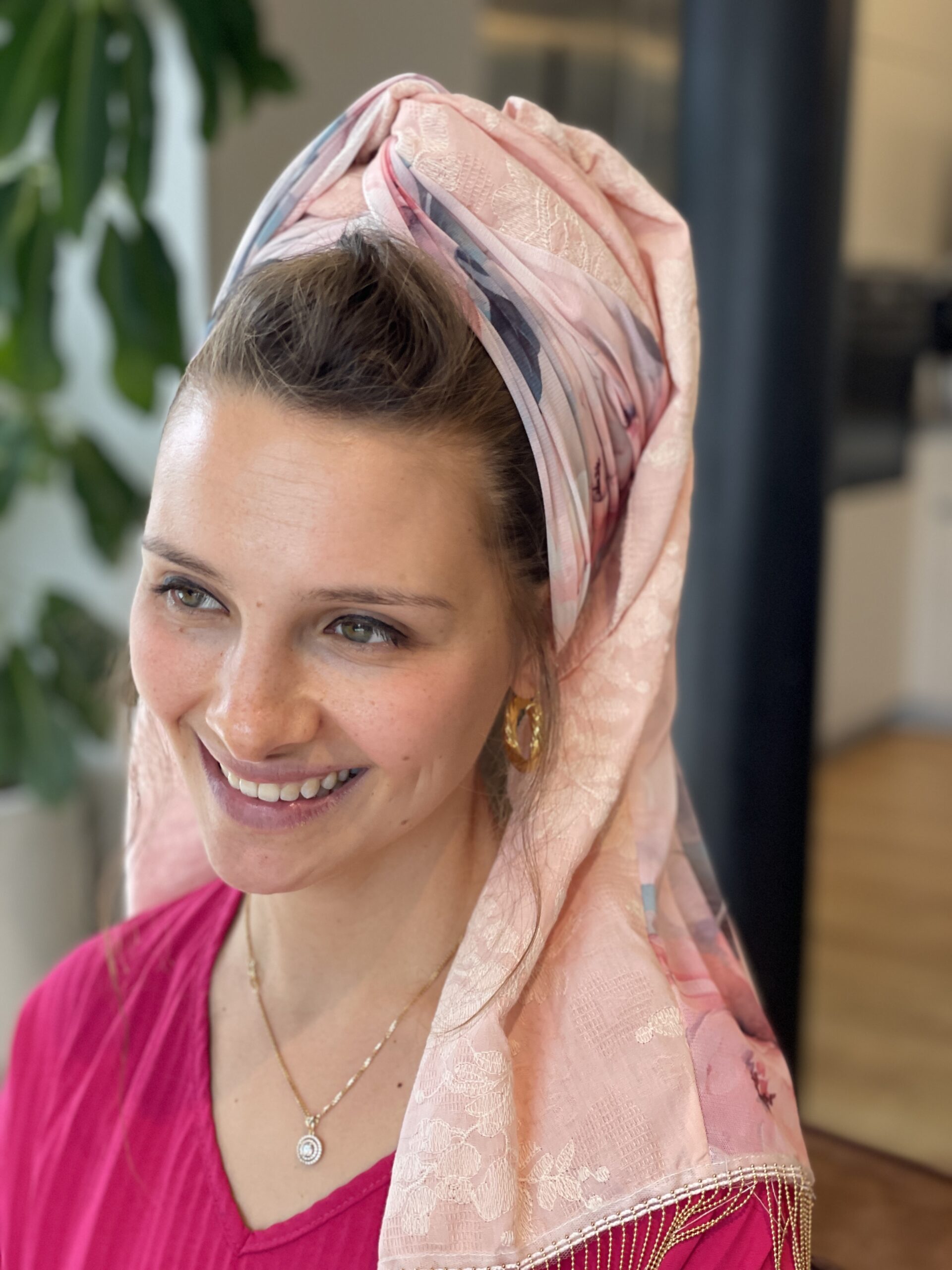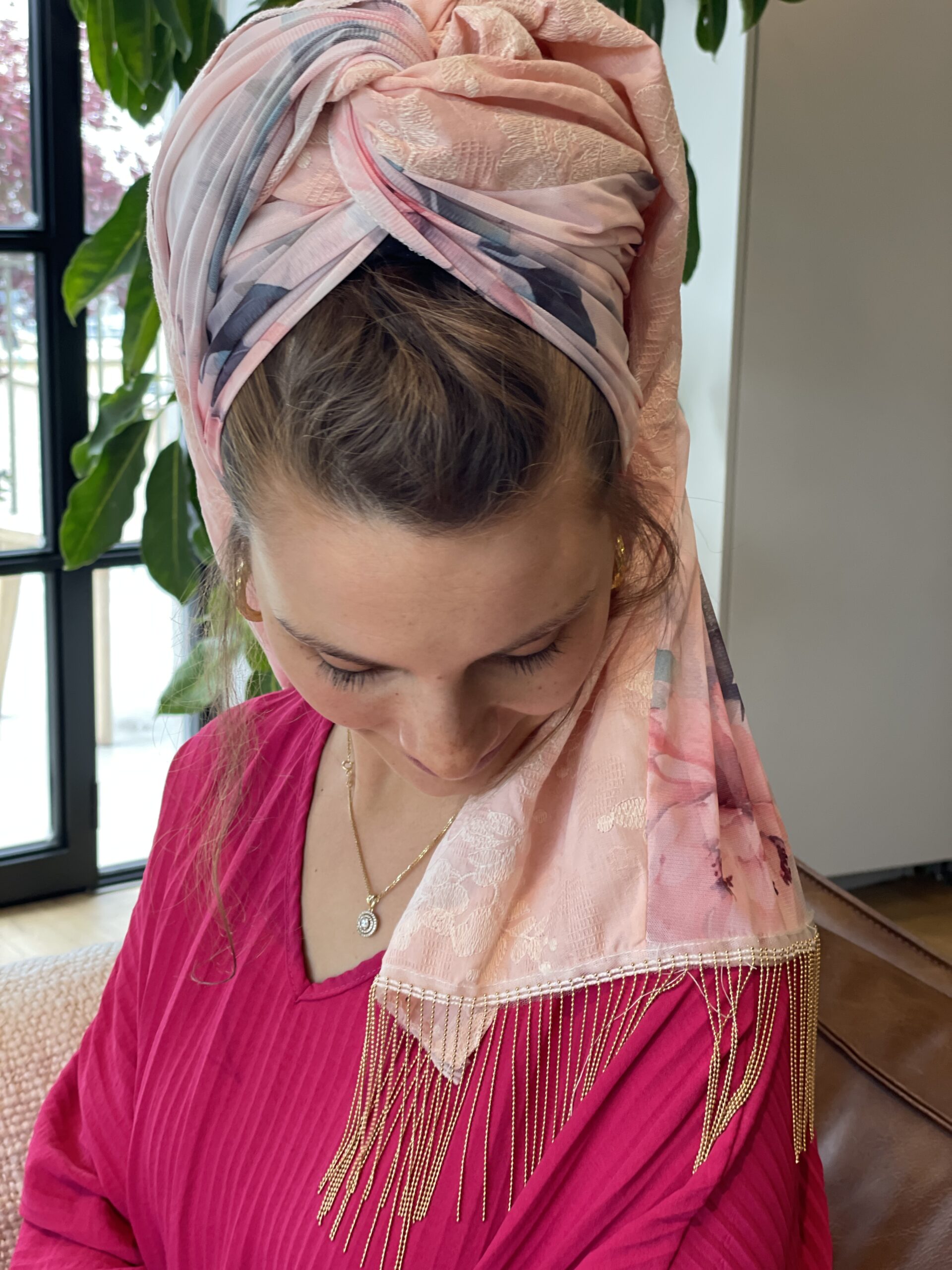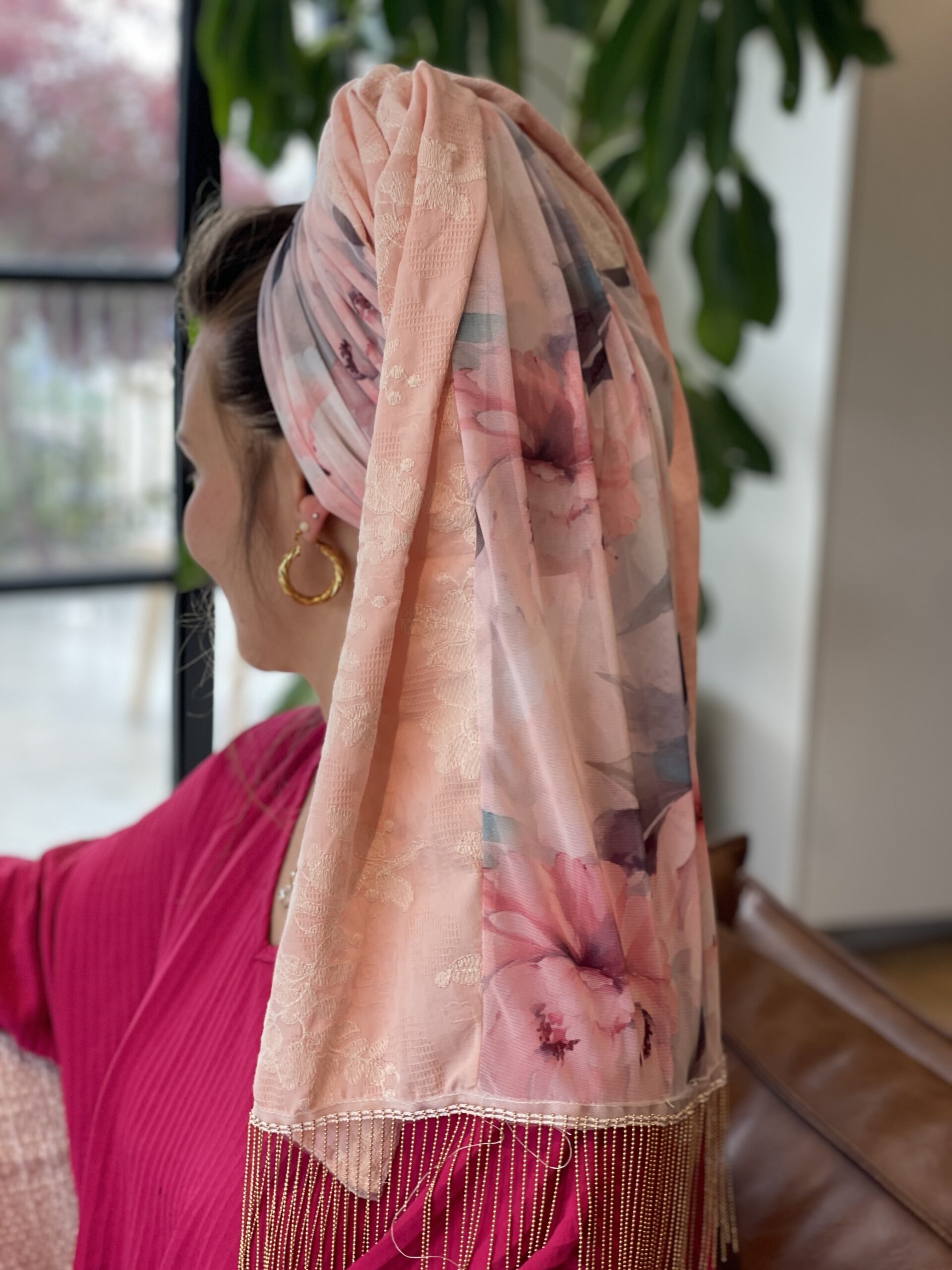 מטפחת טבורבור ורוד עם בד ורוד רקום בפרחים עדינים משולב בד שיפון פרחוני. לשבת חג ואפילו להקפיץ את הלוק ביום יום.