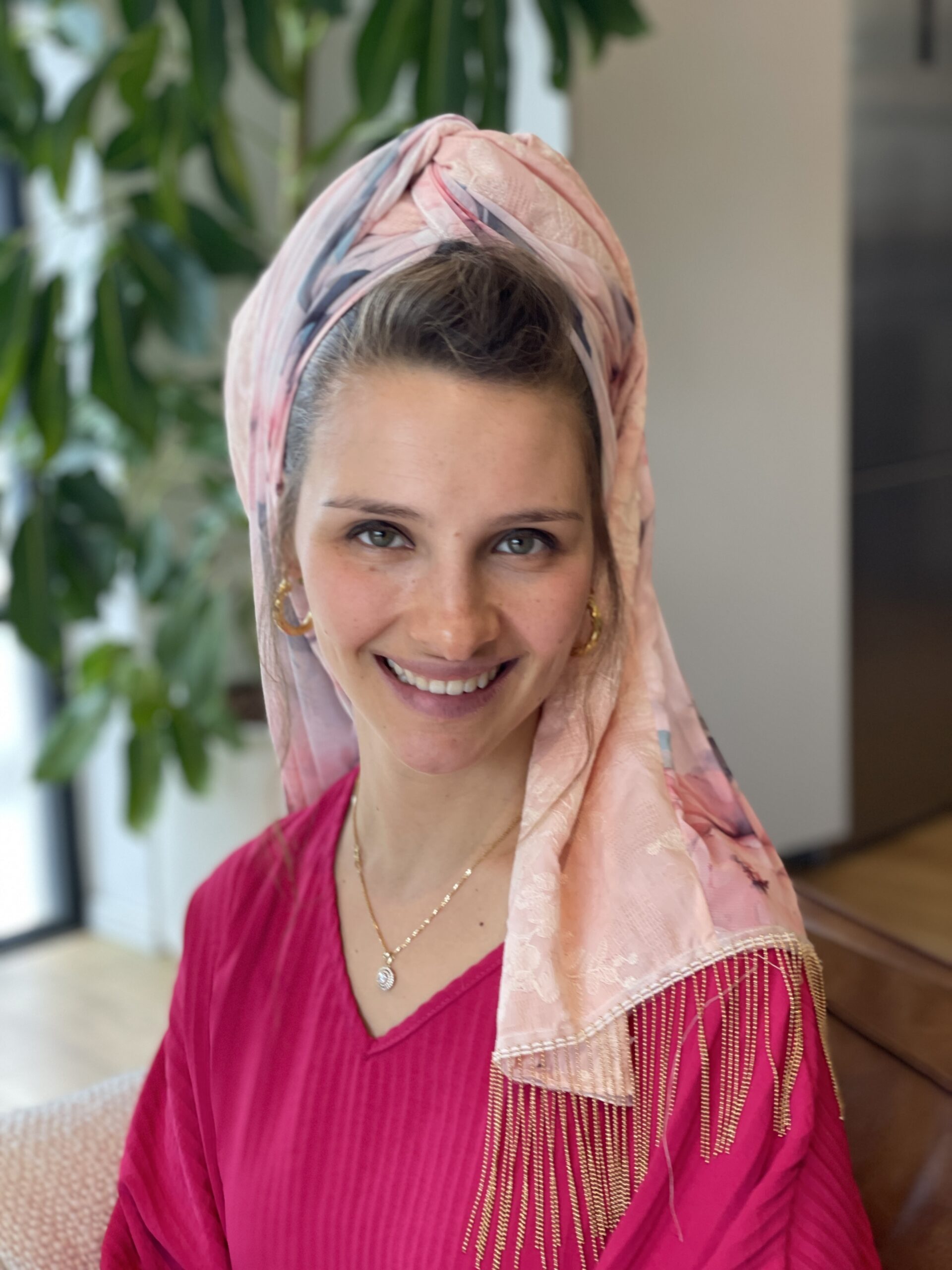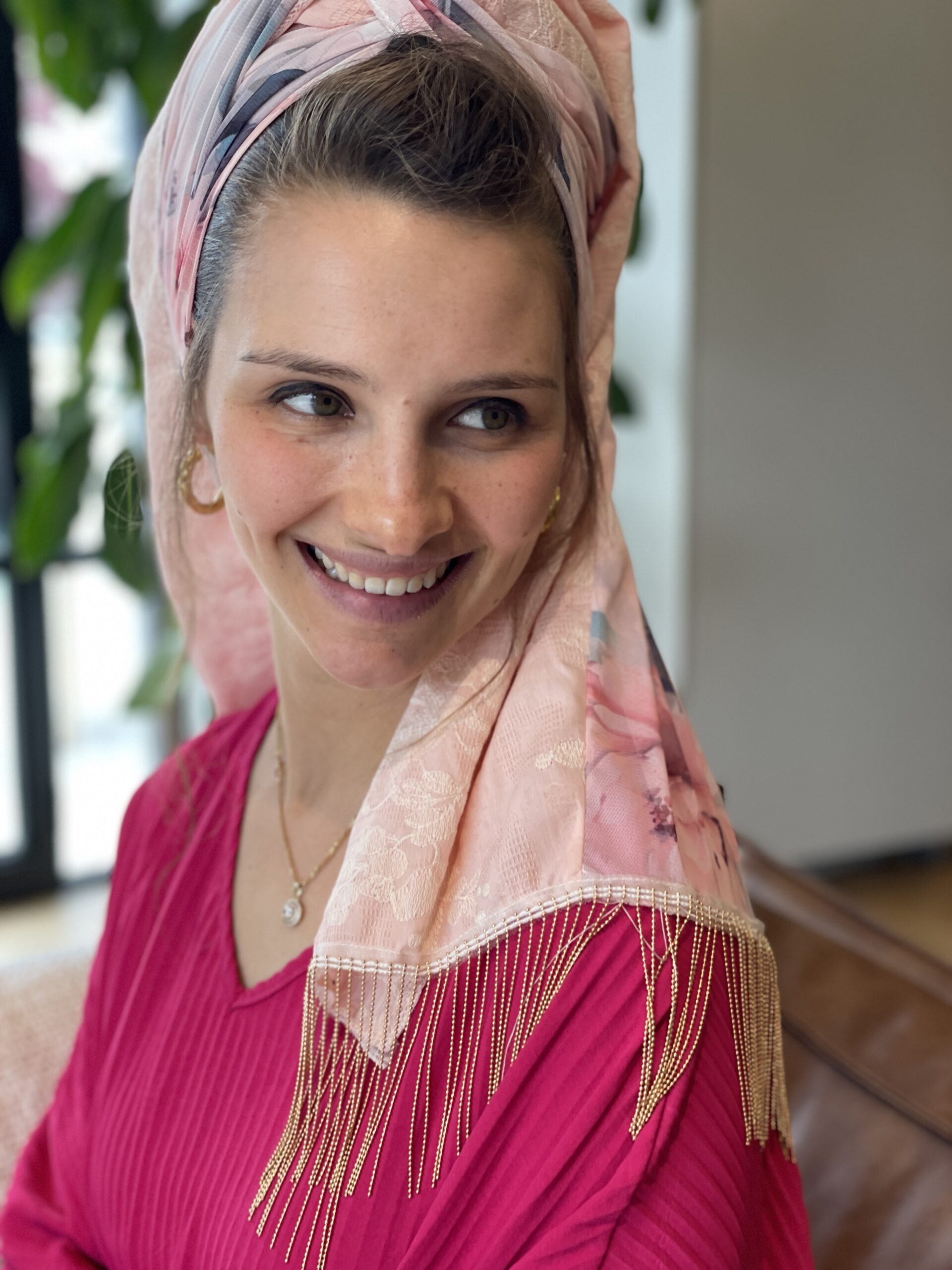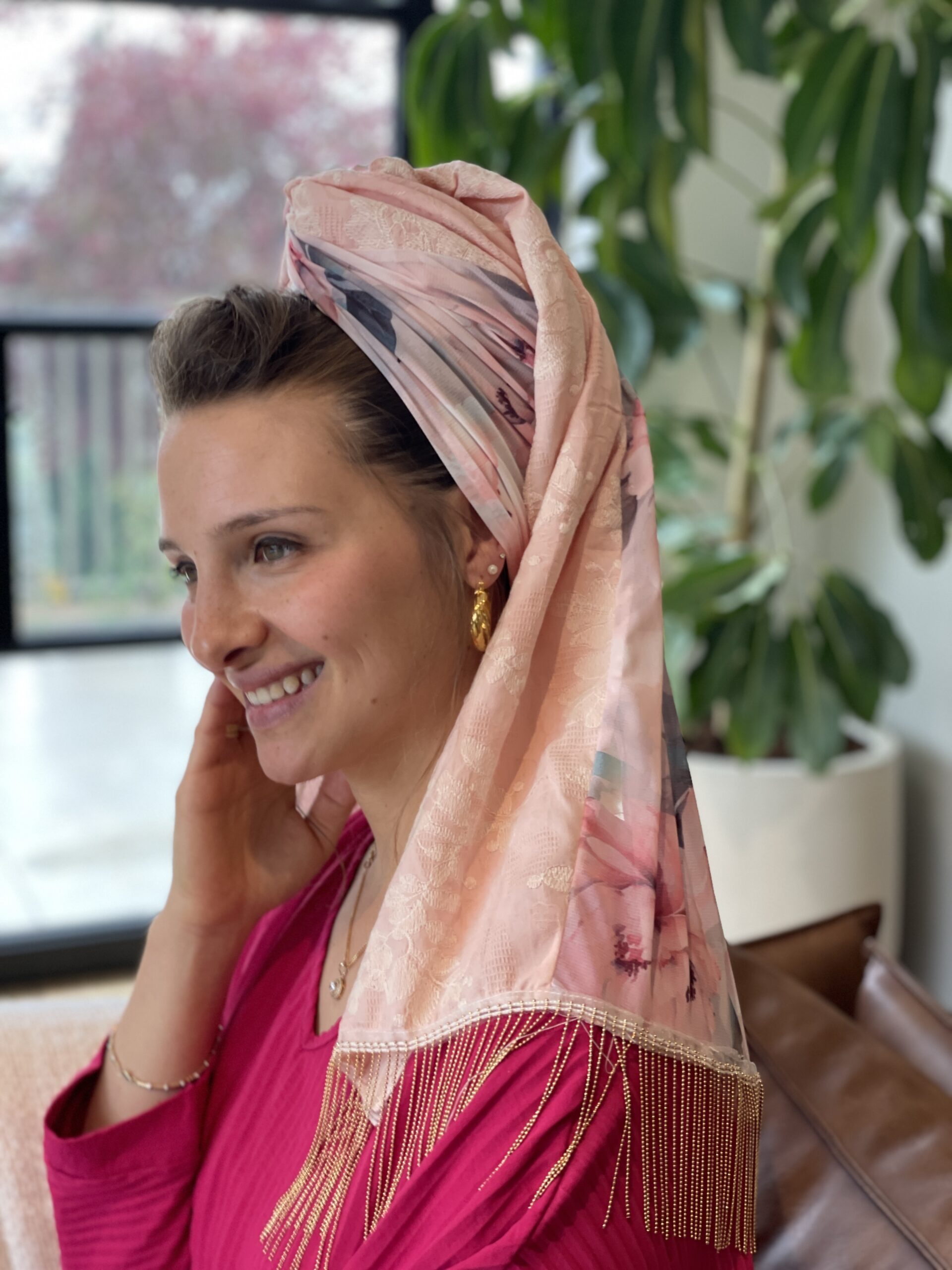 מטפחת טבורבור ורוד עם בד ורוד רקום בפרחים עדינים משולב בד שיפון פרחוני. לשבת חג ואפילו להקפיץ את הלוק ביום יום.