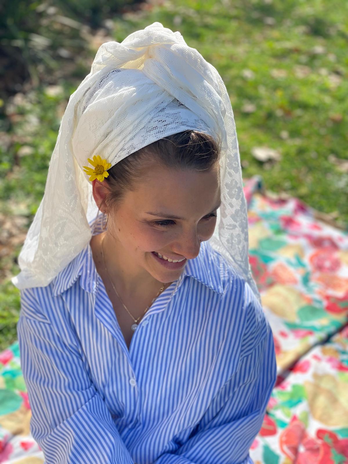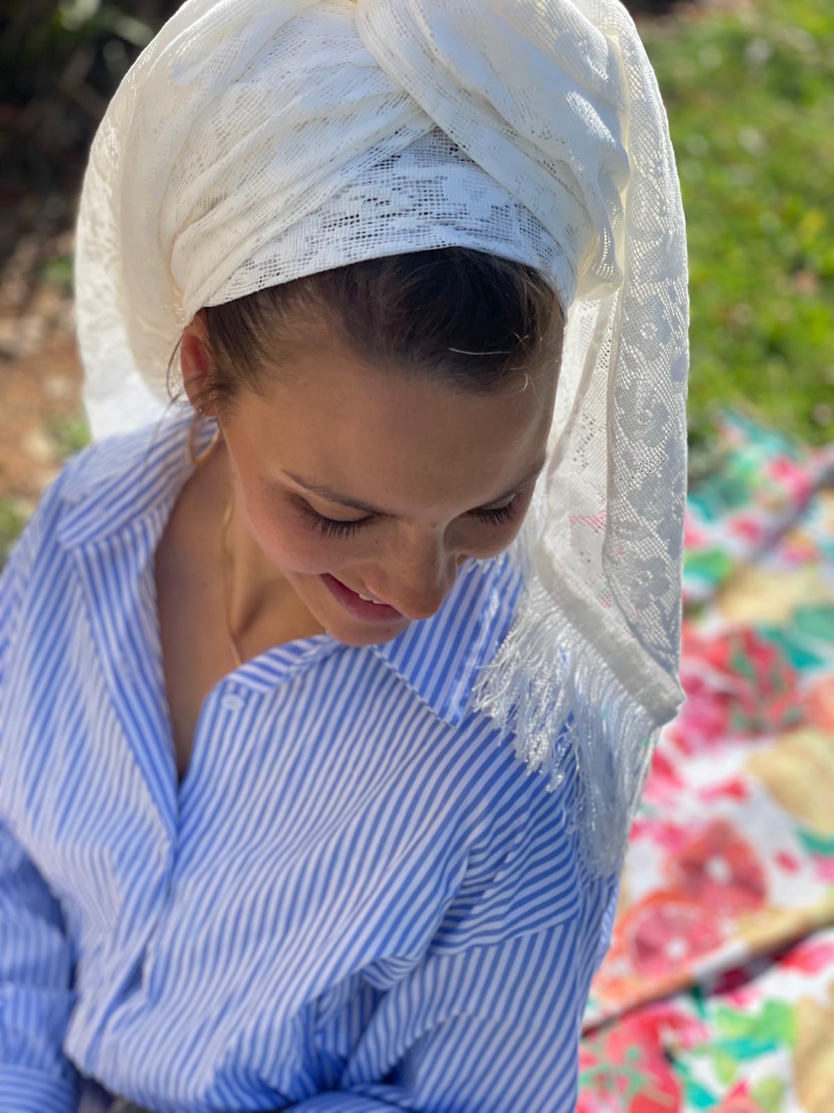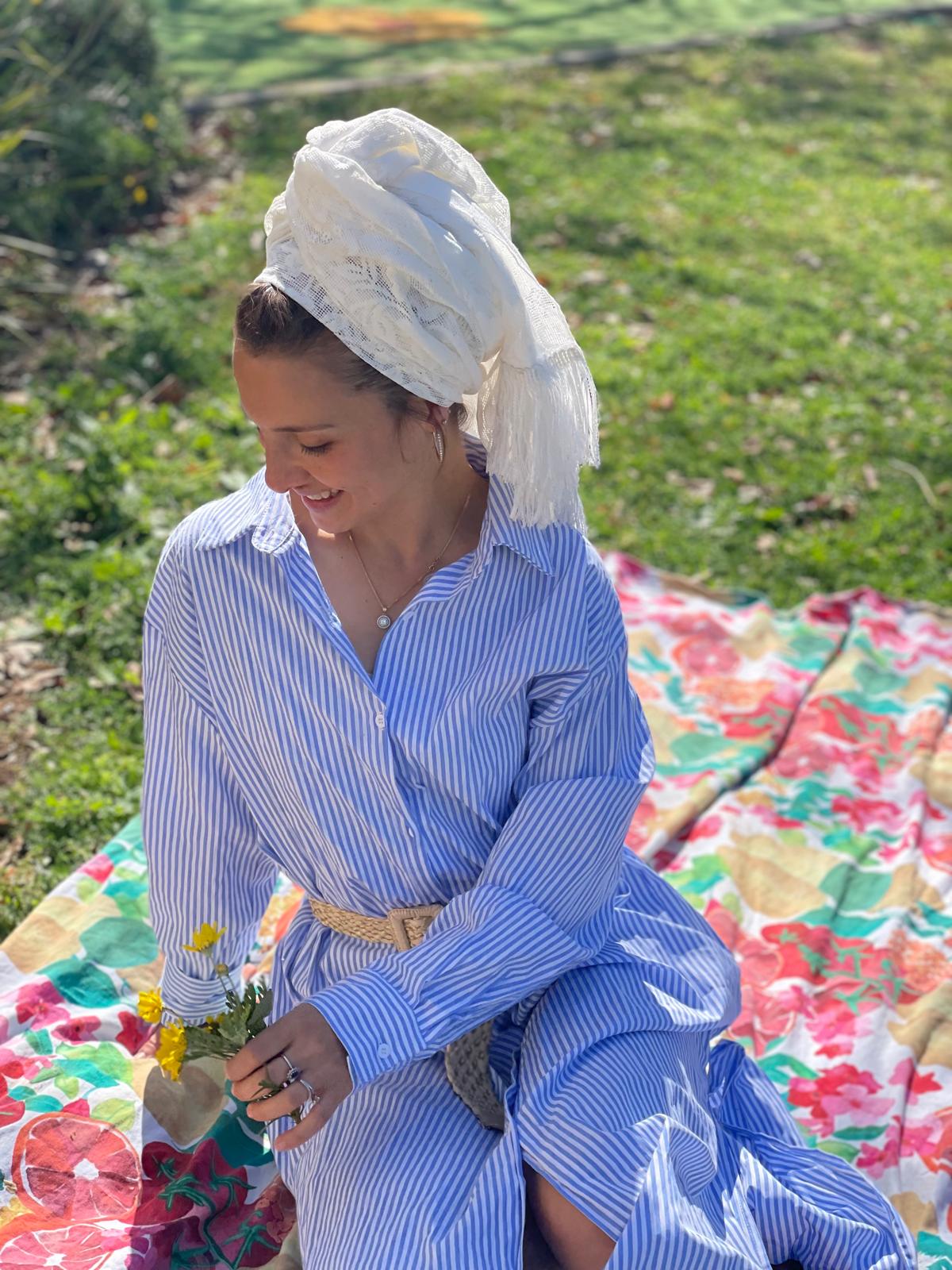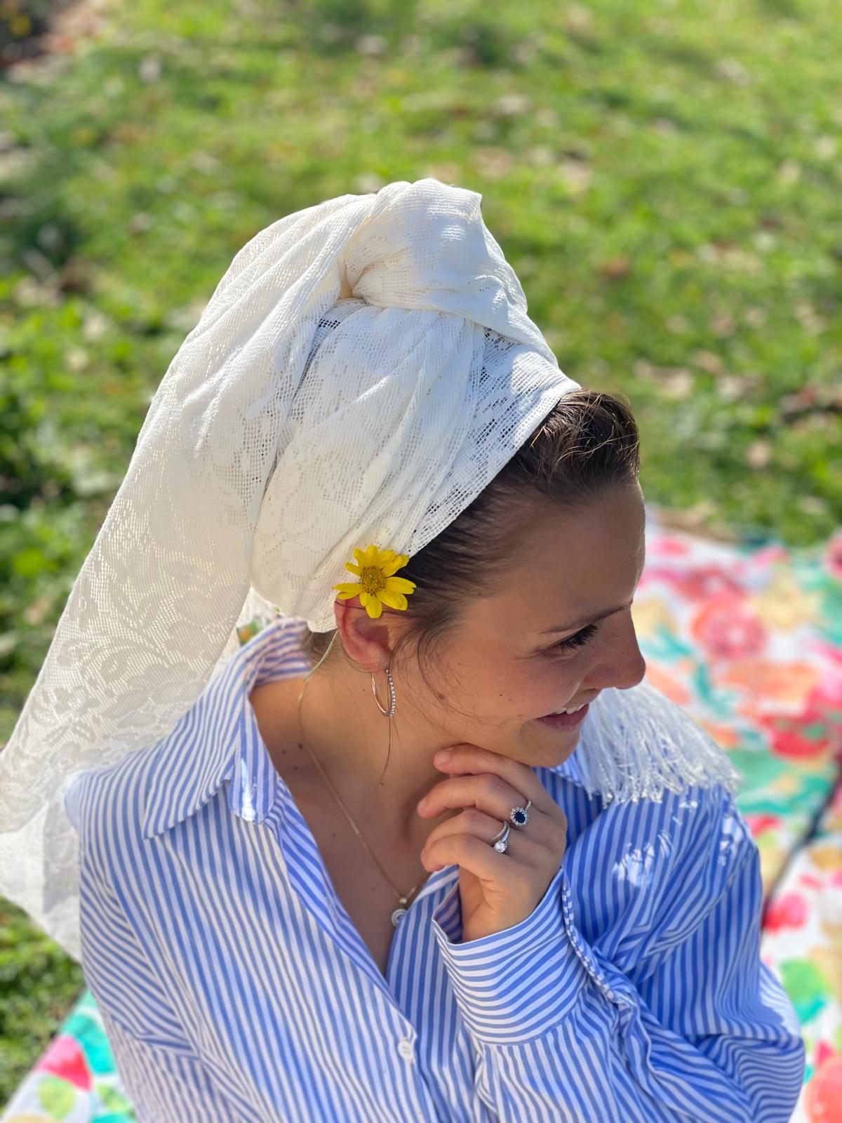 בד תחרה עדין בצבע לבן עם פרנזים תואמים.