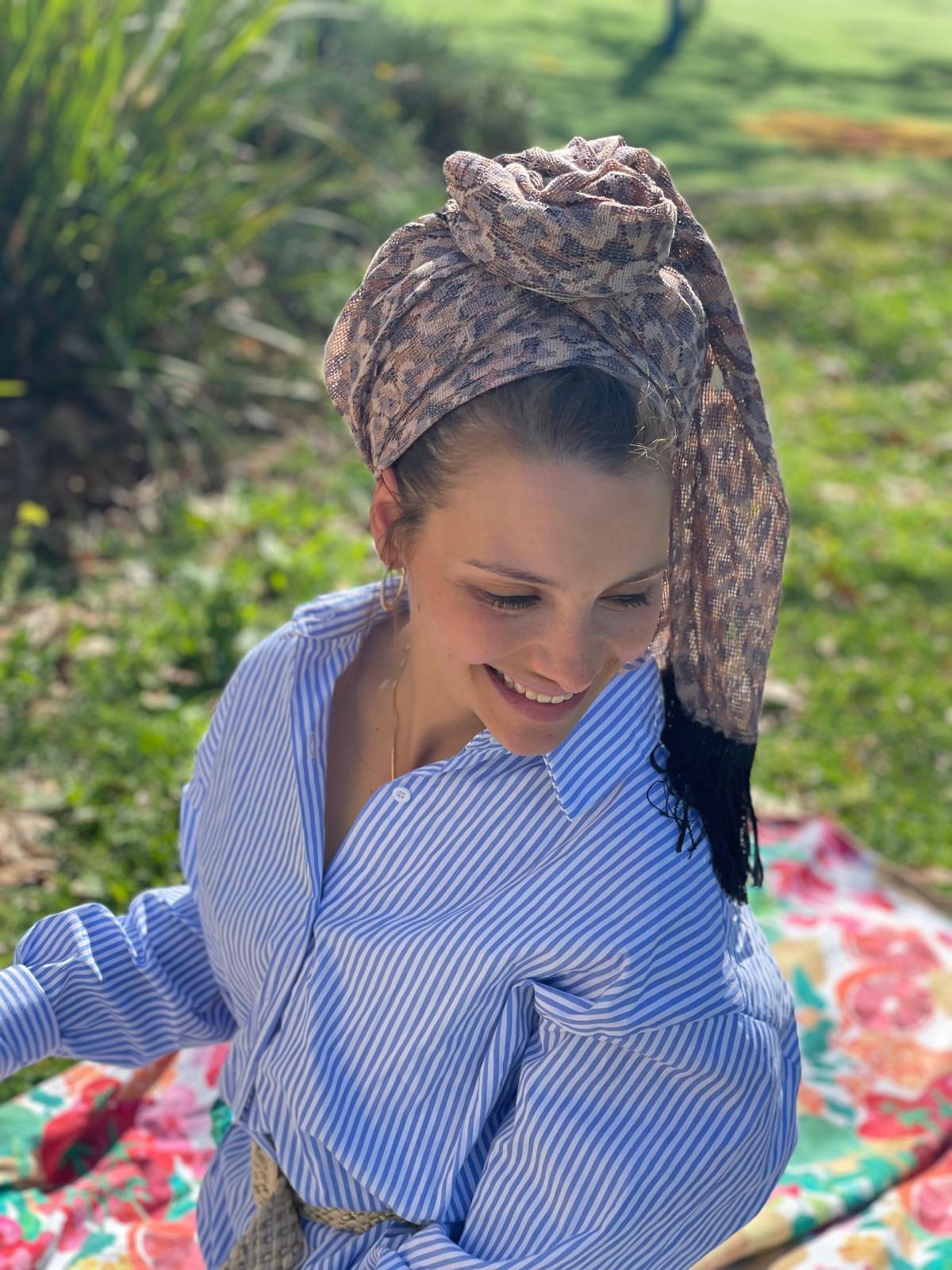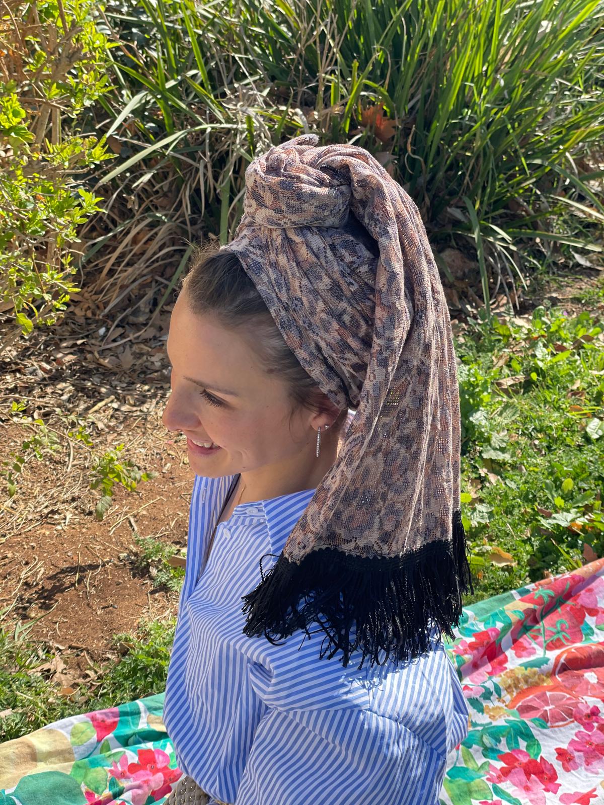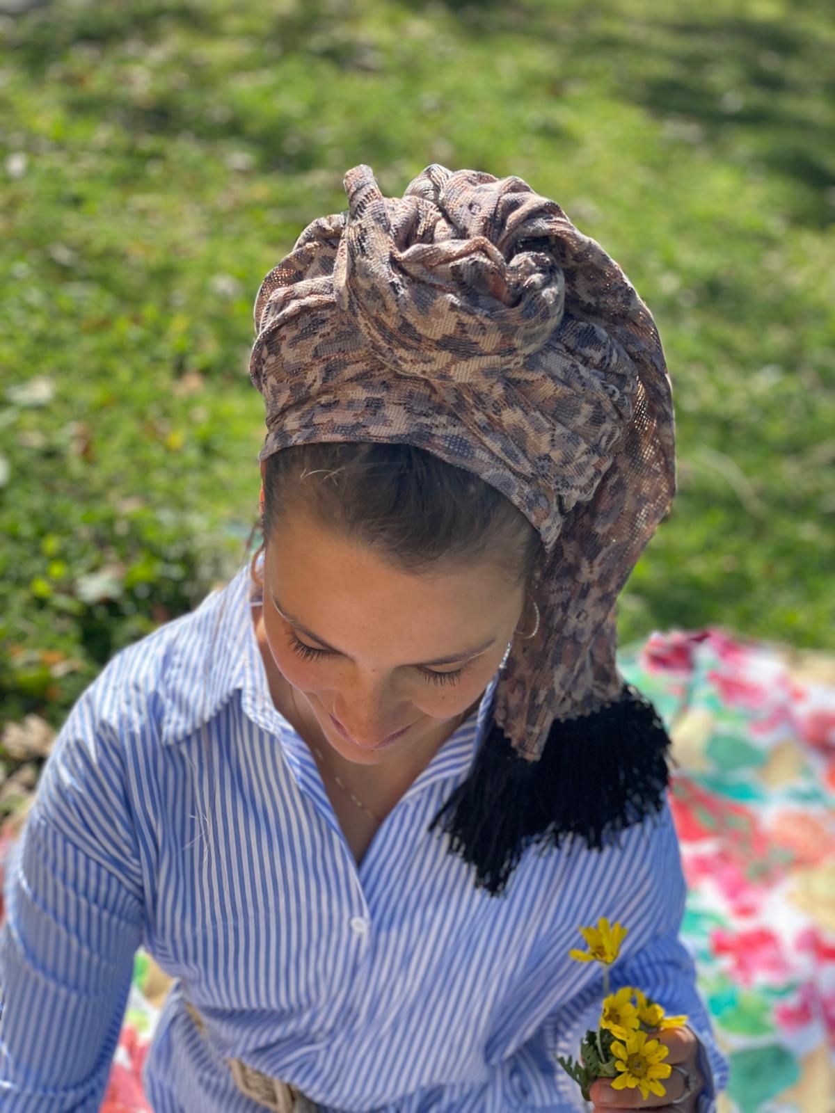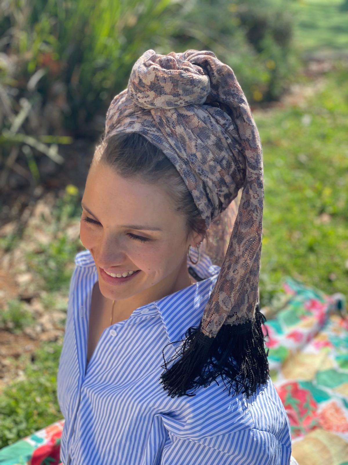 בד תחרה עדין עם הדפס מנומר ופרנזים שחורים.