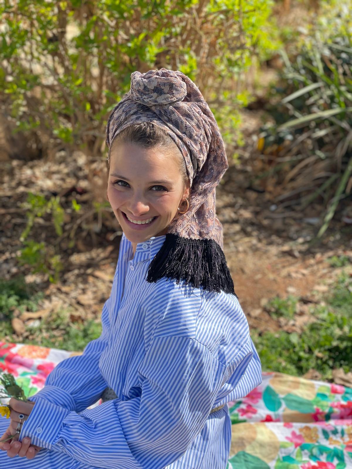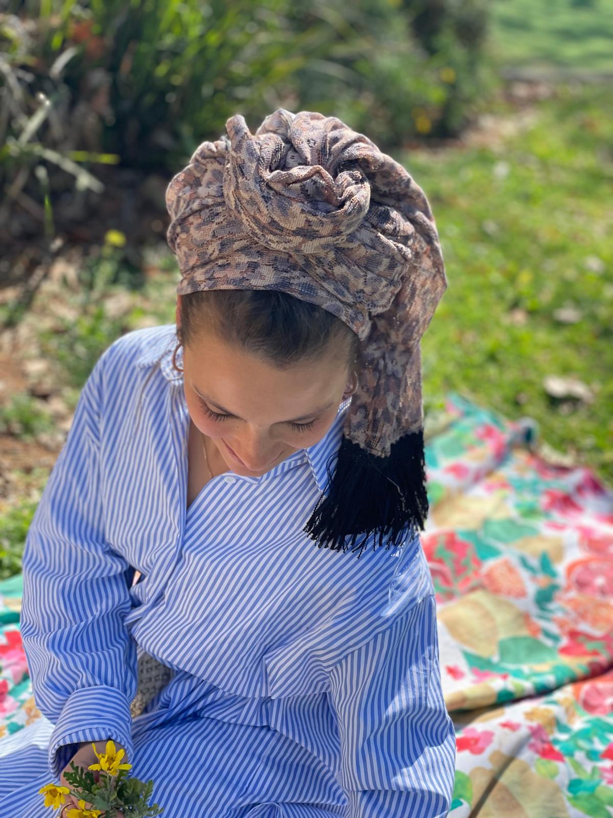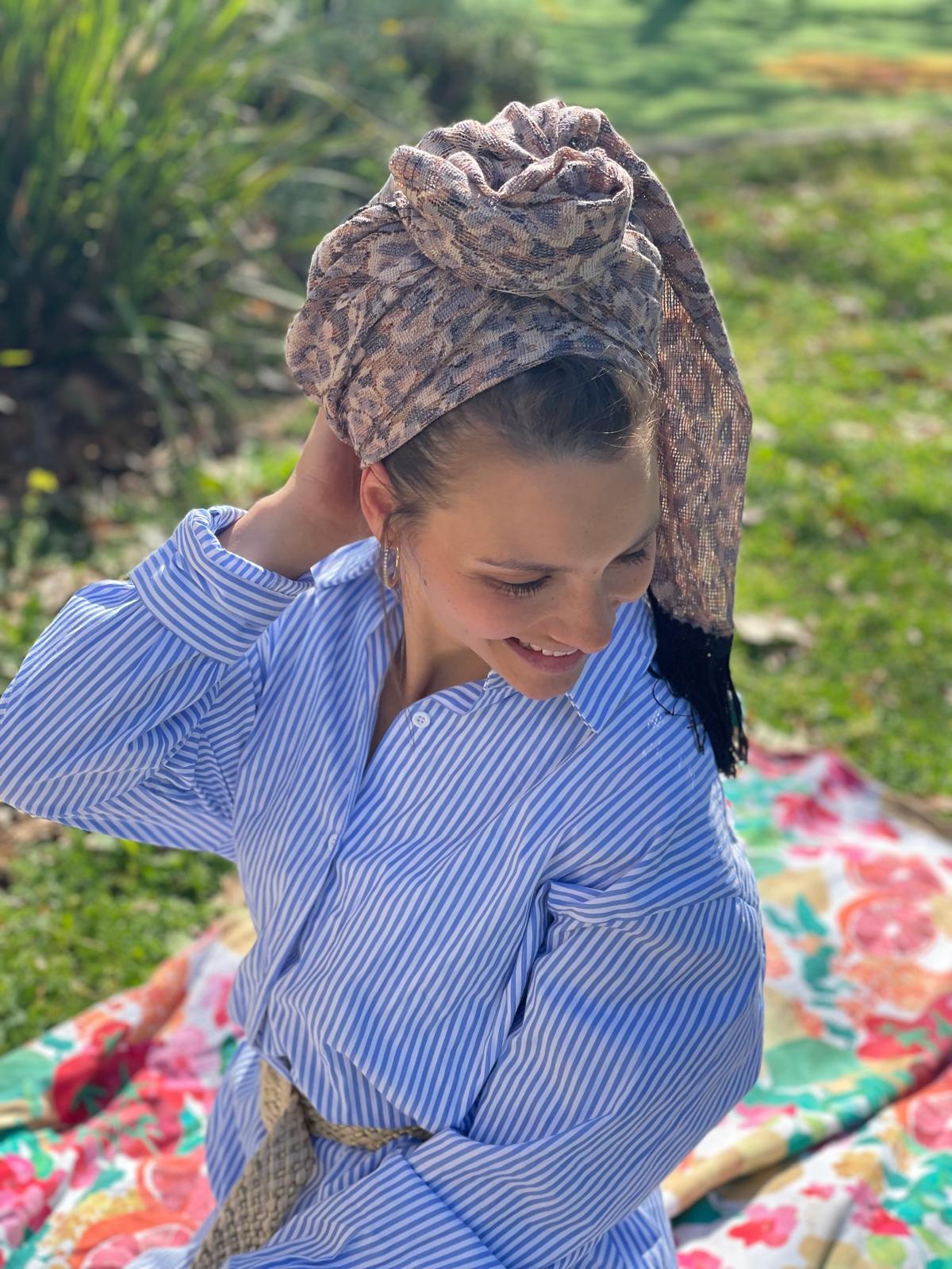 בד תחרה עדין עם הדפס מנומר ופרנזים שחורים.