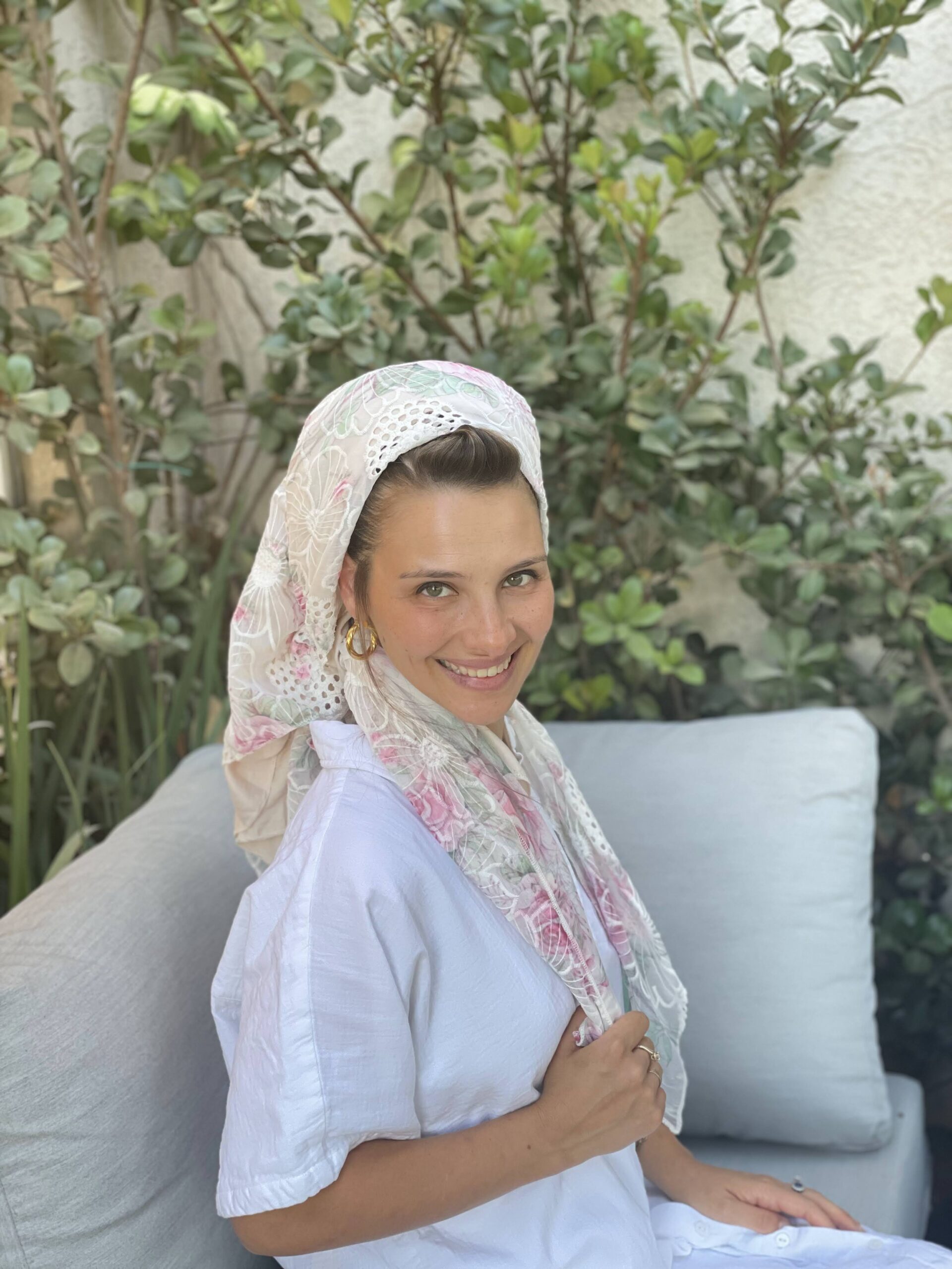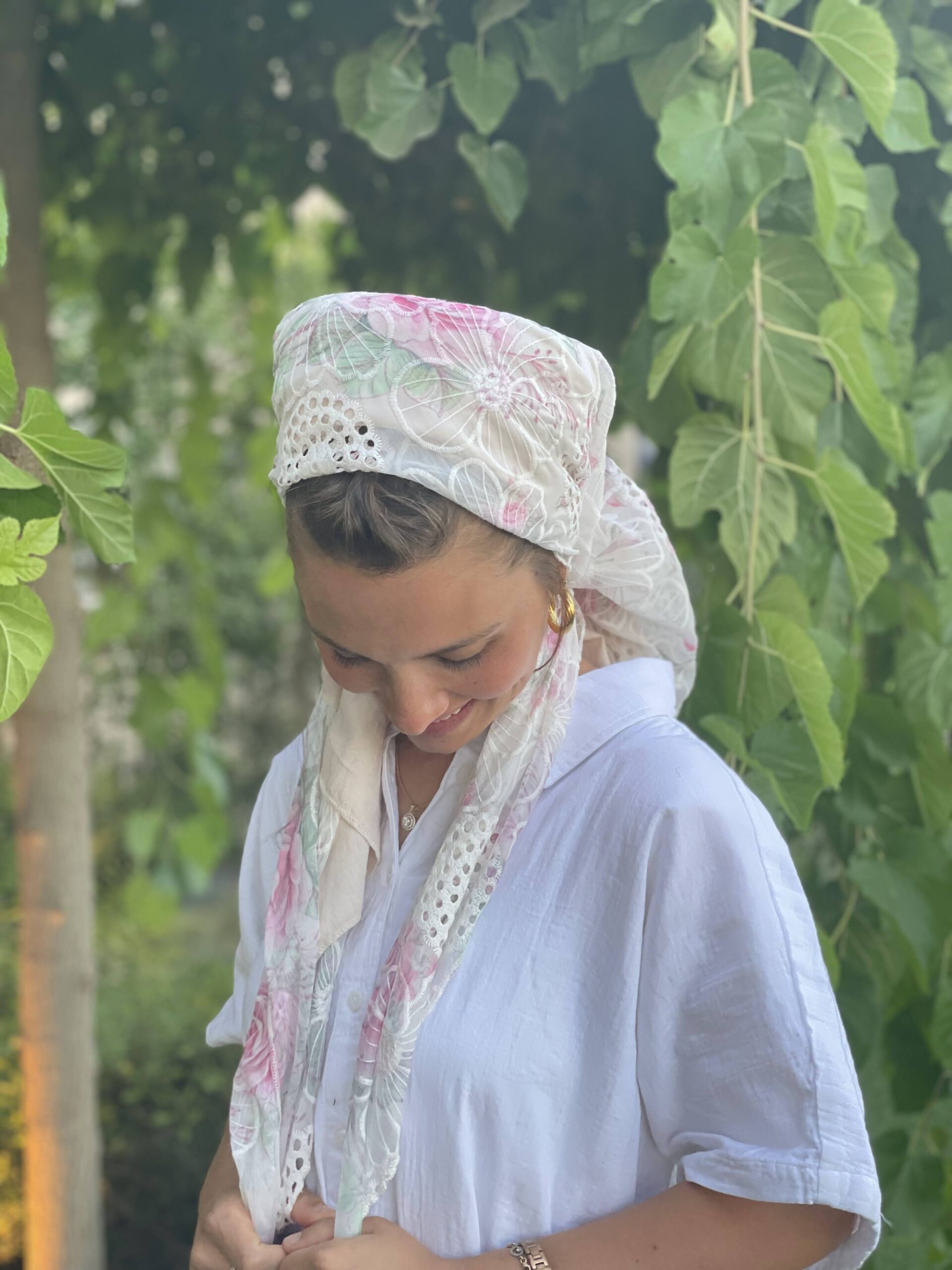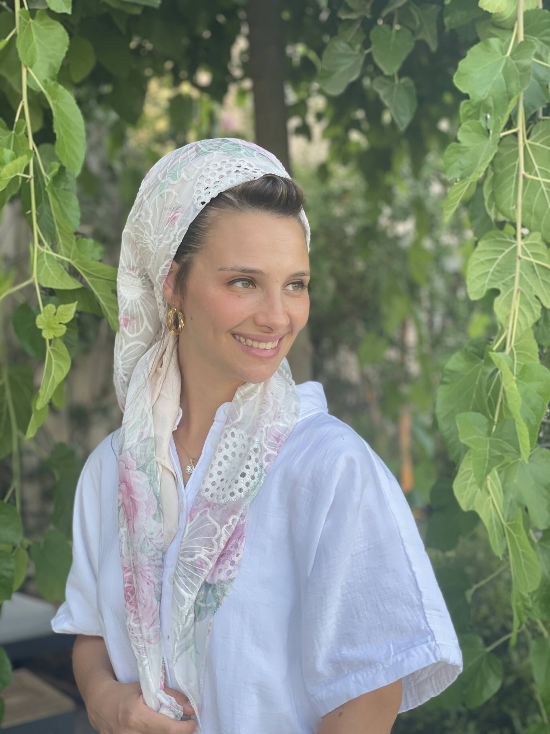 מטפחת תחרה לבנה עם פרחים וורודים עדינים