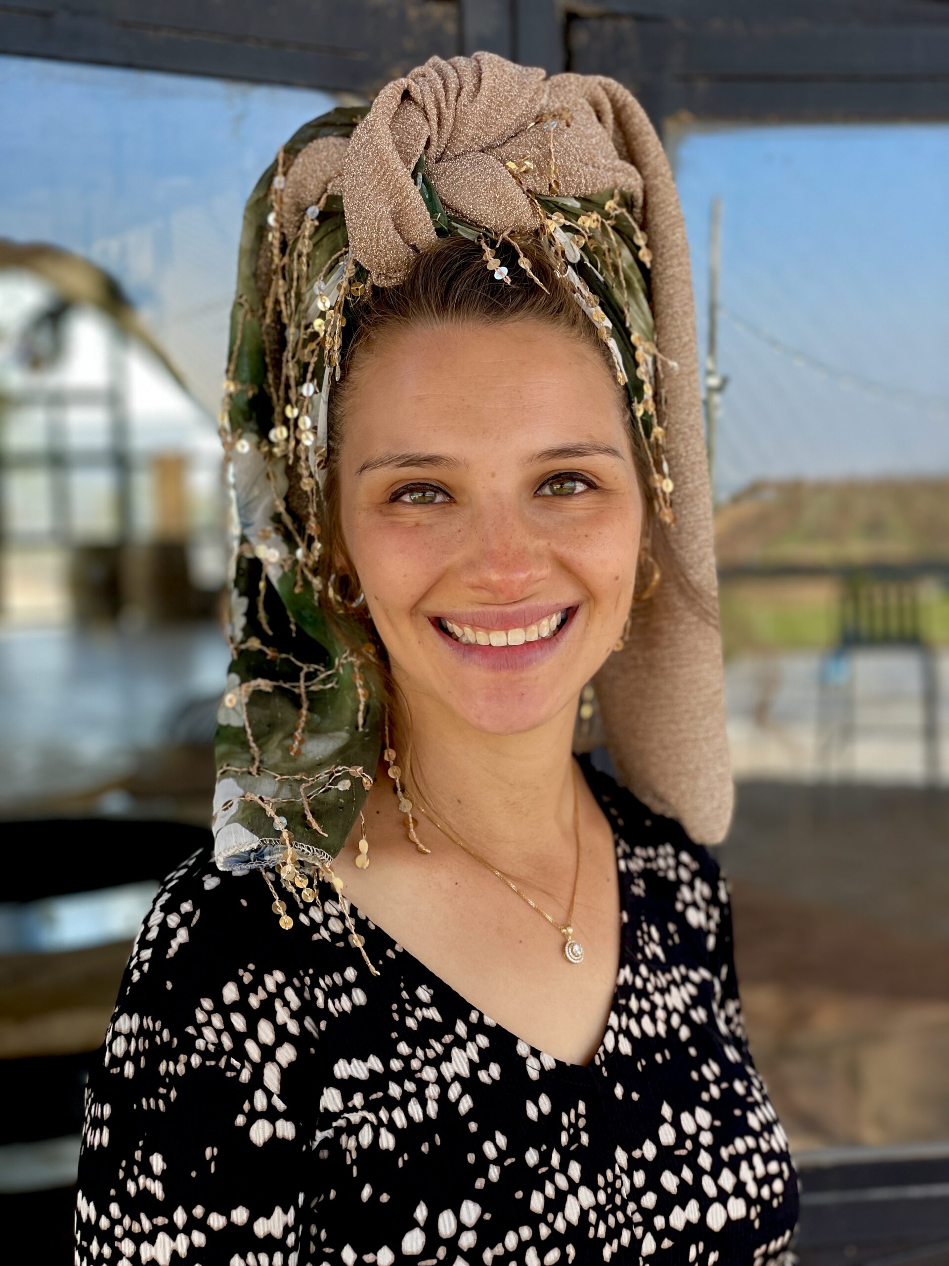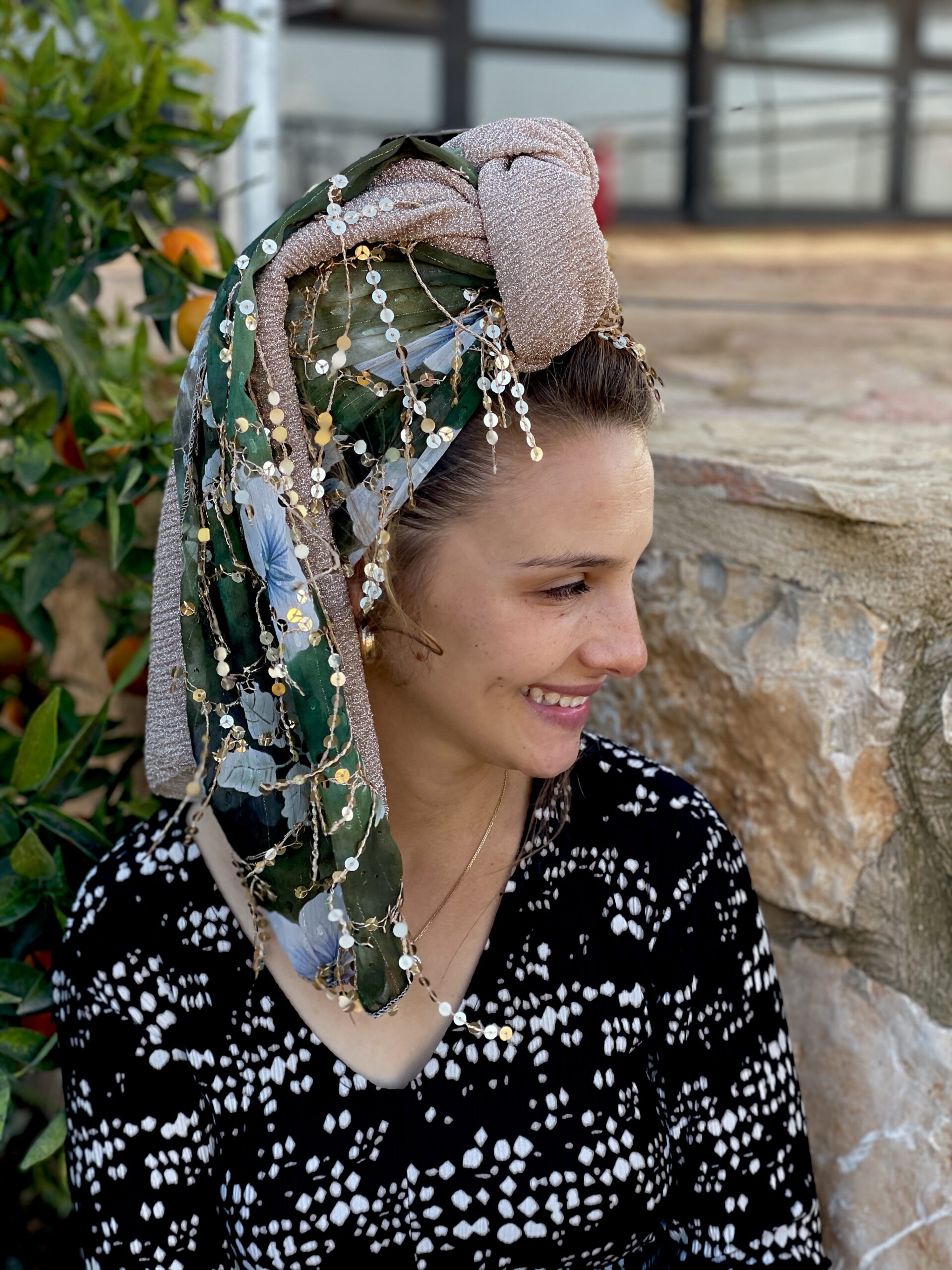 מטפחת פרנזים נופלים עם הדפס פרחים ירוק בשילוב בד מנצנץ זהב