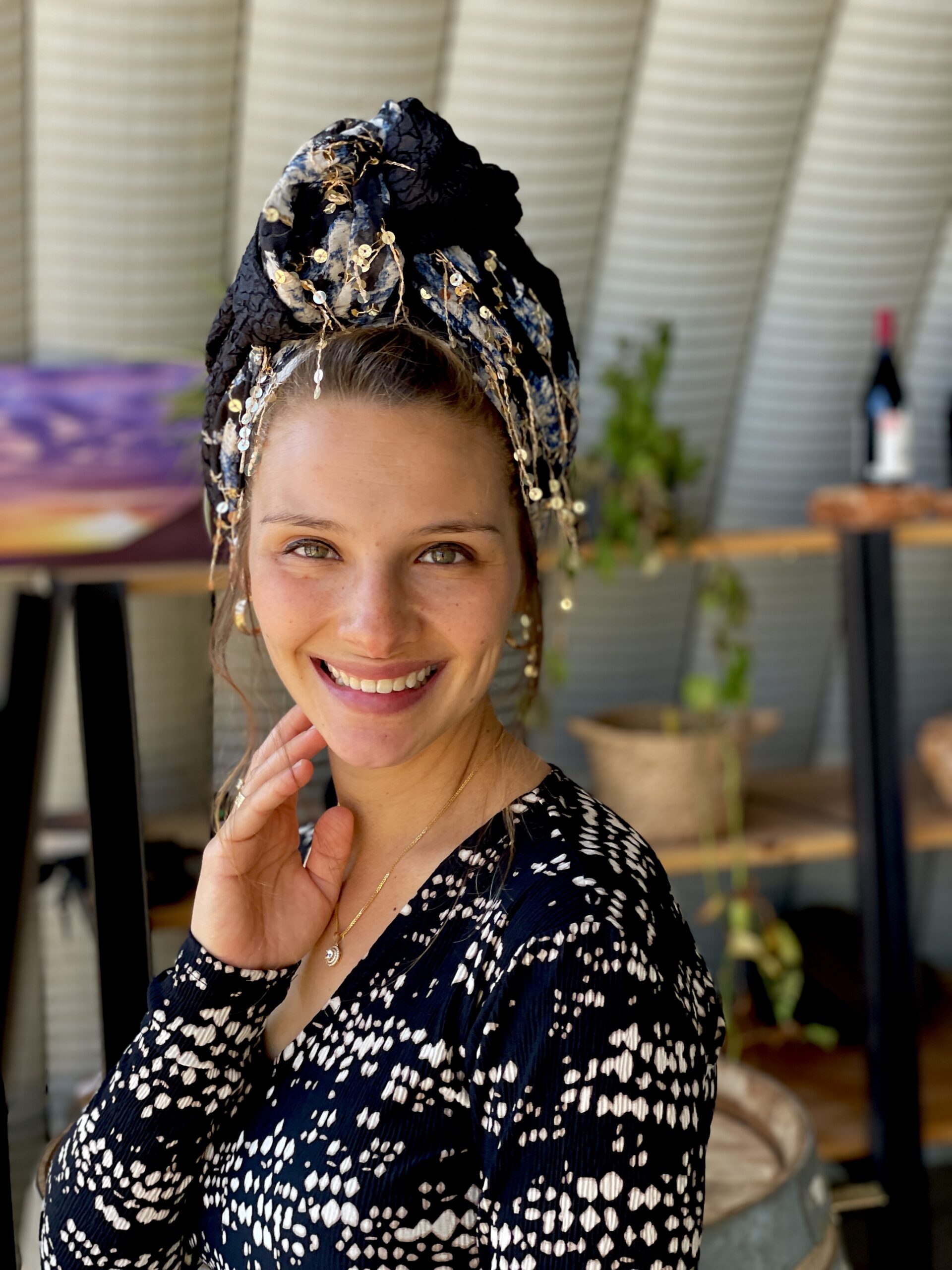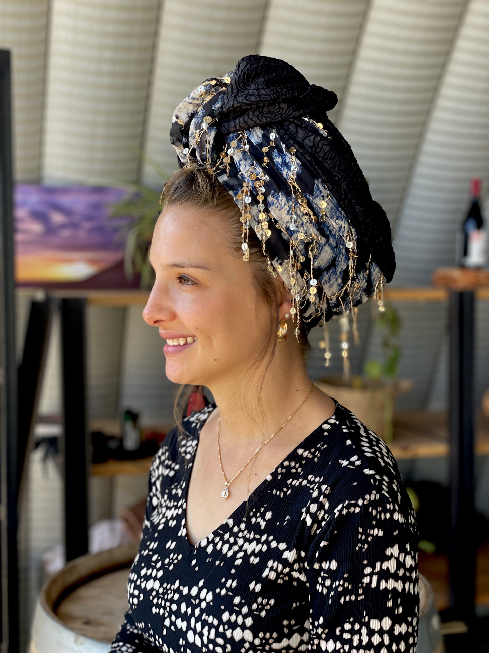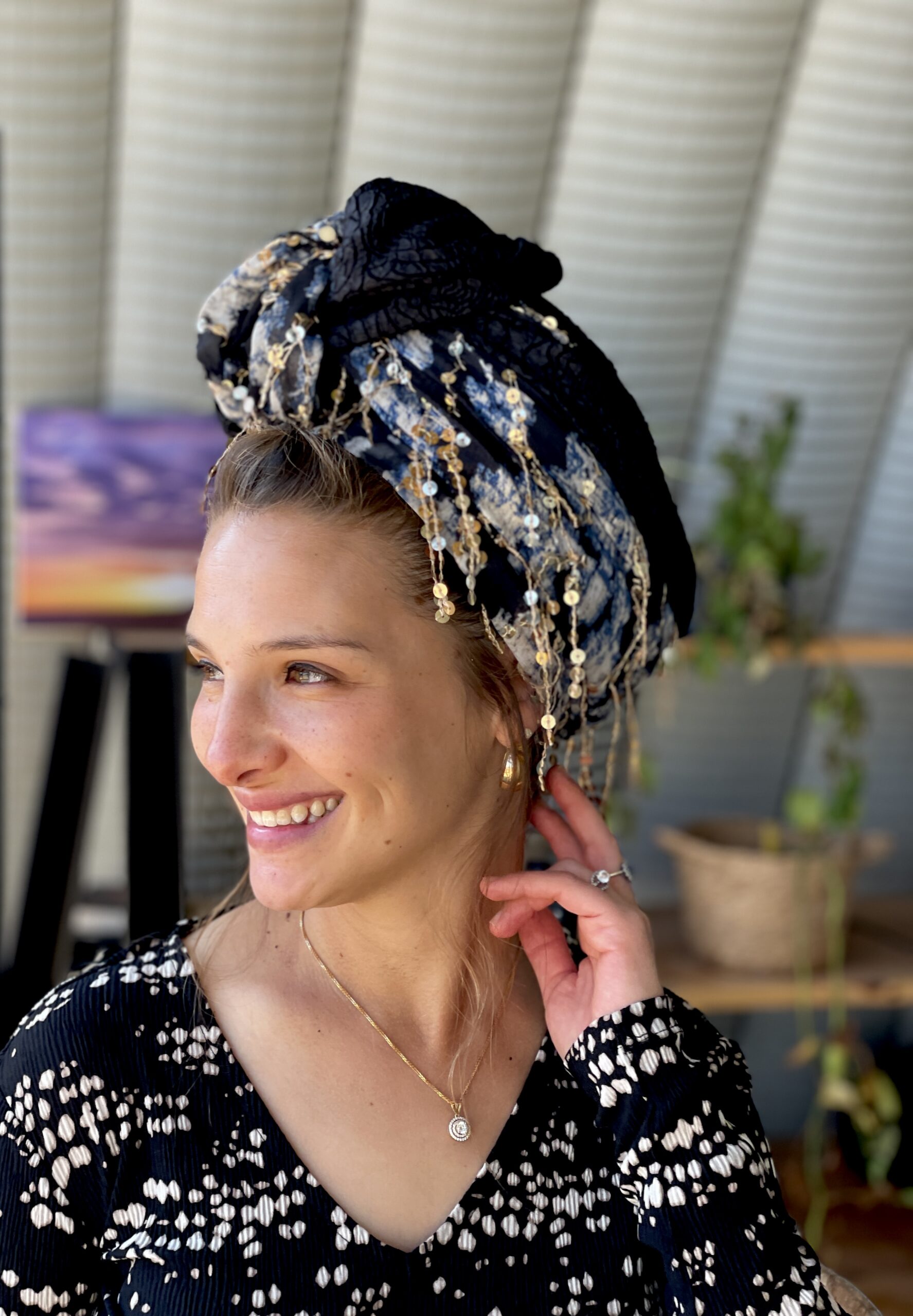 מטפחת פרנזים נופלים עם הדפס שחור כחול בשילוב שחור עם פרחים בולטים מדהימים