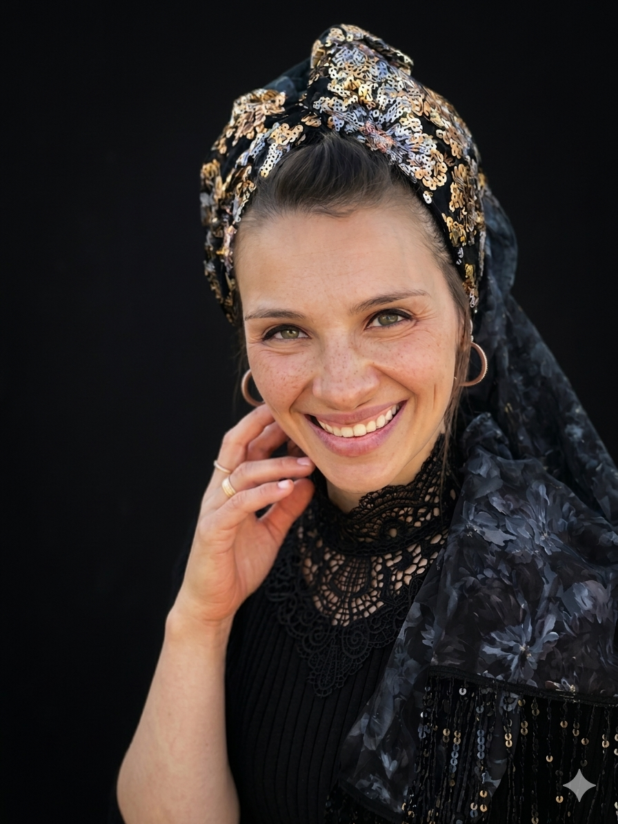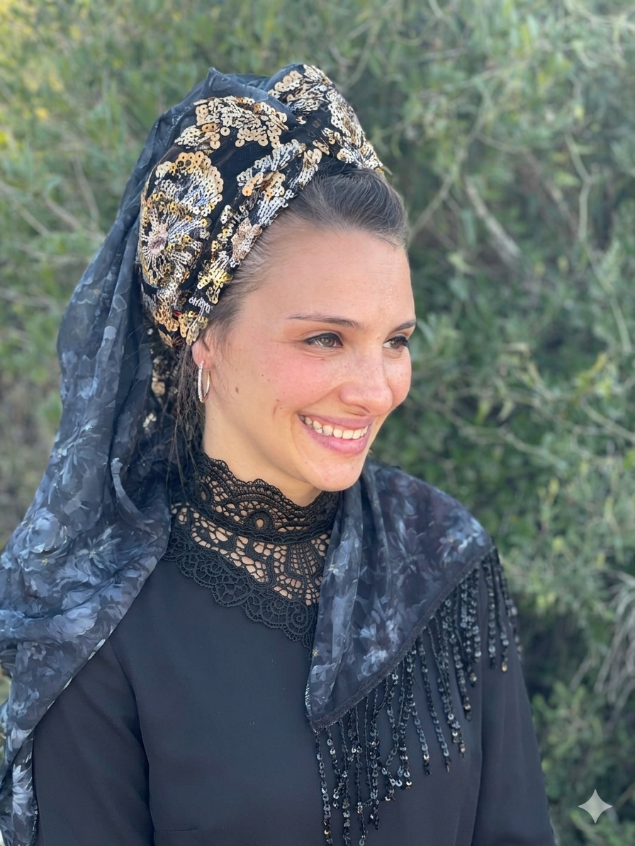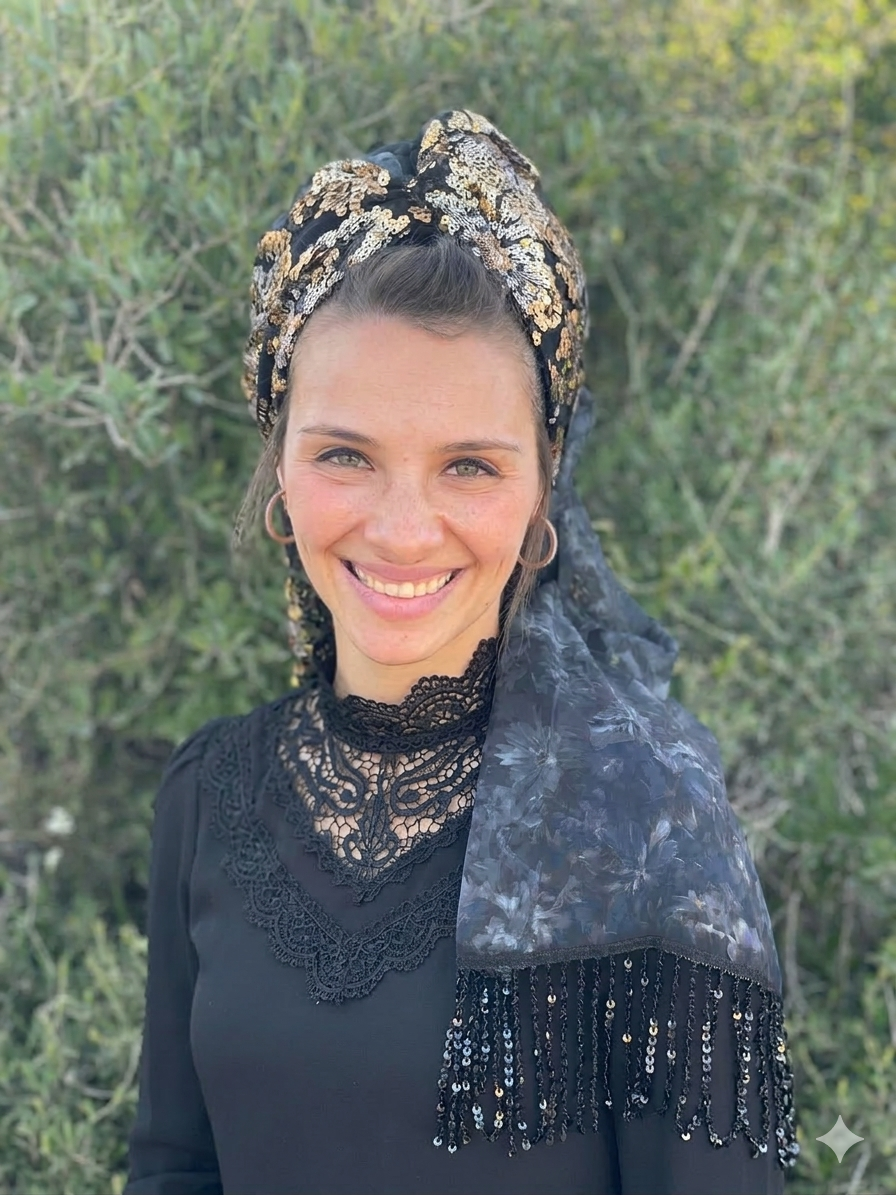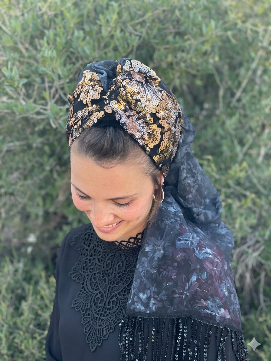 מטפחת פייטים שחור וזהב בשילוב שיפון שחור עם פרחים עדינים ונגיעות זהב, פרנזים שחורים מיוחדים עם פייטים משולבים חרוזים עדינים